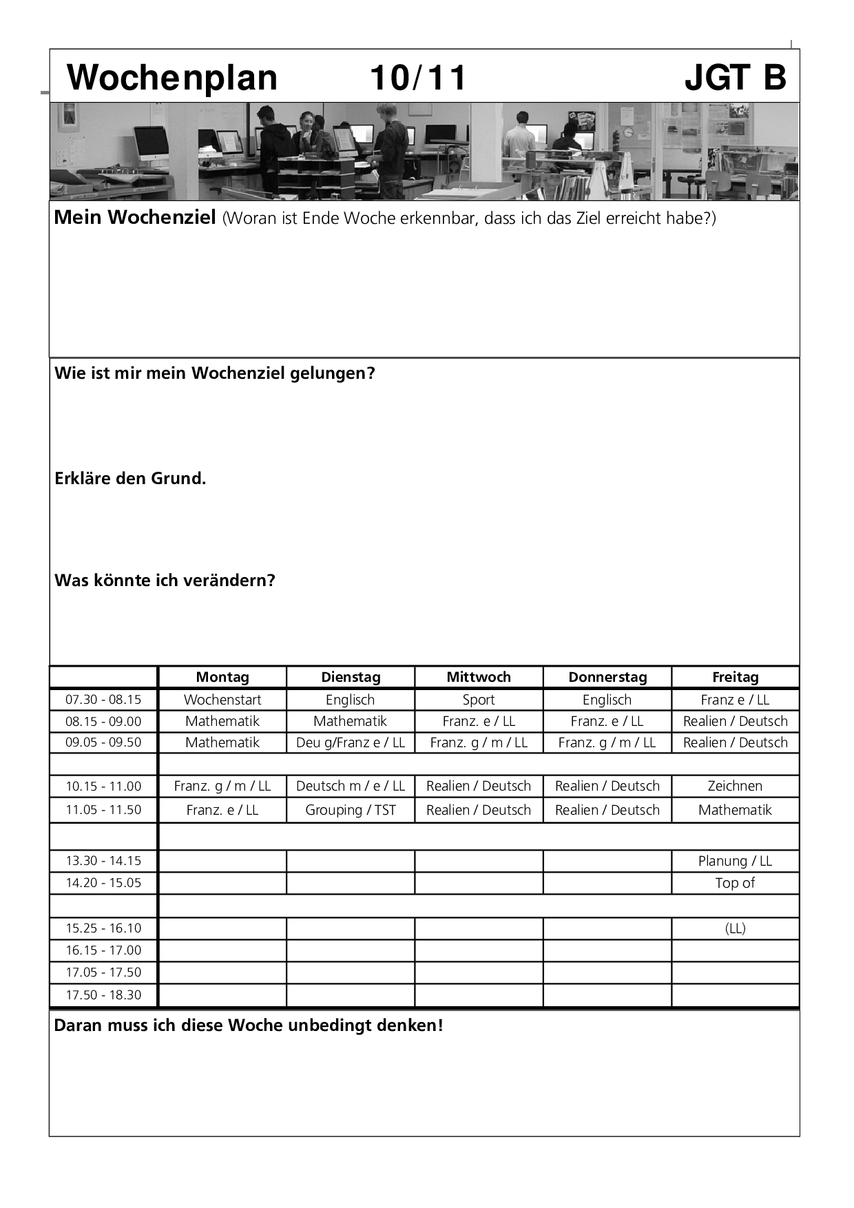 Mit diesem Lerntagebuch können die Schülerinnen und Schüler ihr Woche planen und Ziele setzen, das Erreichte reflektieren und persönliche Erfolge festhalten. Damit wird die Planungskompetenz und das selbständige Lernen gefördert.