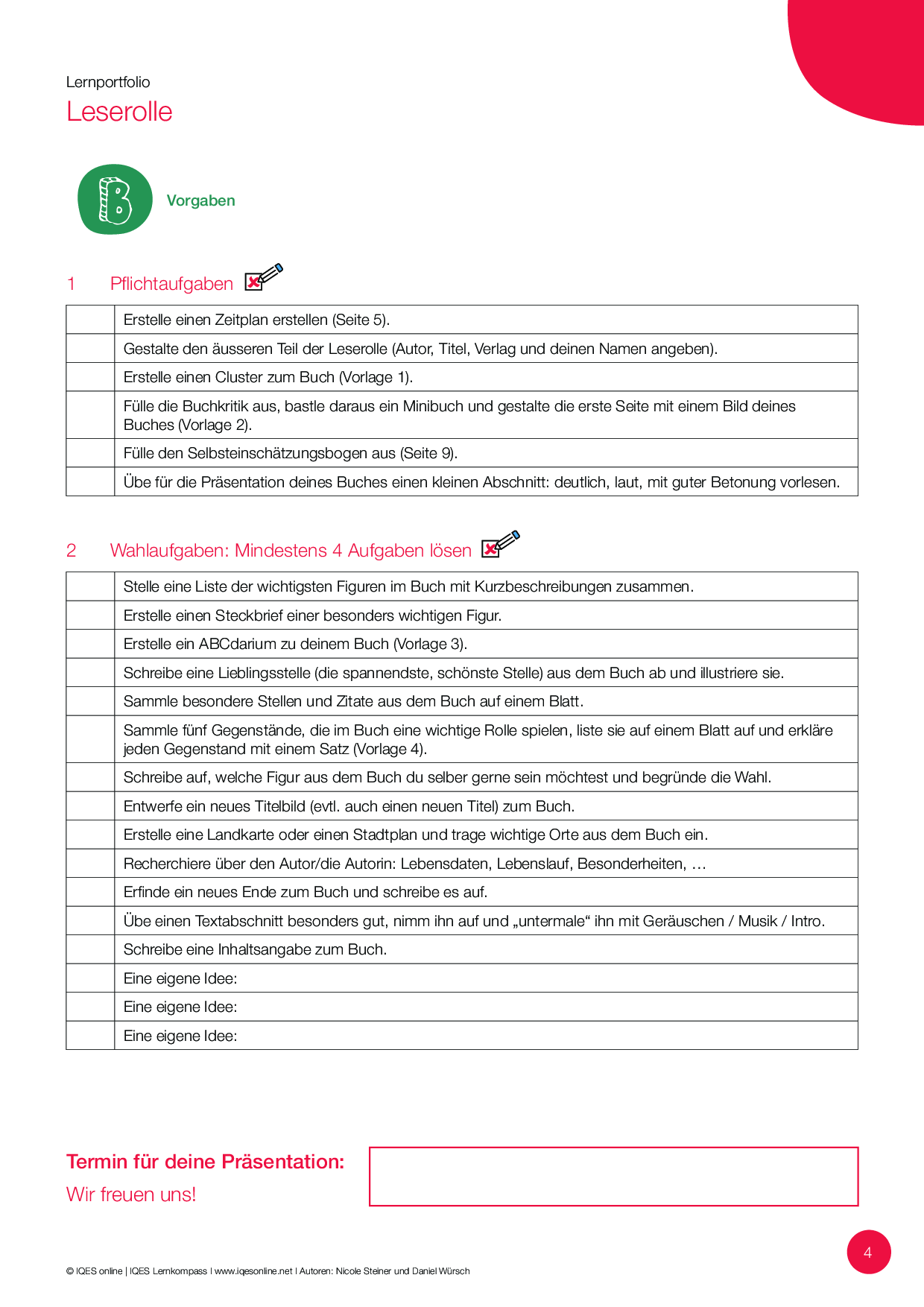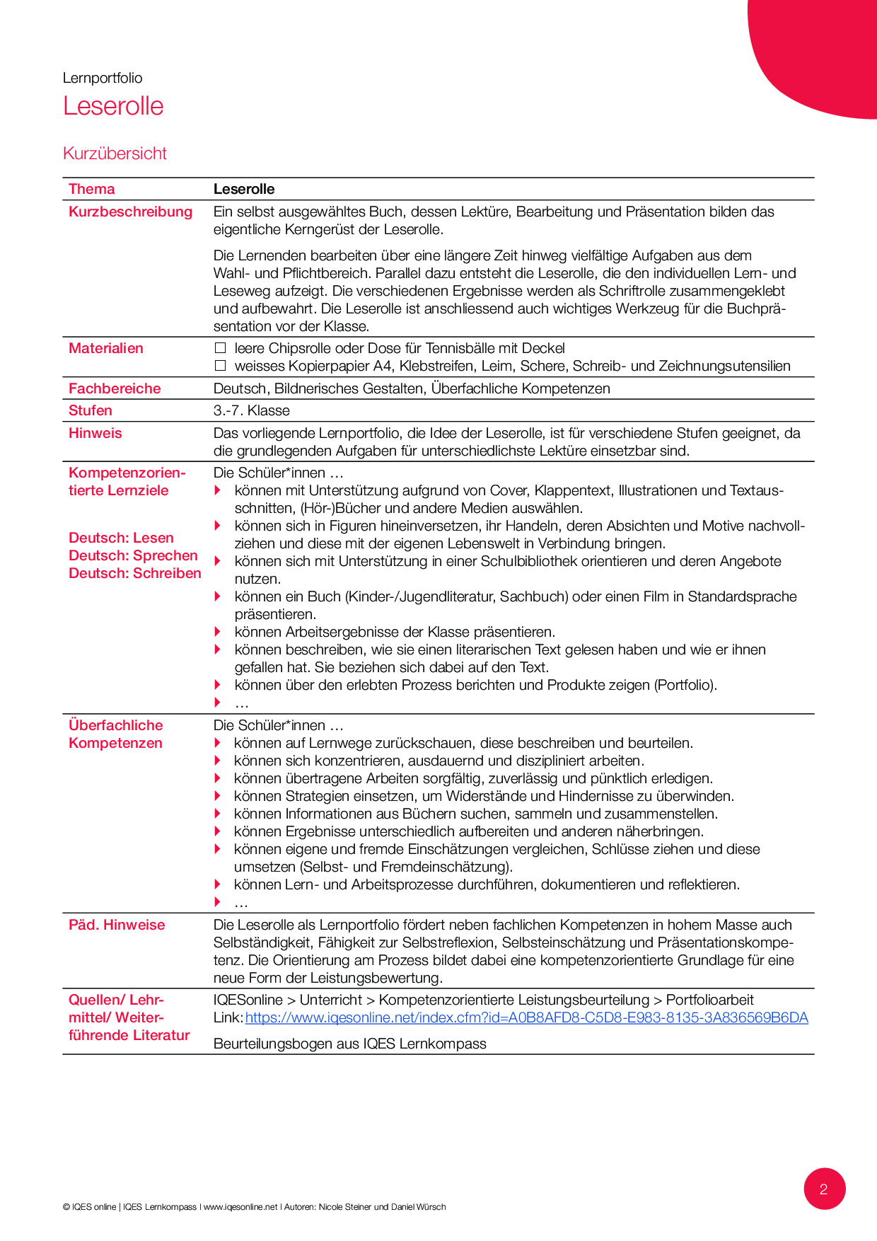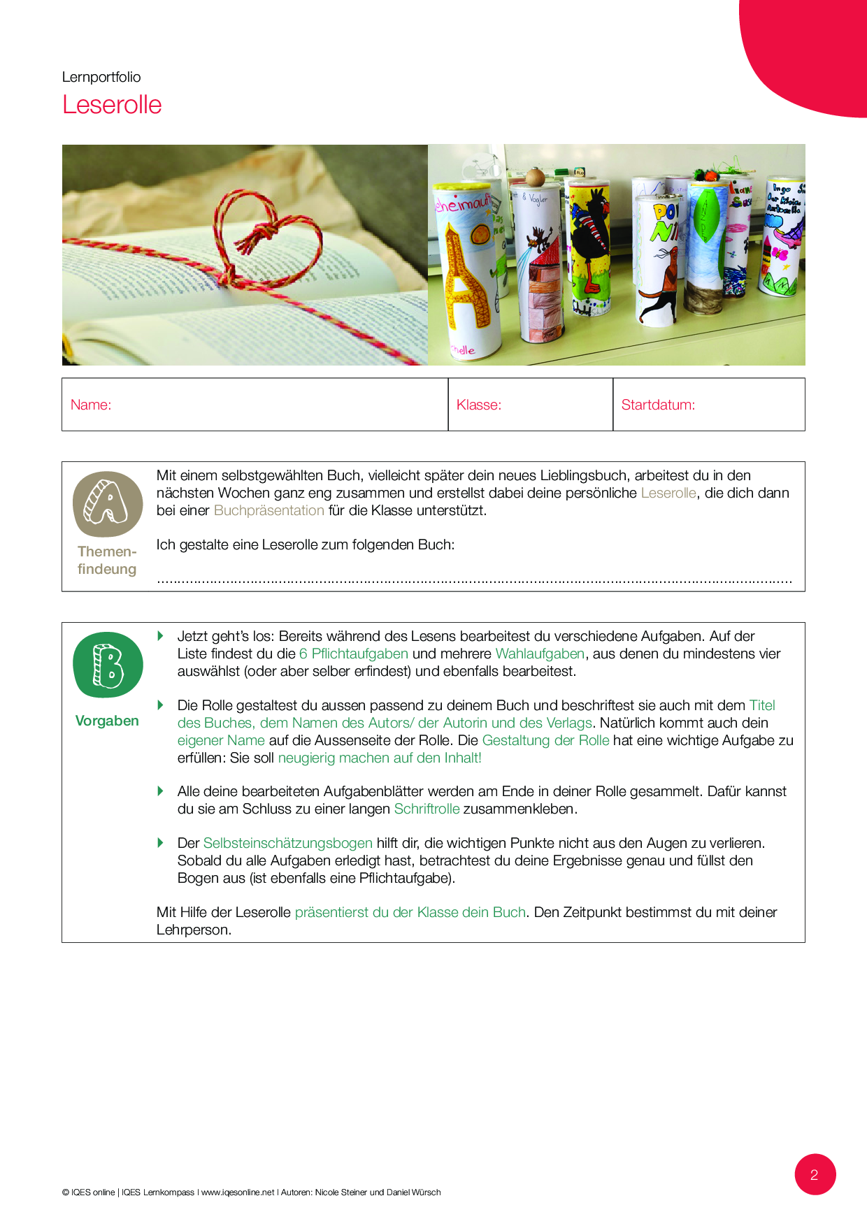 Die Leserolle als Lernportfolio gesteht nicht nur dem Lesen eine wichtige Rolle zu. Sie ermöglicht auch das Training einer Vielzahl von Kompetenzen, indem die Lernenden die Ergebnisse einer längeren, individuellen Auseinandersetzung mit einem selbstgewählten Buch dokumentieren, Ergebnis und Lernprozess bewerten und ihr Buch anhand der Leserolle der Klasse präsentieren.