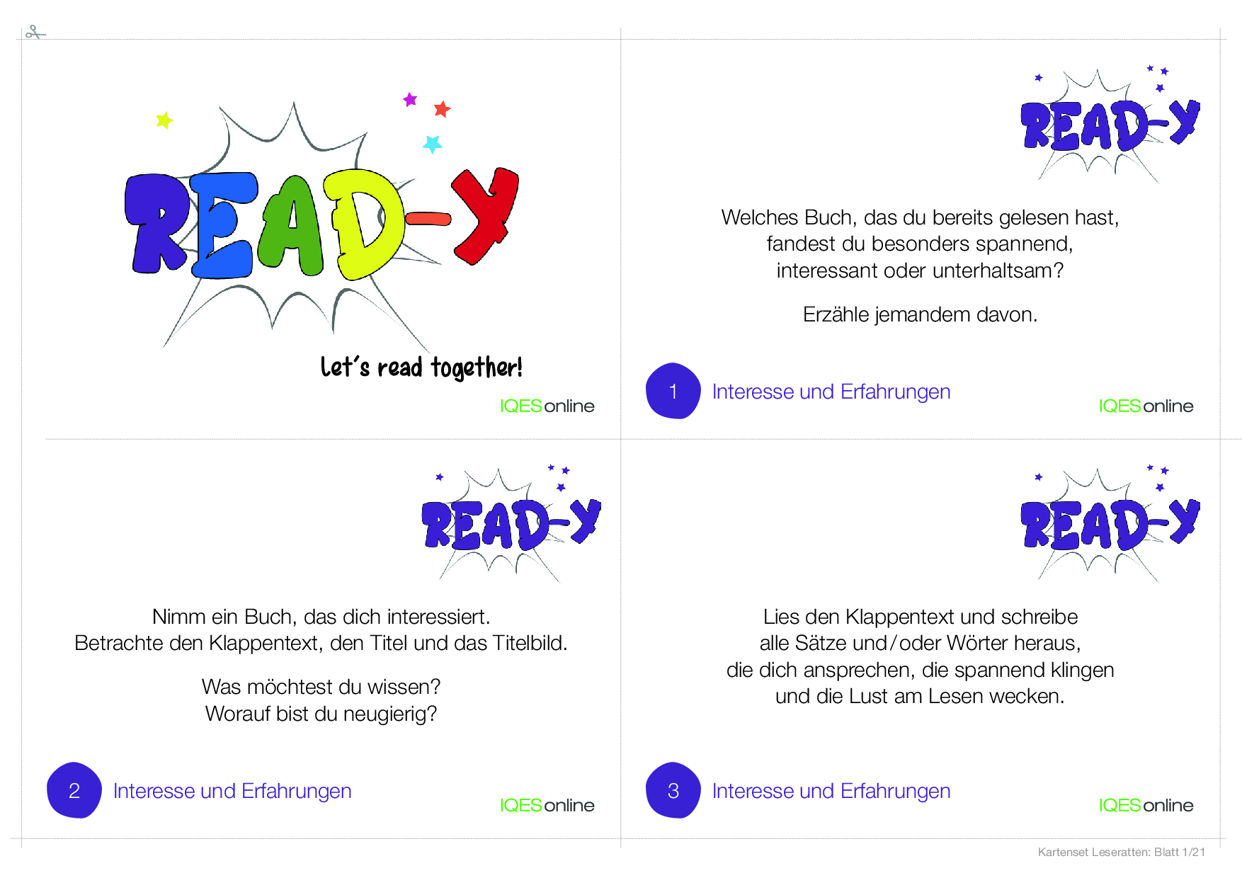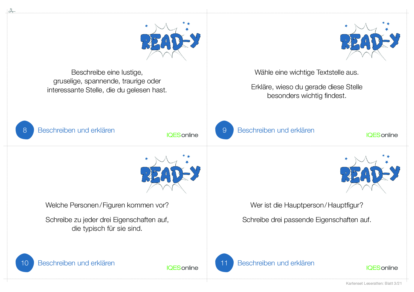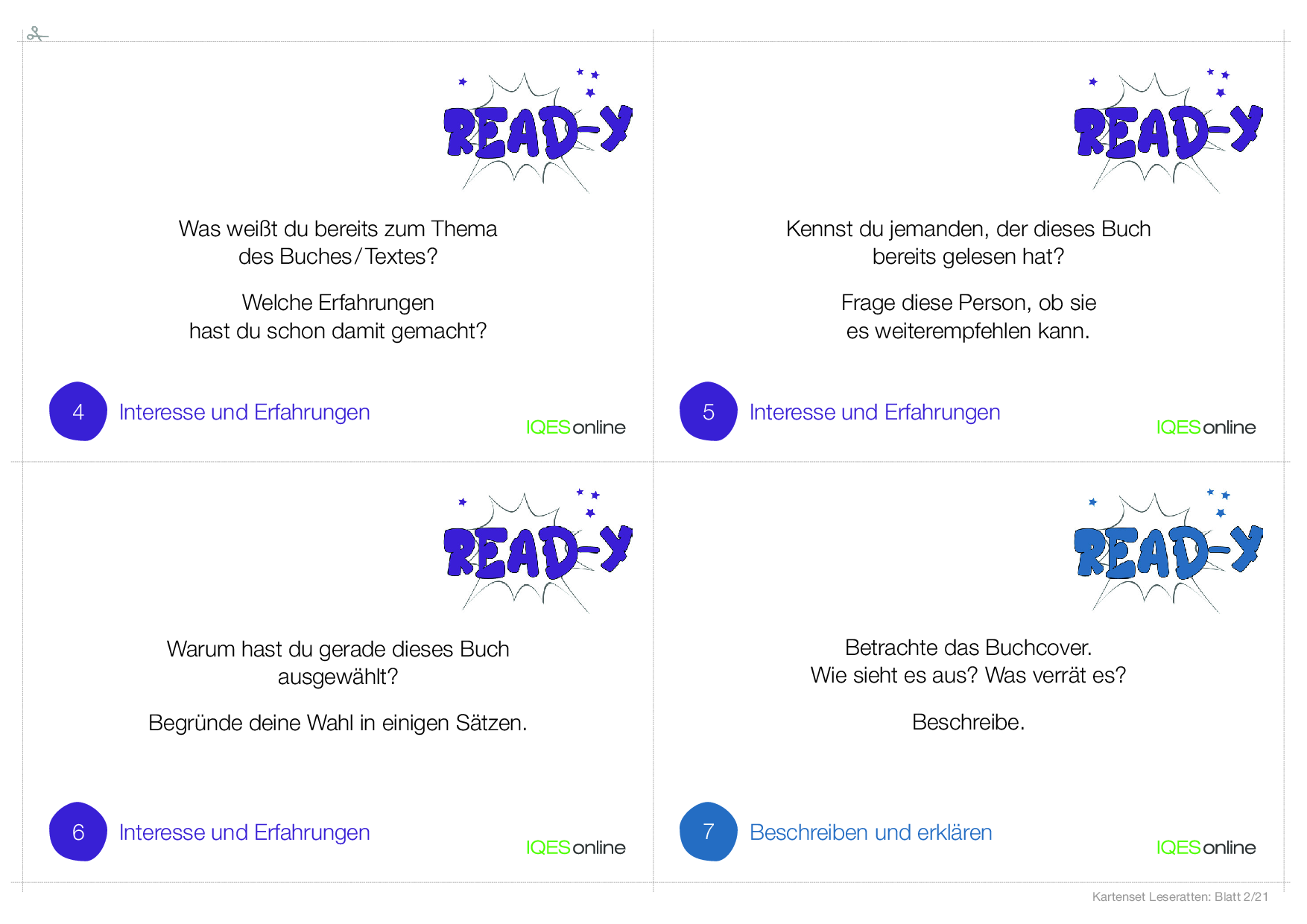 Das Kartenset für Jugendliche ermöglicht den Schüler:innen durch eine große Auswahl an motivierenden Fragen und Aufgabenstellungen neue Sichtweisen auf gelesene Texte: in Texte eintauchen und sie verstehen wollen, über Gelesenes nachdenken und sich miteinander darüber austauschen, Inhalte vernetzen und in eigener, kreativer Weise weiterentwickeln. So entsteht Lesemotivation als Schlüssel zu nachhaltiger Lesekompetenz. Lernende gehen zunehmend eigenständiger, auch von ihren persönlichen Interessen geleitet, neugierig und motiviert an Texte heran, sodass diese in unterschiedlichsten Formaten fester Bestandteil ihres Alltags werden. Die Karten sind in sieben Kompetenzstufen / Kompetenzbereiche gegliedert, die den Fokus auf verschiedene Verarbeitungsvariationen gelesener Texte legen. Sie verknüpfen zudem spielerisch die Schlüsselkompetenzen Lesen, Hören, Sprechen und Schreiben.