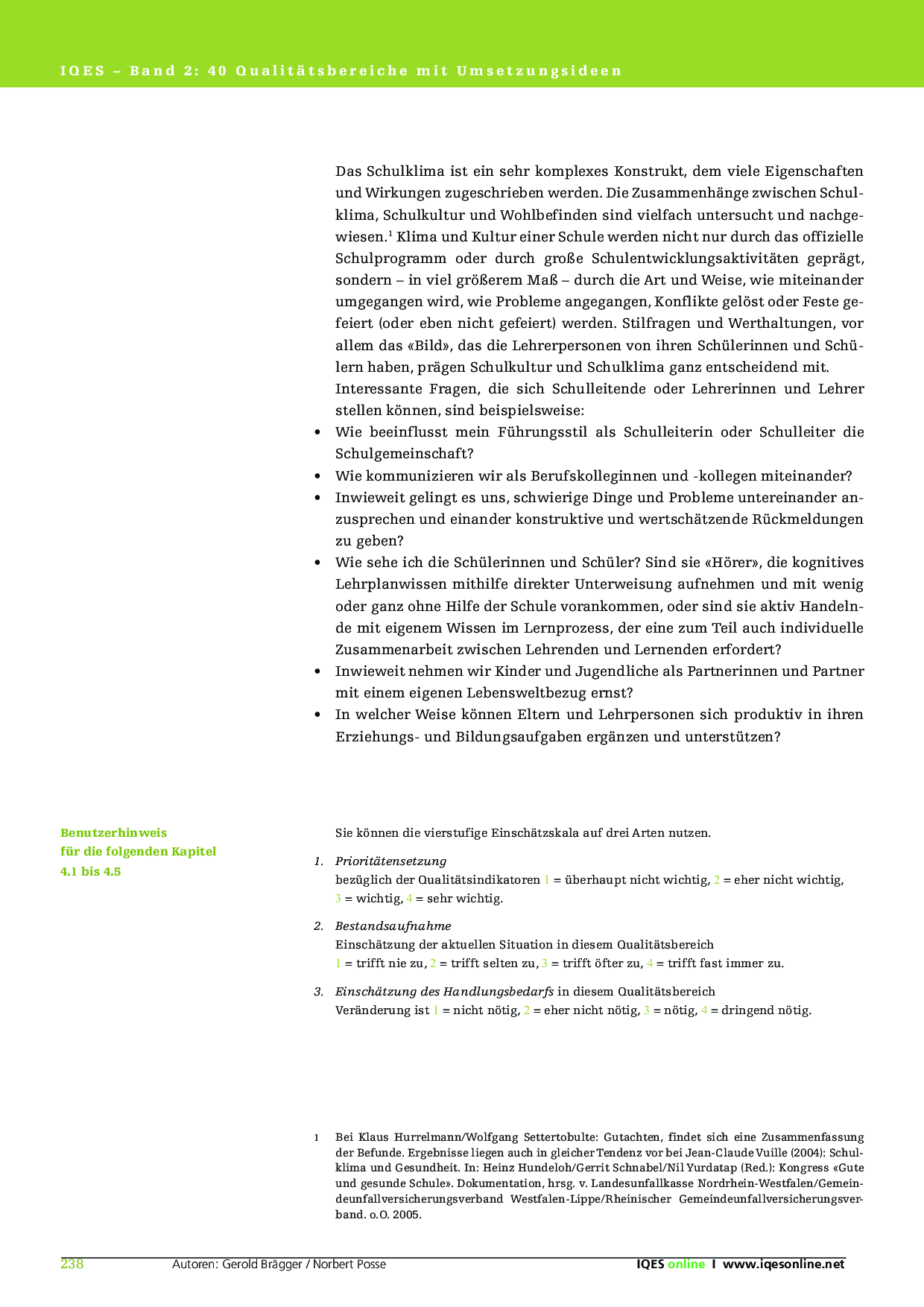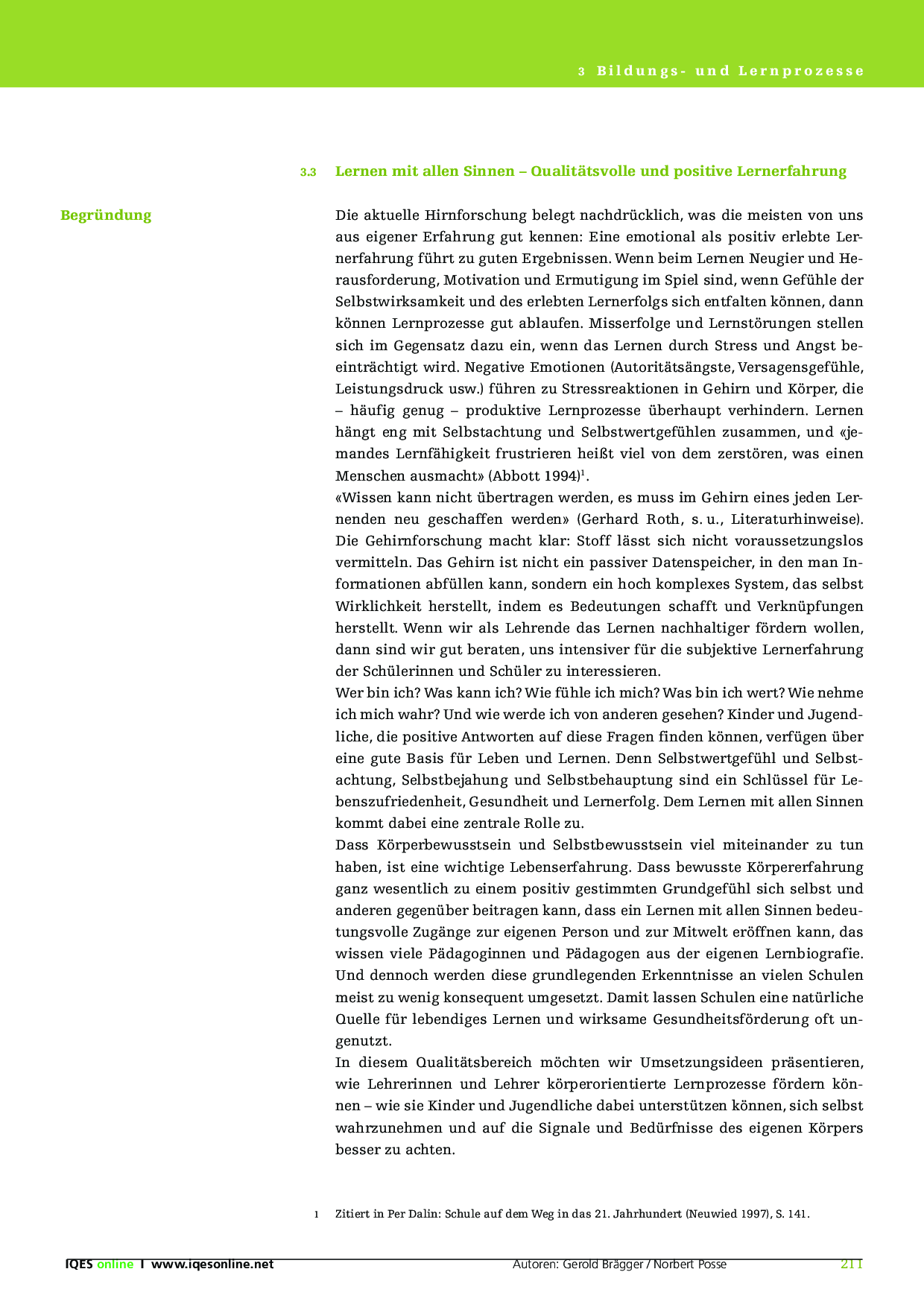 In diesem Auszug von Bewegung und Lernen, Konzept und Praxis Bewegter Schulen werden die ineinander übergreifenden Handlungsfelder einer Bewegten Schule beschrieben. Dabei werden einfach anzuwendende Praxis-Tipps aufgezählt, wie diese Art des Unterrichtens in den Schulalltag aufgenommen werden kann. Ausserdem wird ein Fragepool zur Evaluation des Standards der Schule in Bezug auf Bewegung zur Verfügung gestellt.