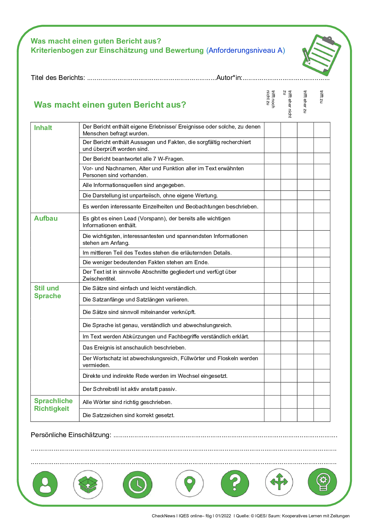 Kriterienbogen Niveau A der Lernumgebung »Berichte kritisch lesen«.