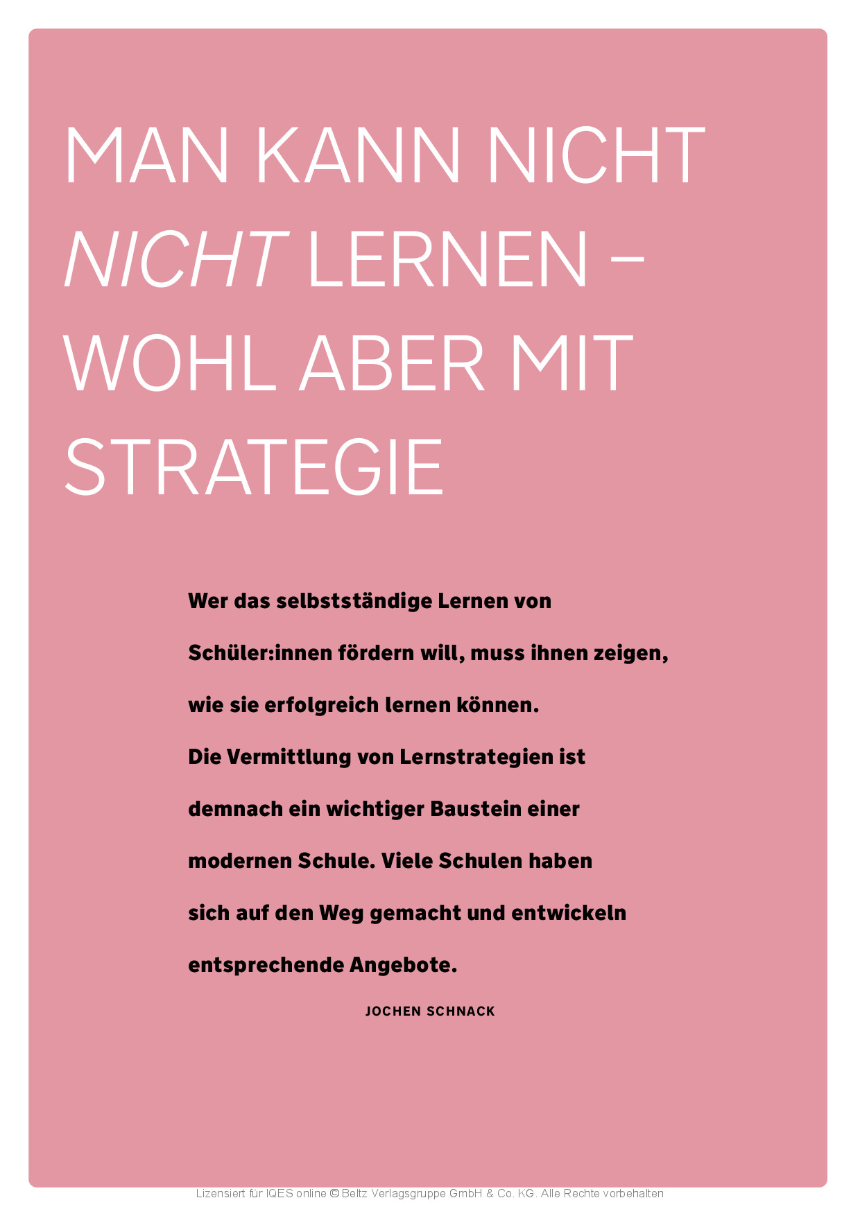 Wer das selbstständige Lernen von Schüler:innen fördern will, muss ihnen zeigen, wie sie erfolgreich lernen können. Die Vermittlung von Lernstrategien ist demnach ein wichtiger Baustein einer modernen Schule. Viele Schulen haben sich auf den Weg gemacht und entwickeln entsprechende Angebote.