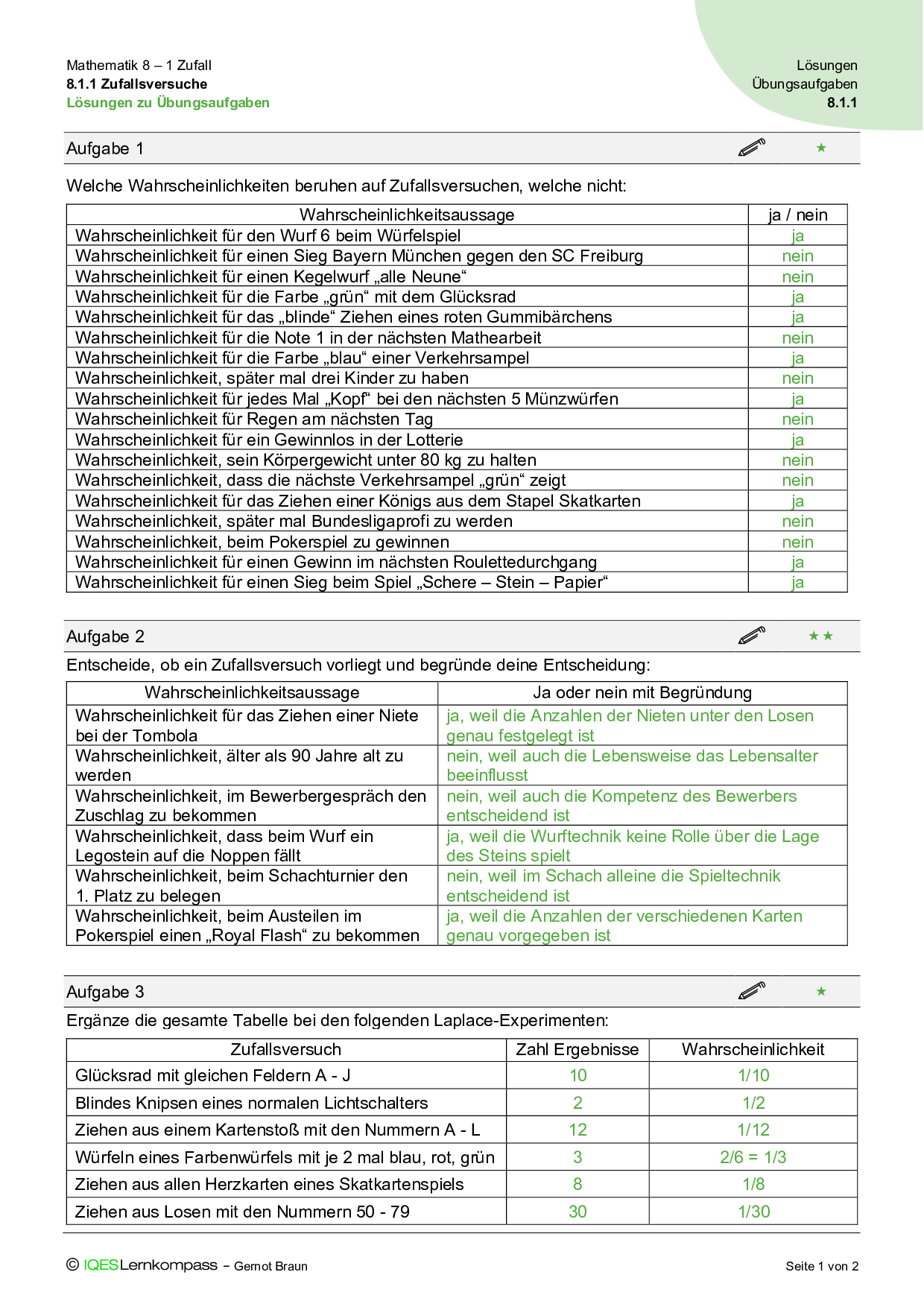 8.1.1 Zufallsversuche – Übungsaufgaben mit Lösungen