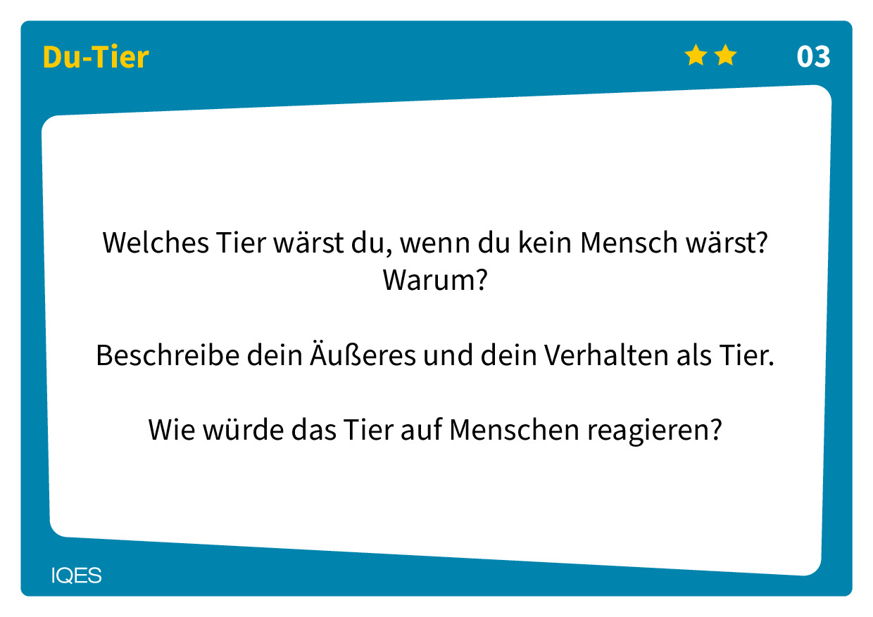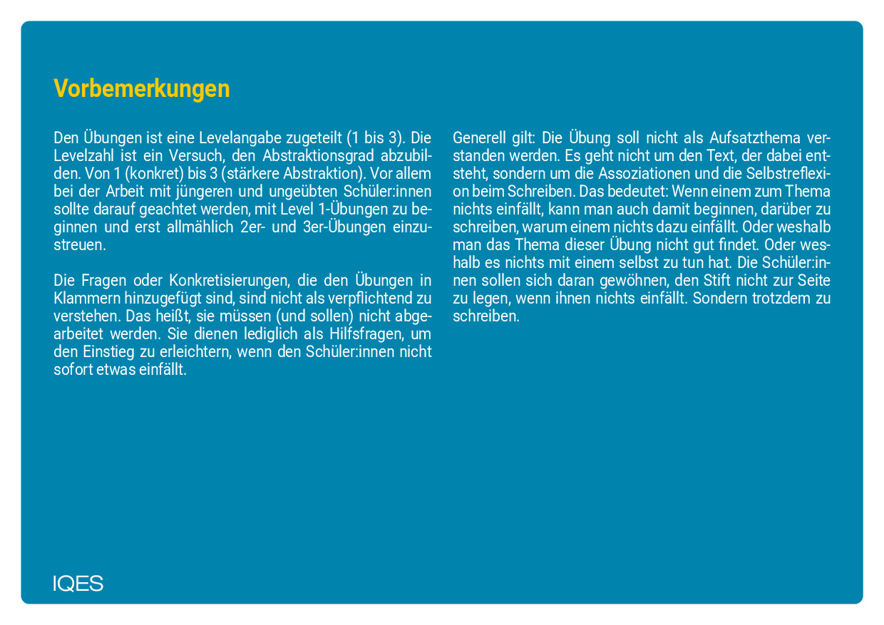 Das Set beinhaltet 86 Karten mit Schreibimpulsen, außerdem einen Leitfaden mit Tipps zur Anwendung im Schulunterricht. Die Impulse sind in drei Abstraktionsstufen unterteilt. Für ungeübte Schüler:innen ist es sinnvoll, mit einer niedrigen Abstraktion einzusteigen. Die Karten unterstreichen das Spielerische dieser Übung, deren Zweck nicht die Texte sind, die entstehen, sondern das Schreiben selbst.