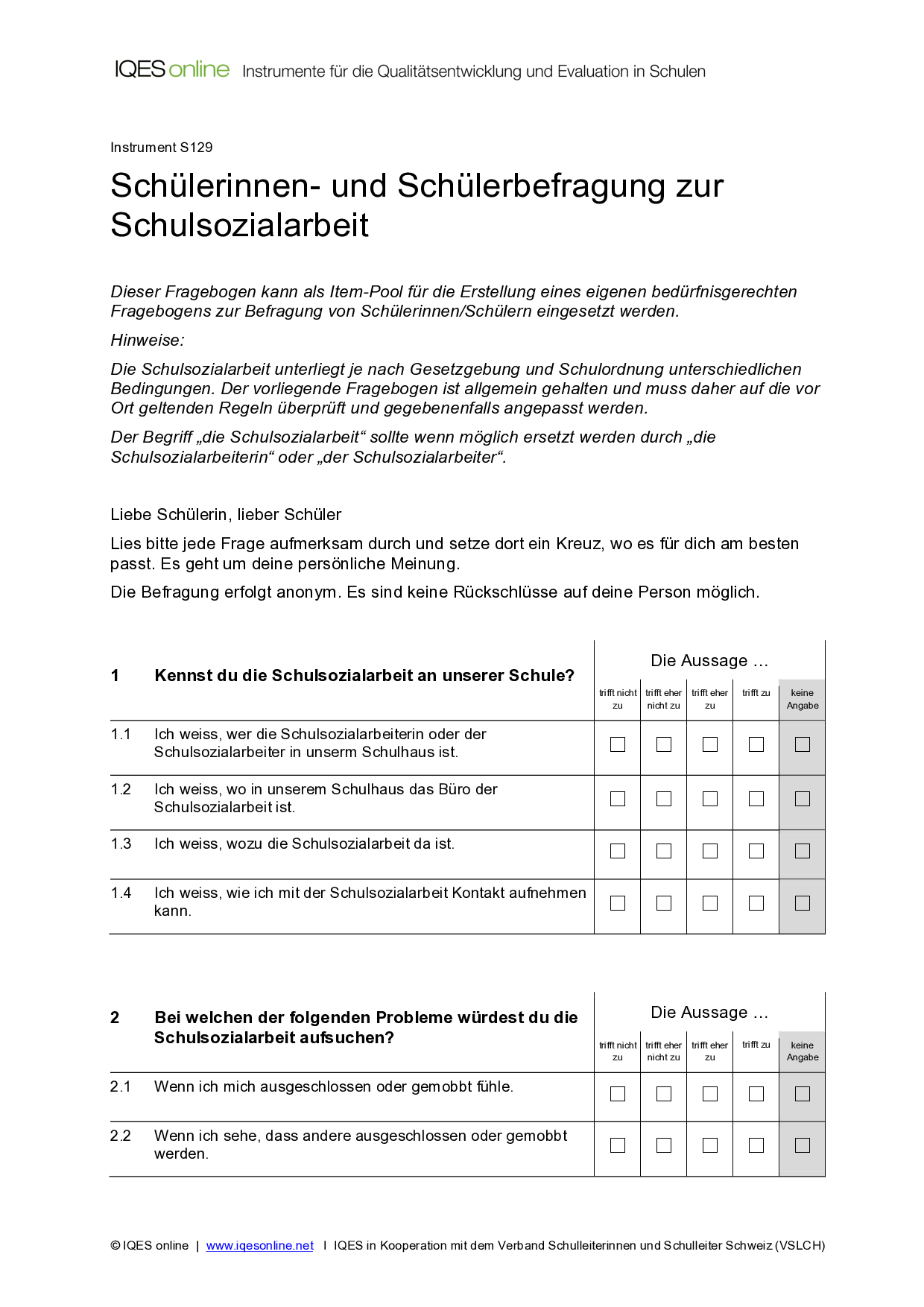 Mit dieser Schüler/innenbefragung können Meinungen zur Schulsozialarbeit eingeholt werden. Der Fragebogen erfasst Erwartungen an die Schulsozialarbeit und Beurteilungen der Schulsozialarbeit aus der Perspektive der Schülerinnen und Schüler.