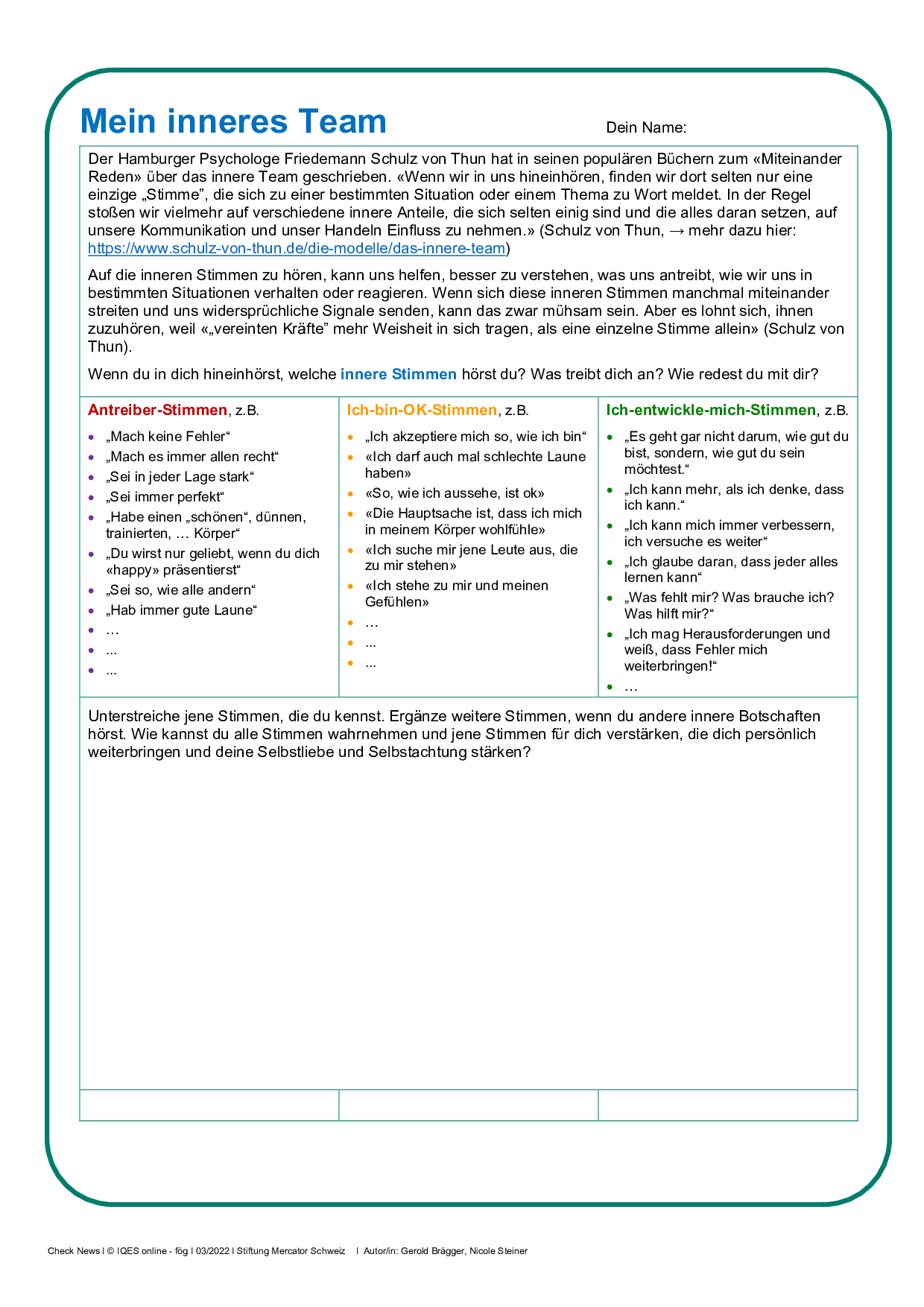 Deine persönliche Reflexion: Wenn du in dich hineinhörst, welche innere Stimmen hörst du? Was treibt dich an? Wie redest du mit dir? Mit welchen inneren Botschaften sagst du dir, dass du dich annehmen kannst, so wie du bist? Und dass du dich jeden Tag weiterentwickeln kannst?