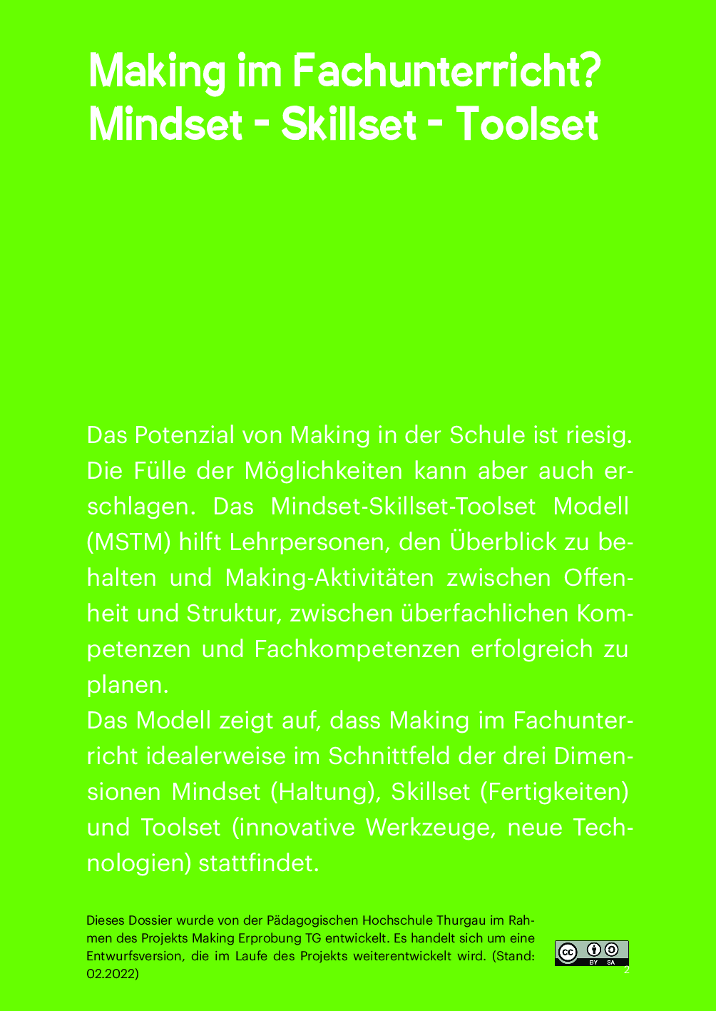 Das Potenzial von Making in der Schule ist riesig. Die Fülle der Möglichkeiten kann aber auch erschlagen. Das Mindset-Skillset-Toolset Modell (MSTM) hilft Lehrpersonen, den Überblick zu behalten und Making-Aktivitäten zwischen Offenheit und Struktur, zwischen überfachlichen Kompetenzen und Fachkompetenzen erfolgreich zu planen. Das Modell zeigt auf, dass Making im Fachunterricht idealerweise im Schnittfeld der drei Dimensionen Mindset (Haltung), Skillset (Fertigkeiten) und Toolset (innovative Werkzeuge, neue Technologien) stattfindet (CCBYSA).