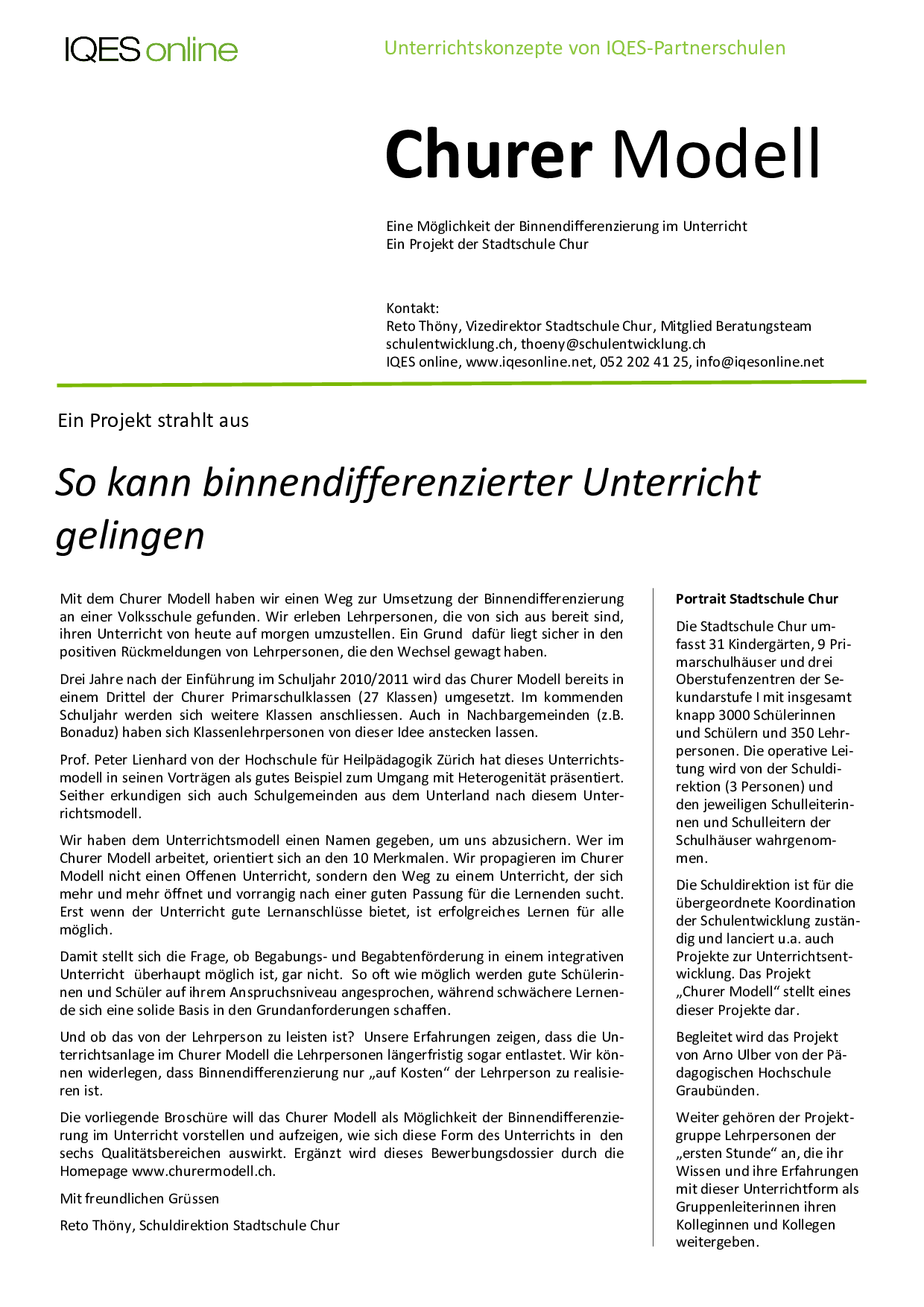 Die vorliegende Broschüre will das Churer Modell als Möglichkeit der Binnendifferenzierung im Unterricht vorstellen und aufzeigen, wie sich diese Form des Unterrichts in den sechs Qualitätsbereichen auswirkt.