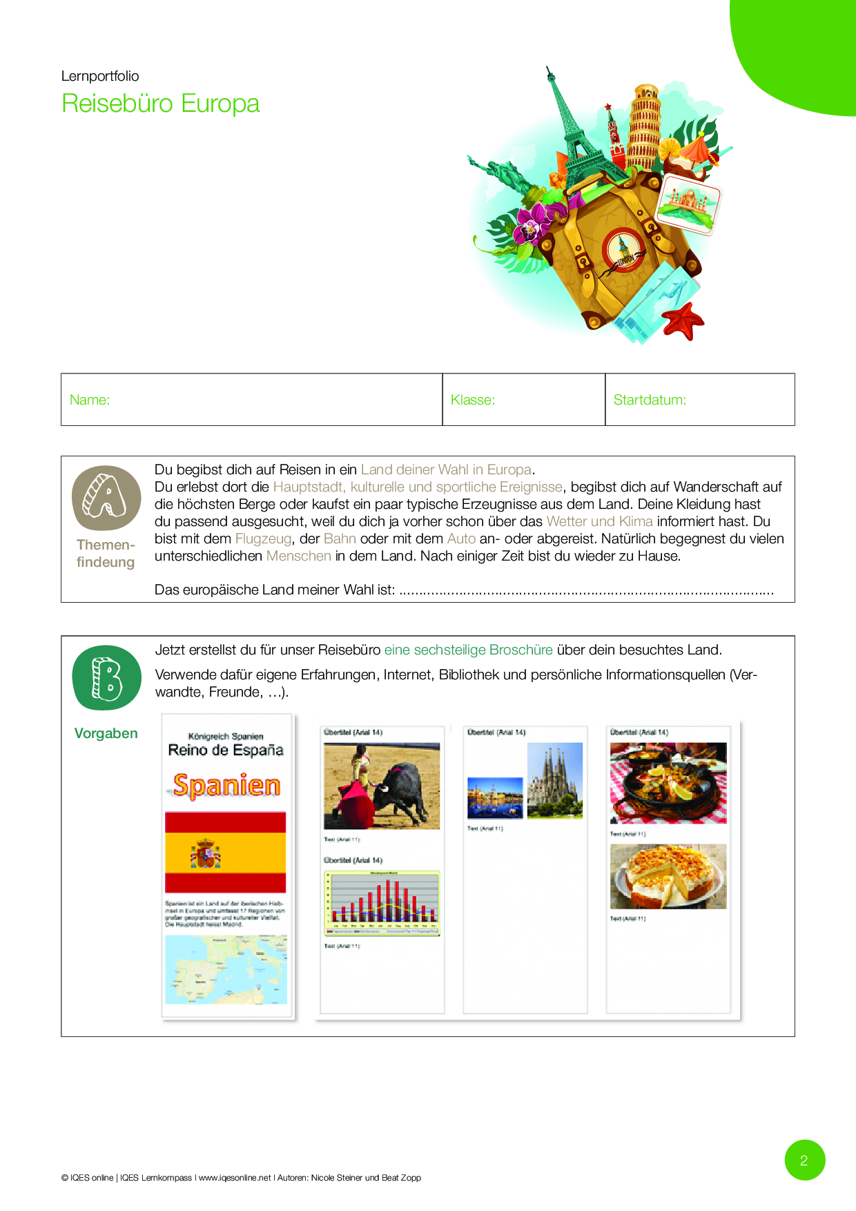 Die Lernenden erstellen für ein selbstgewähltes, europäisches Land eine ansprechende, werbewirksame Broschüre, die vielfältige Informationen enthält und dabei fachliche und überfachliche Kompetenzen in den Fokus rückt. Die Reflexion des individuellen Lernwegs, die kriteriengeleitete Selbst- und Fremdeinschätzung des Produkts und die abschliessende summative Beurteilung zeigen eine produkt- und prozessorientierte Möglichkeit der kompetenzorientierten Beurteilung.