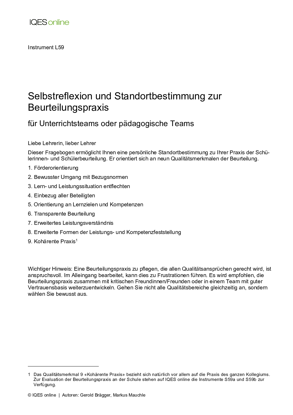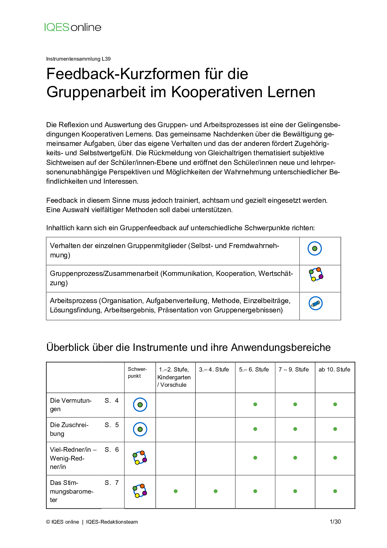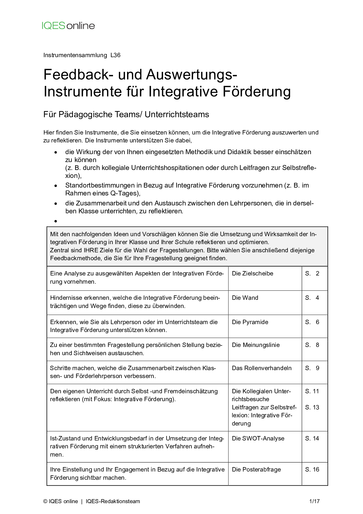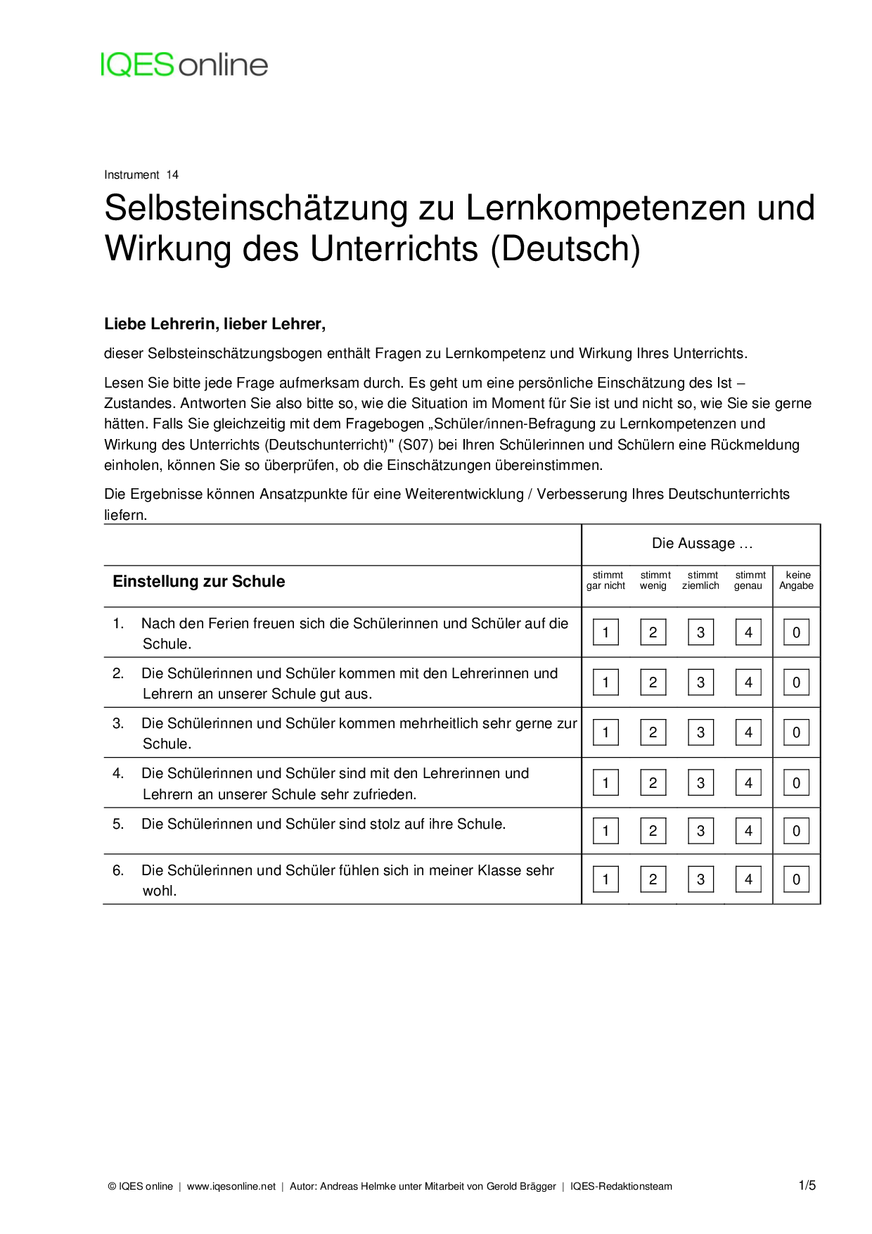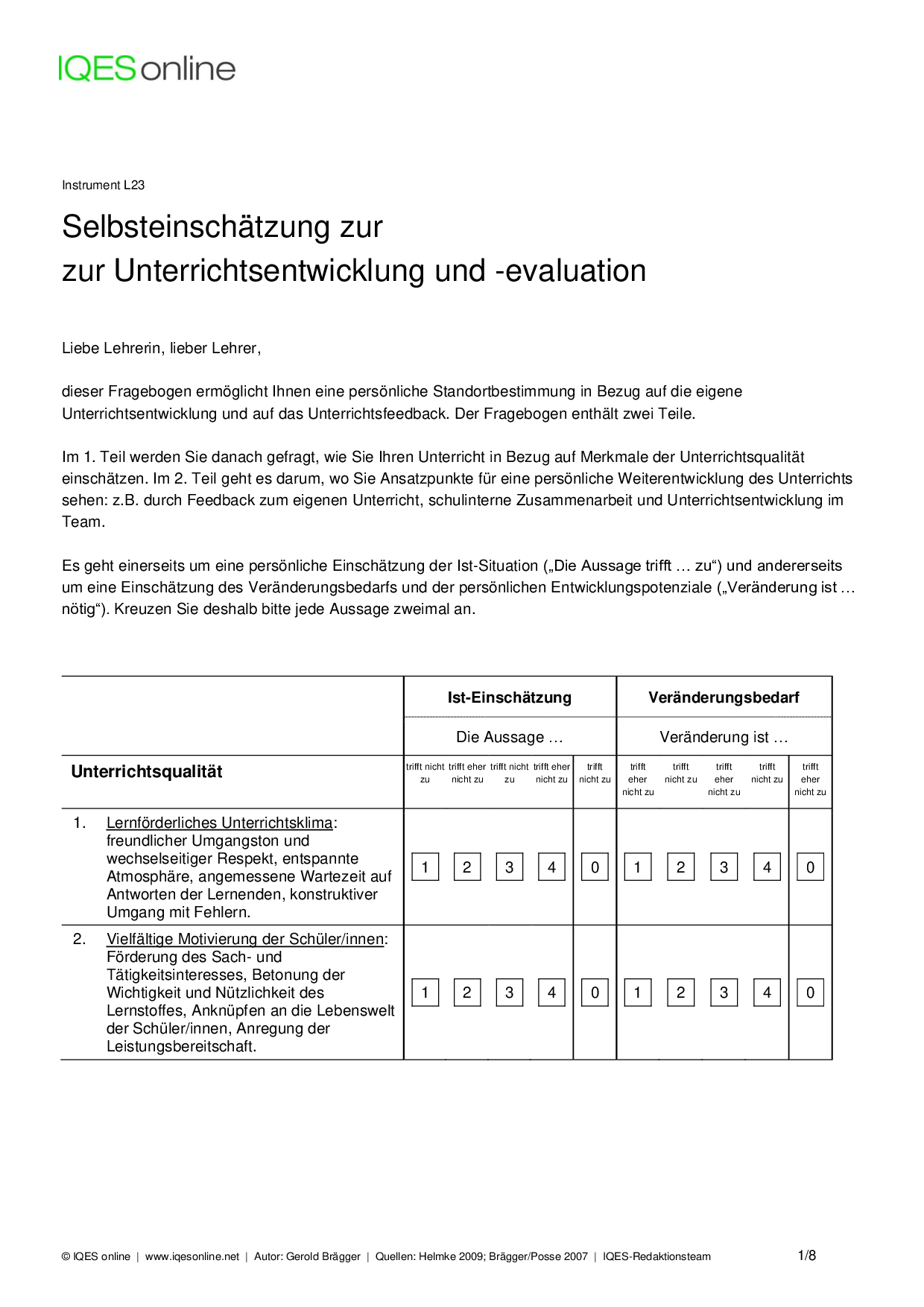 Instrument für Selbstreflexion und Standortbestimmung in Unterrichtsteams/ pädagogischen Teams