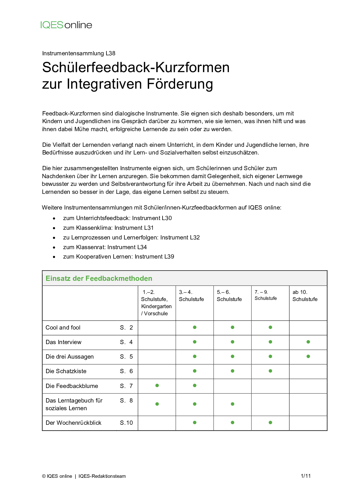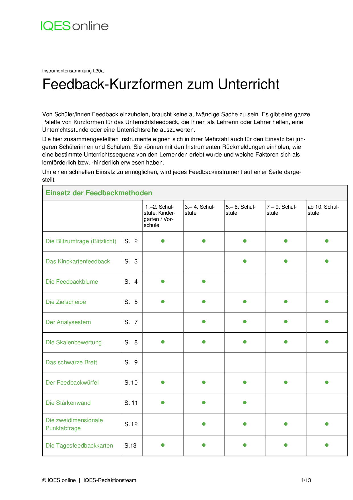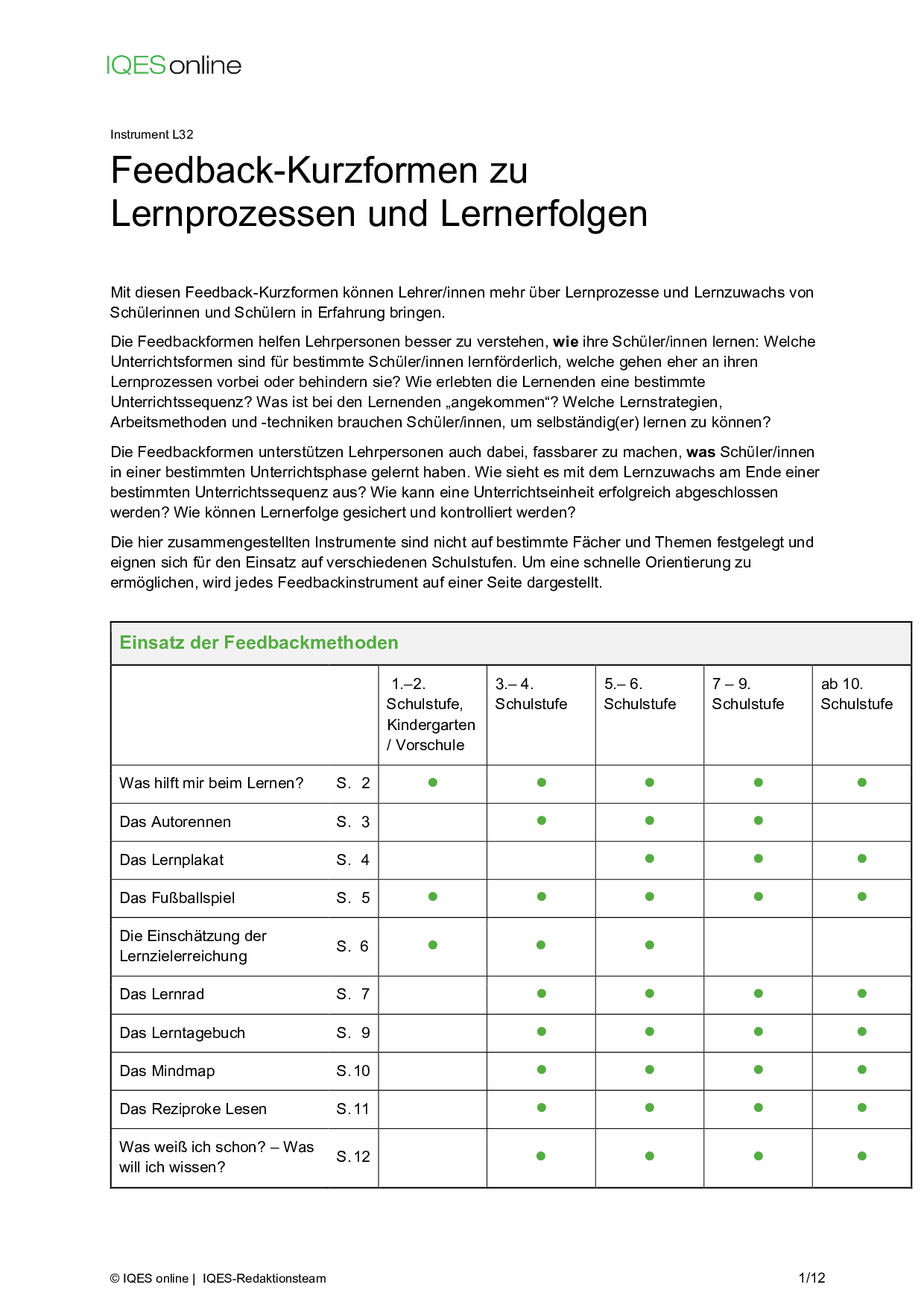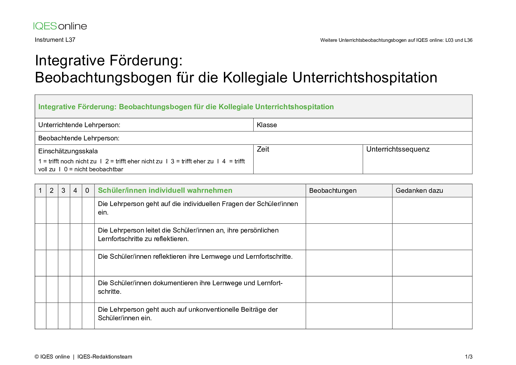 Instrument für Selbstreflexion und Standortbestimmung in Unterrichtsteams/ pädagogischen Teams