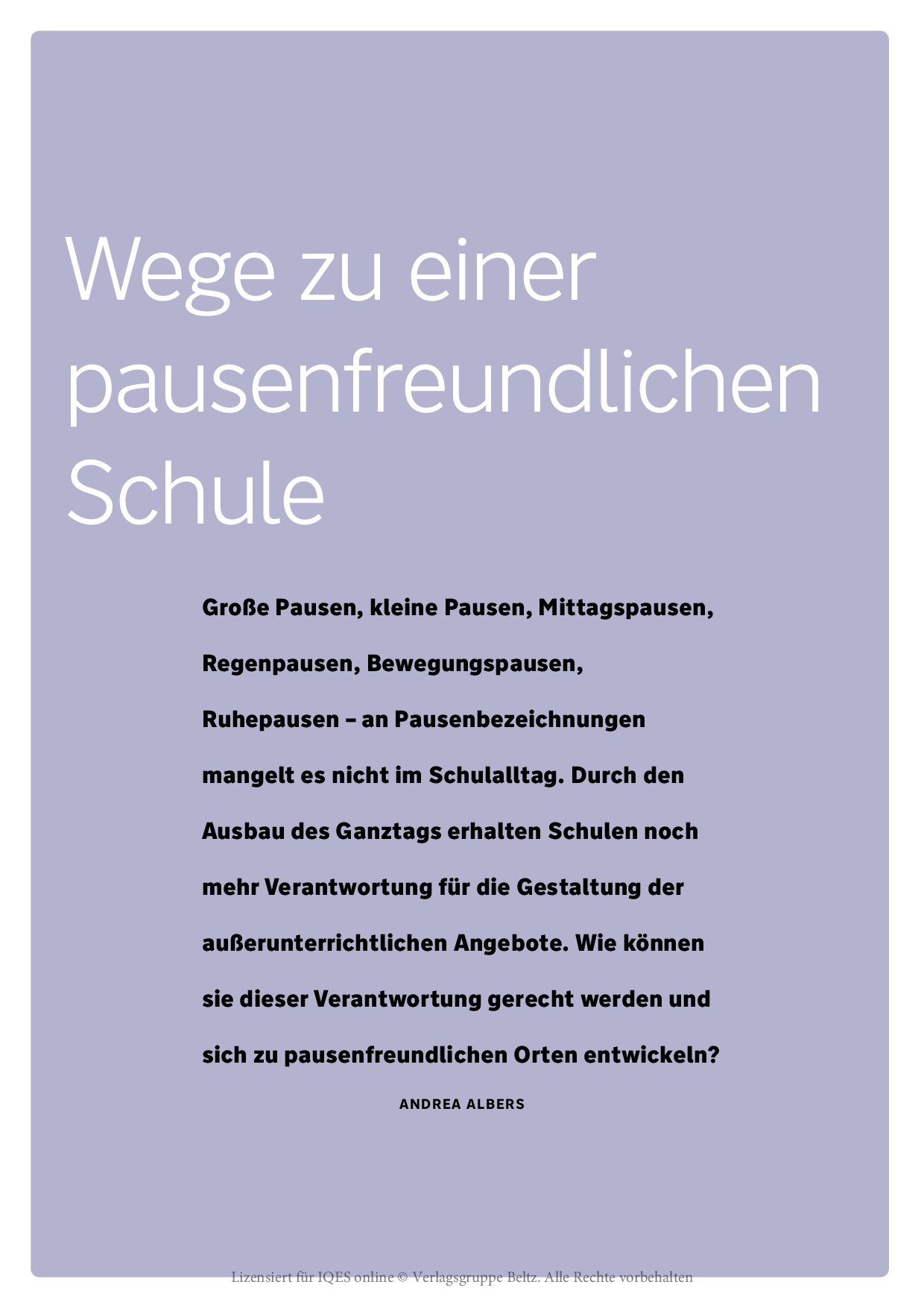 Große Pausen, kleine Pausen, Mittagspausen, Regepausen, Bewegungspausen, Ruhepausen – an Pausenbezeichnungen mangelt es nicht im Schulalltag. Durch den Ausbau des Ganztags erhalten Schulen noch mehr Verantwortung für die Gestaltung der außerunterrichtlichen Angebote. Wie können sie dieser Verantwortung gerecht werden und sich zu pausenfreundlichen Orten entwickeln?