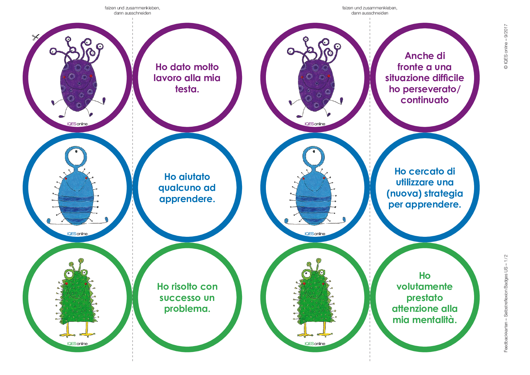 Diese Karten auf Italienisch ermöglichen ein «monsterhaft» gutes Feedback: Sie können als Mittel zur mündlichen oder schriftlichen Selbstreflexion eingesetzt werden, sind Denkanstoss, Sprech- und Schreibanlass und bieten die Möglichkeit, alleine oder gemeinsam über das Lernen nachzudenken, den eigenen Lernprozess sichtbar werden zu lassen. Als Badges werden sie auch zu Orientierungspunkten und Begleitern für eigene Lernziele.
