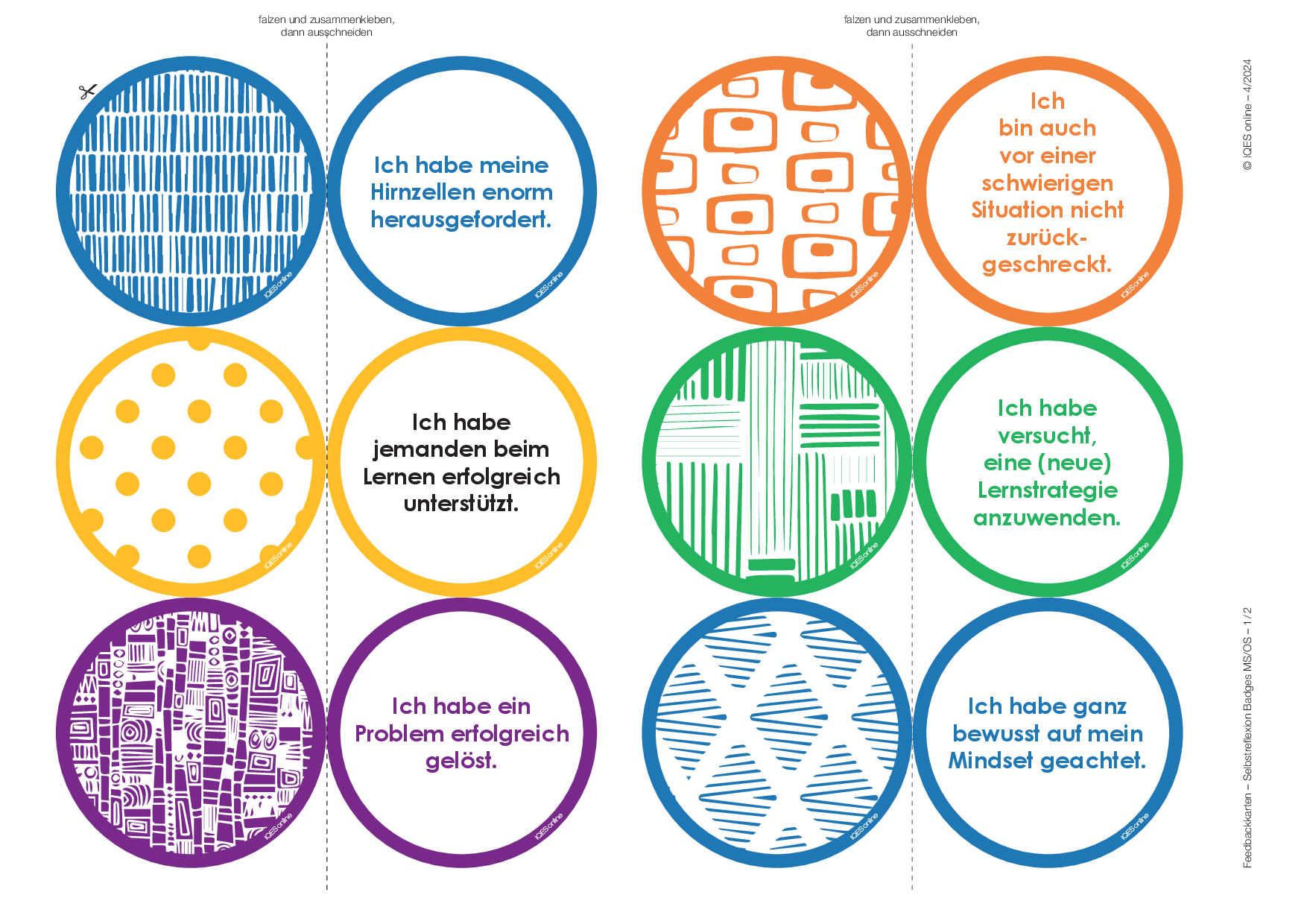 Diese Karten sind für die mündliche oder schriftliche Selbstreflexion, als Denkanstoss, Sprech- und Schreibanlass einsetzbar. Zudem bieten sie die Möglichkeit für Schülerinnen und Schüler ebenso wie für Lehrpersonen, alleine oder gemeinsam über das Lernen nachzudenken, den eigenen Lernprozess oder den Unterricht sichtbar werden zu lassen. Als Badges werden sie auch zu Orientierungspunkten und Begleitern für eigene Lernziele.