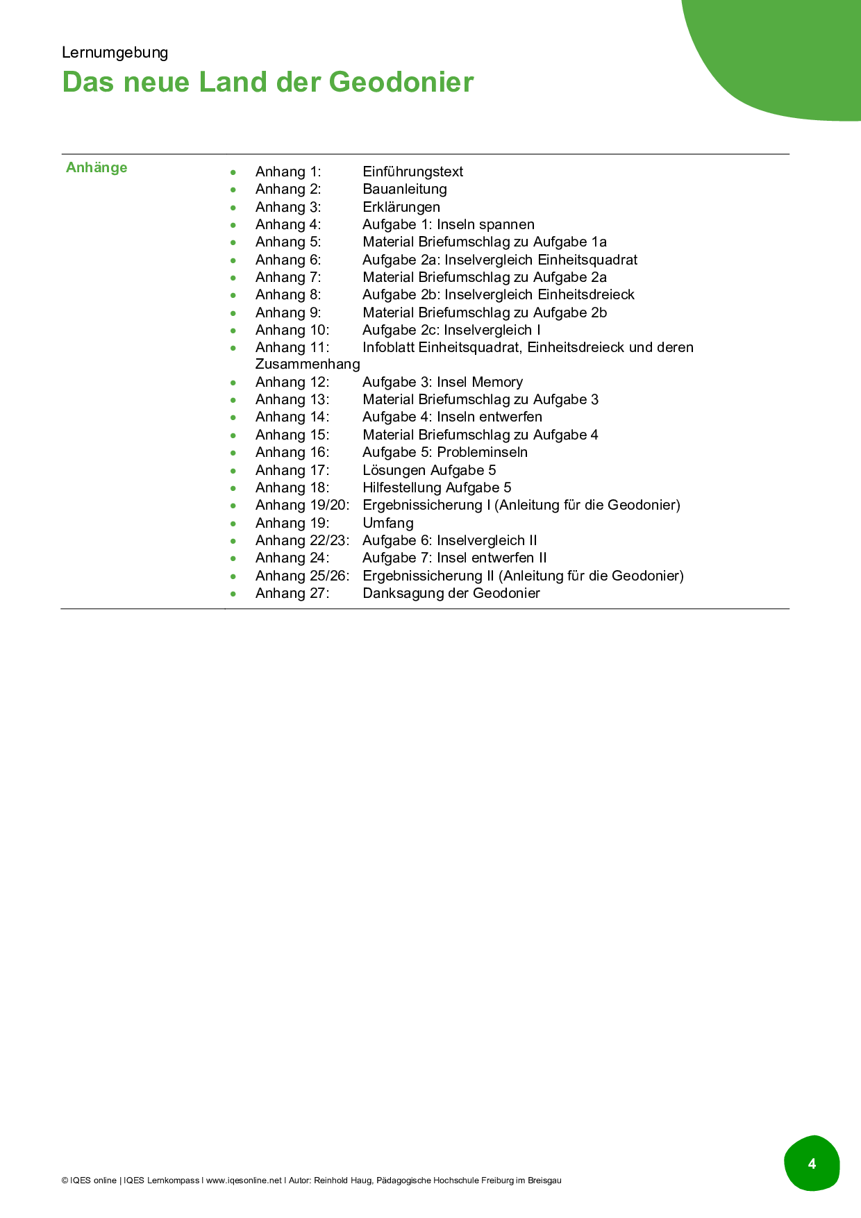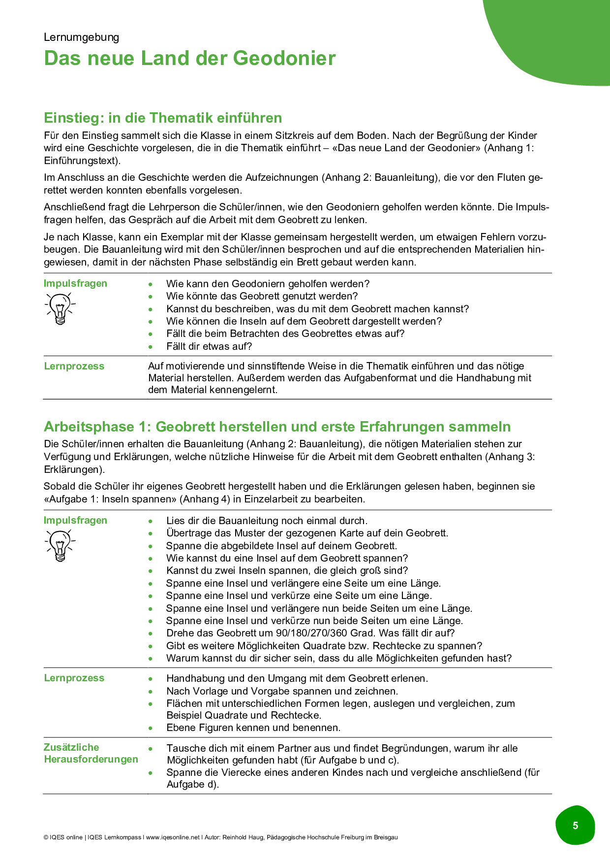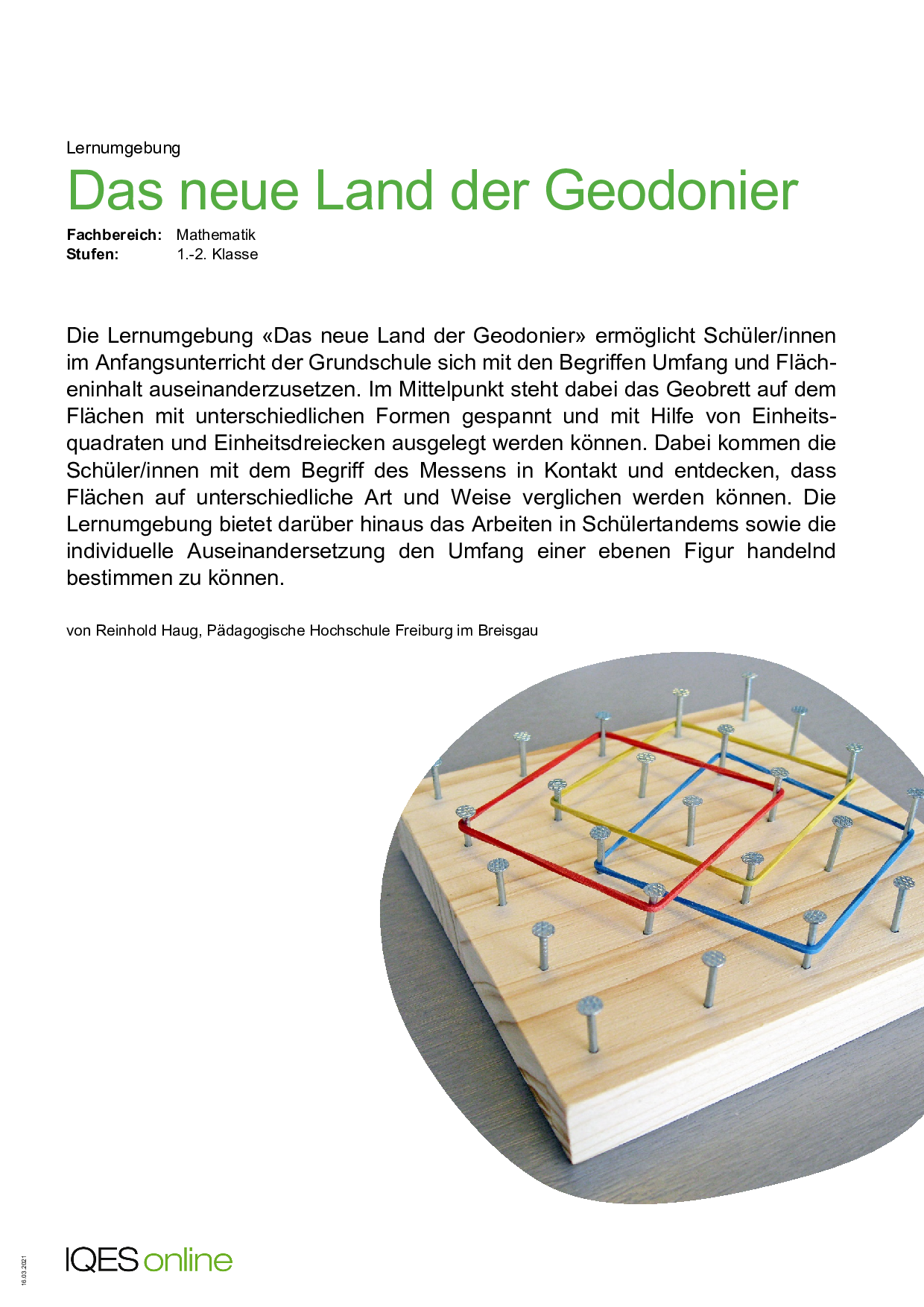 Im Mittelpunkt steht das Geobrett auf dem Flächen mit unterschiedlichen Formen gespannt und mit Hilfe von Einheitsquadraten und Einheitsdreiecken ausgelegt werden können. Die Schüler/innen erstellen mit Hilfe einer Bauanleitung ein eigenes Geobrett. Darauf spannen sie vorgegebene Inseln nach.