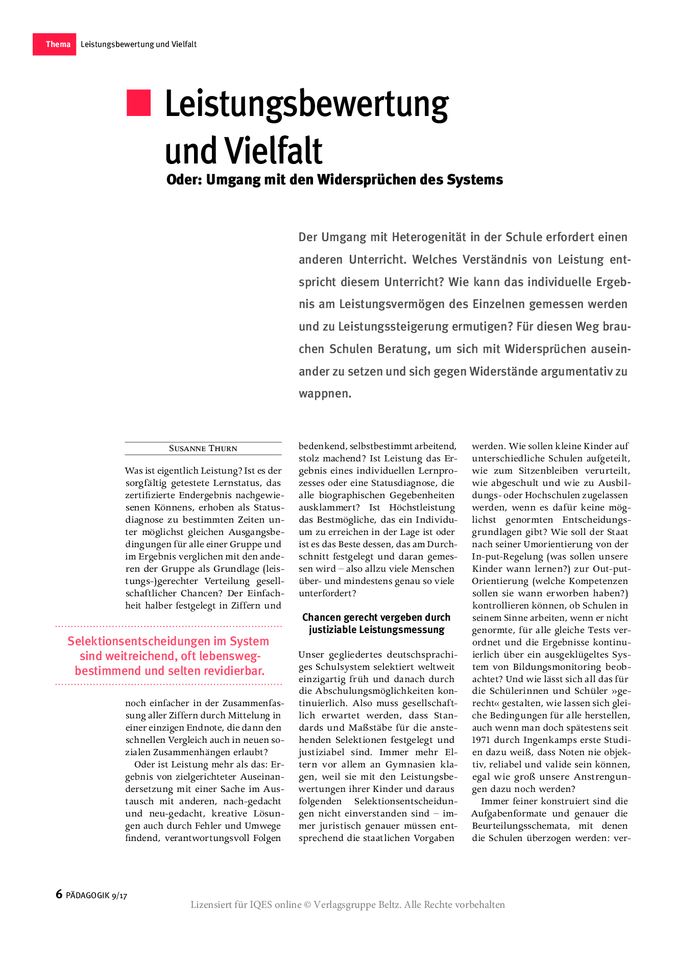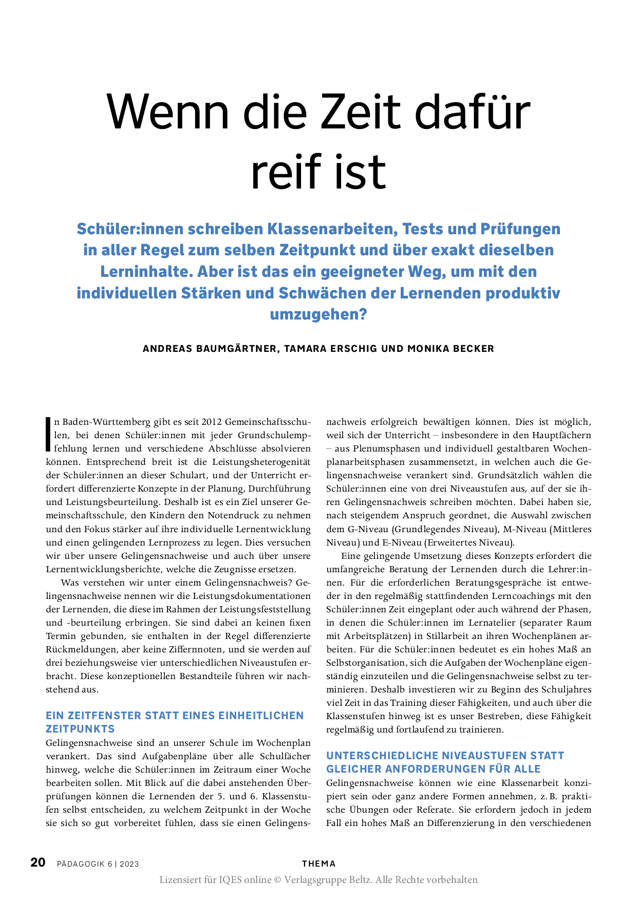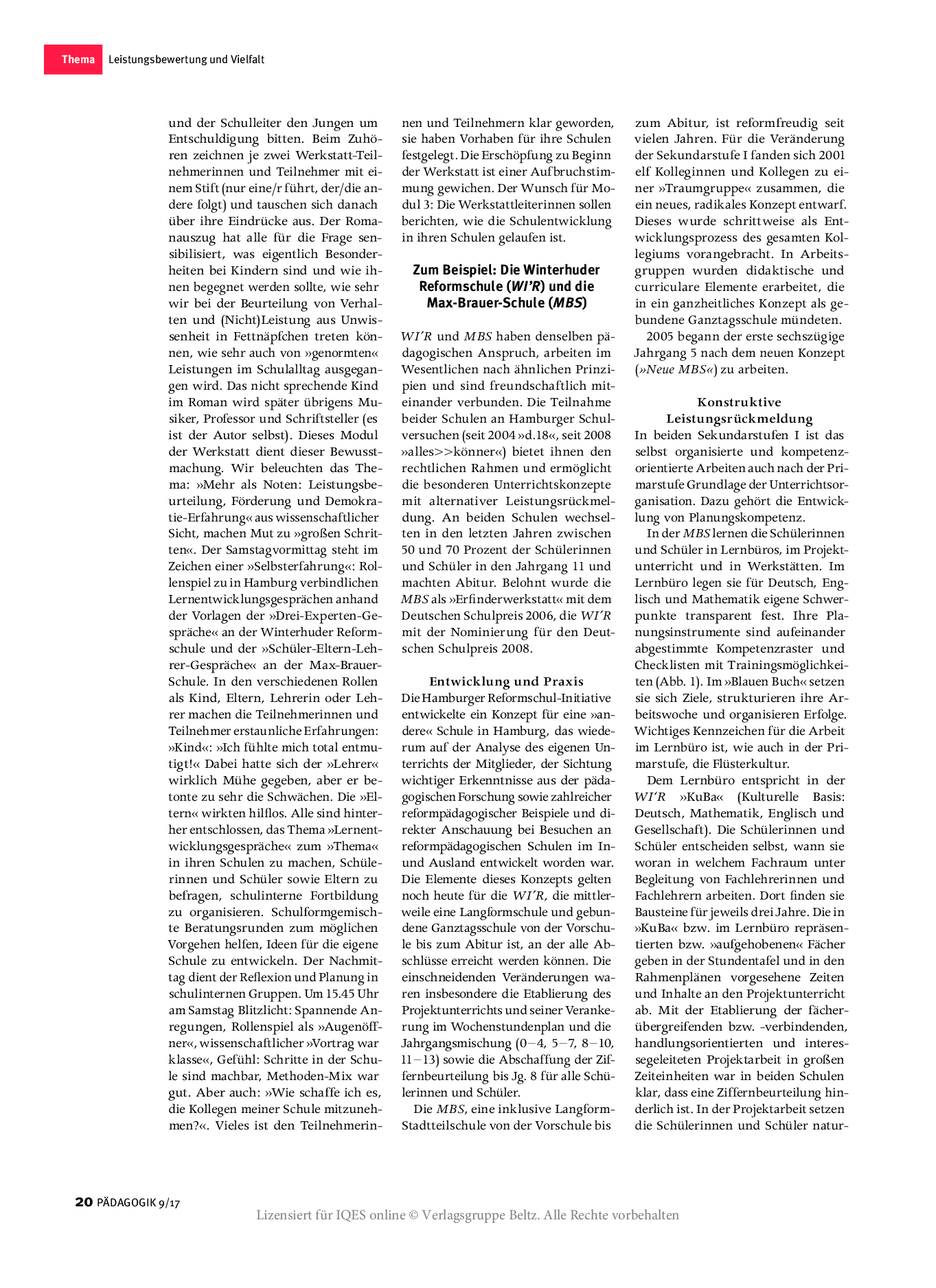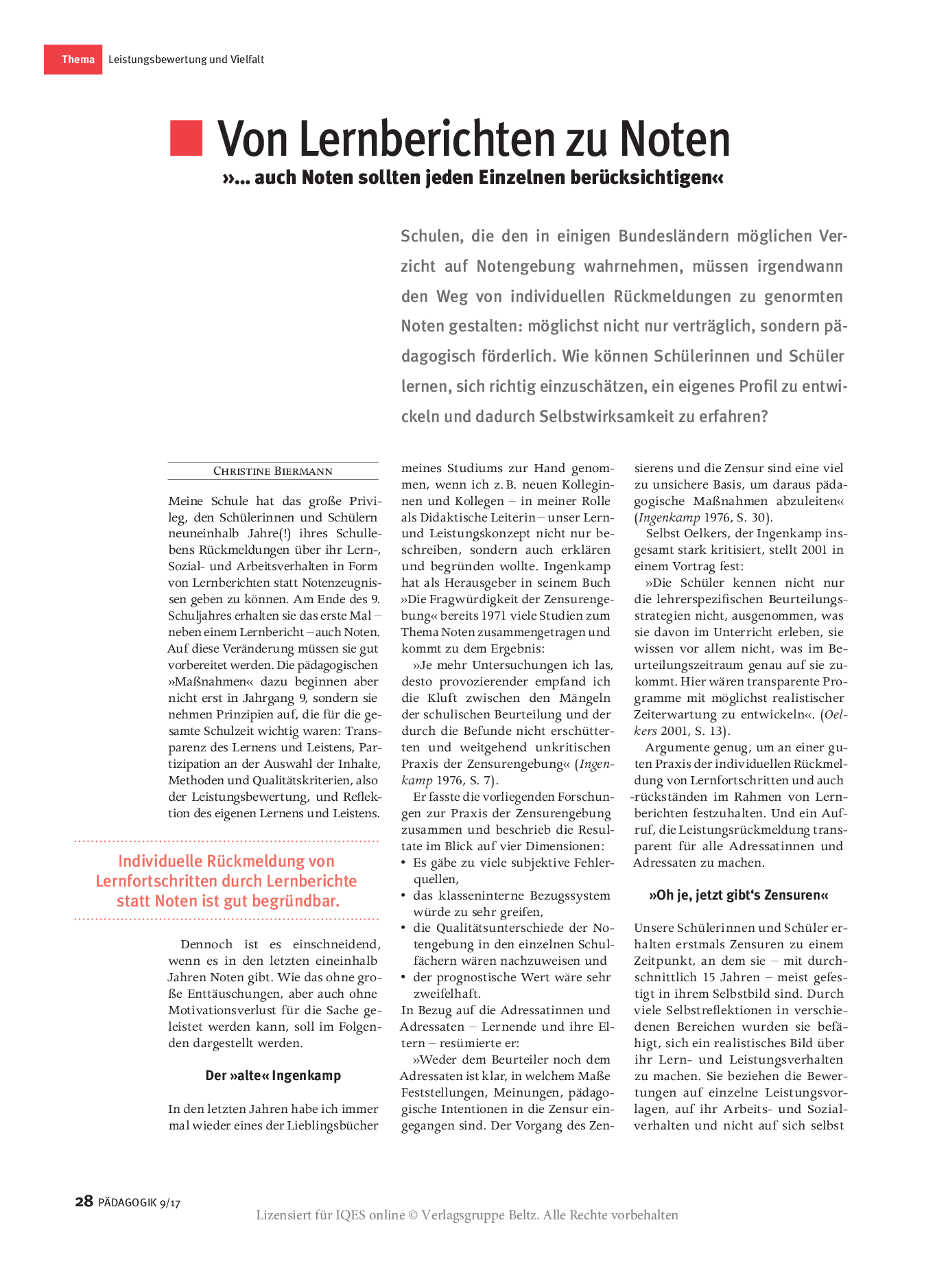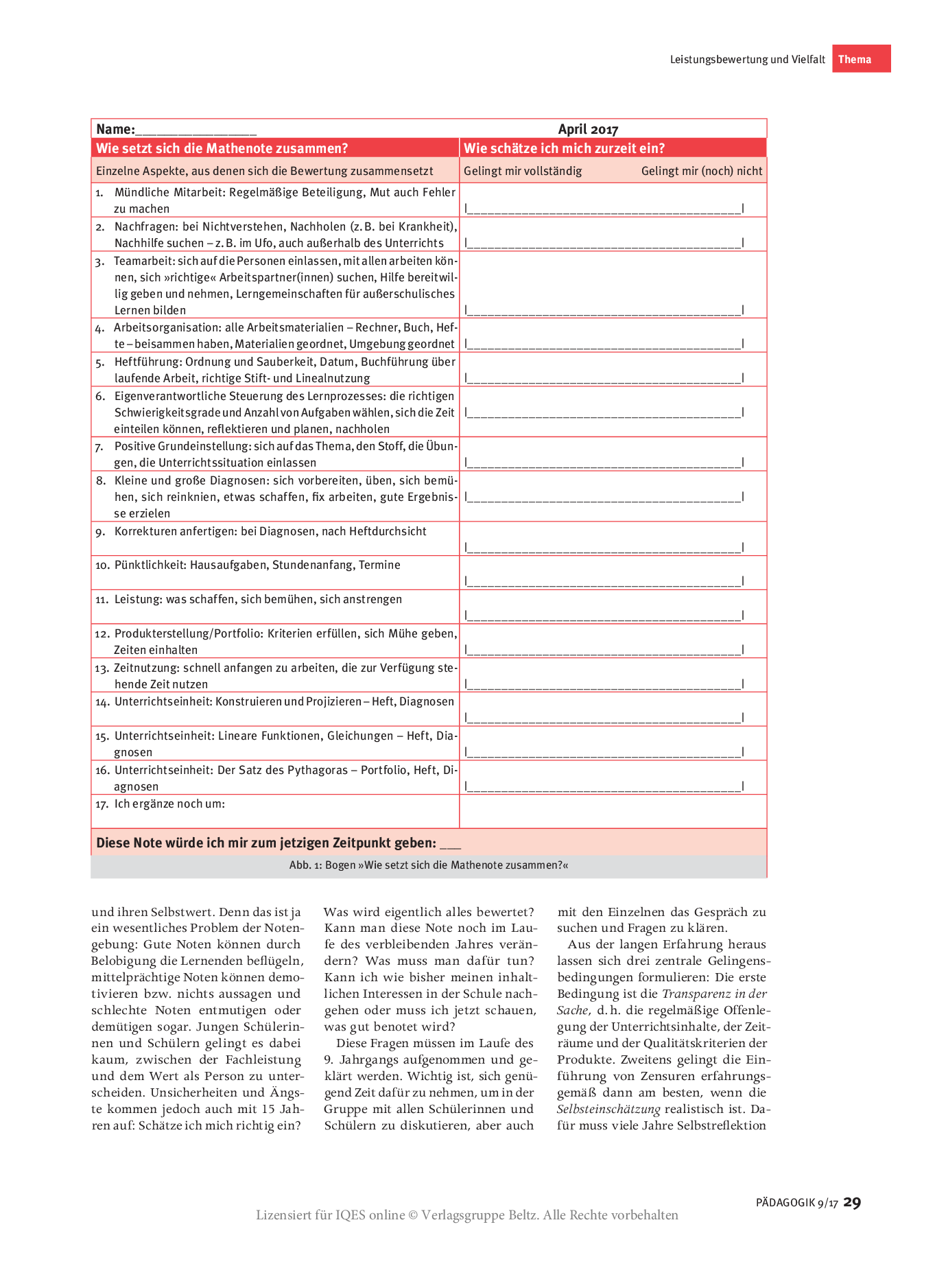 Schulen, die den in einigen Bundesländern möglichen Verzicht auf Notengebung wahrnehmen, müssen irgendwann den Weg von individuellen Rückmeldungen zu genormten Notengestalten: möglichst nicht nur verträglich, sondern pädagogisch förderlich. Wie können Schülerinnen und Schüler lernen, sich richtig einzuschätzen, ein eigenes Profil zu entwickeln und dadurch Selbstwirksamkeit zu erfahren?