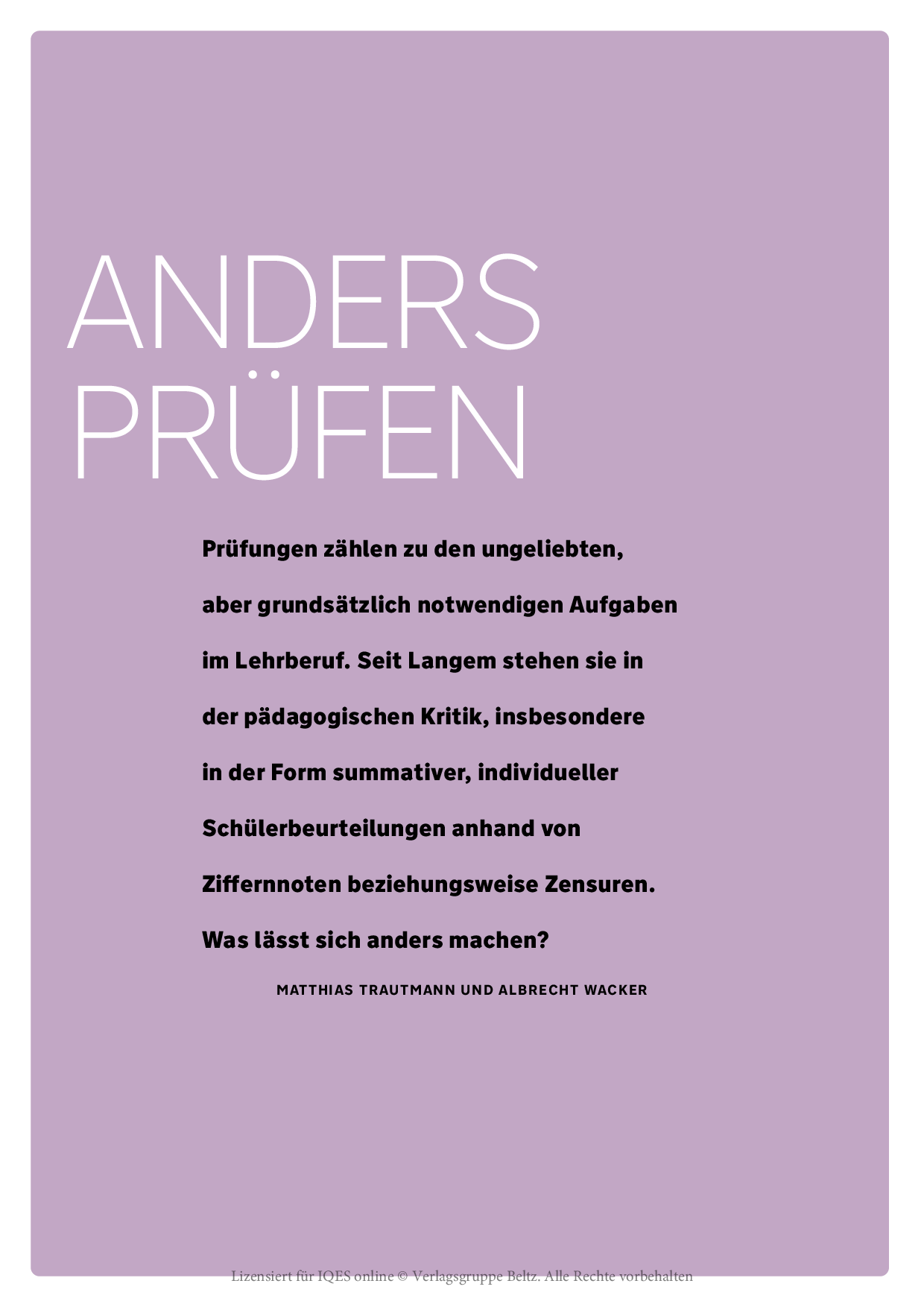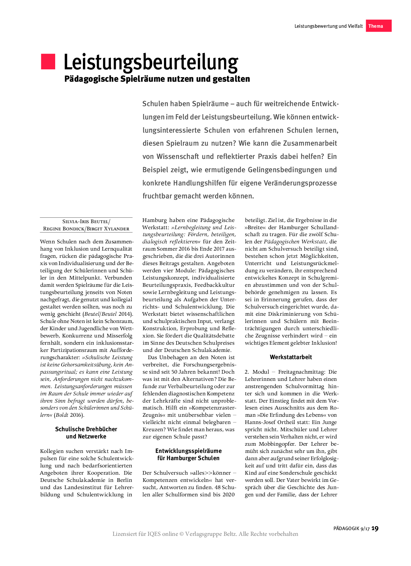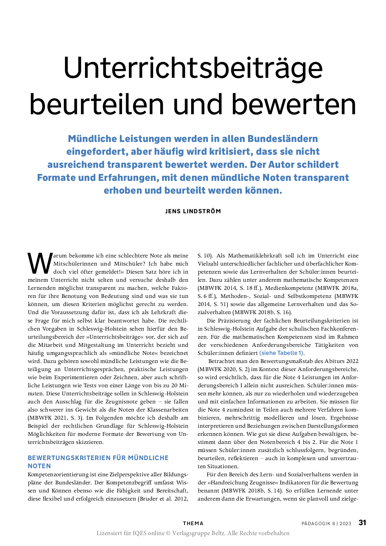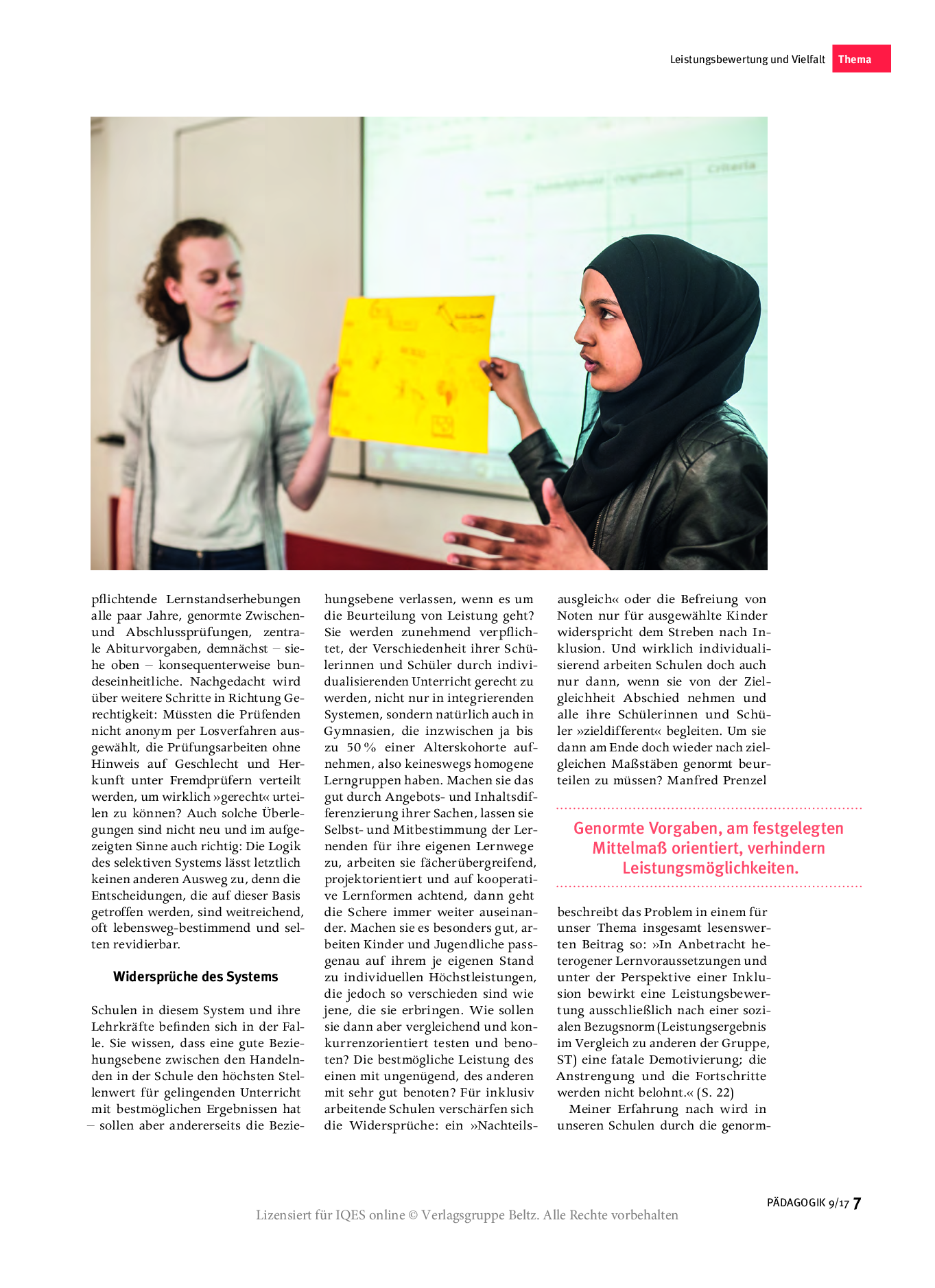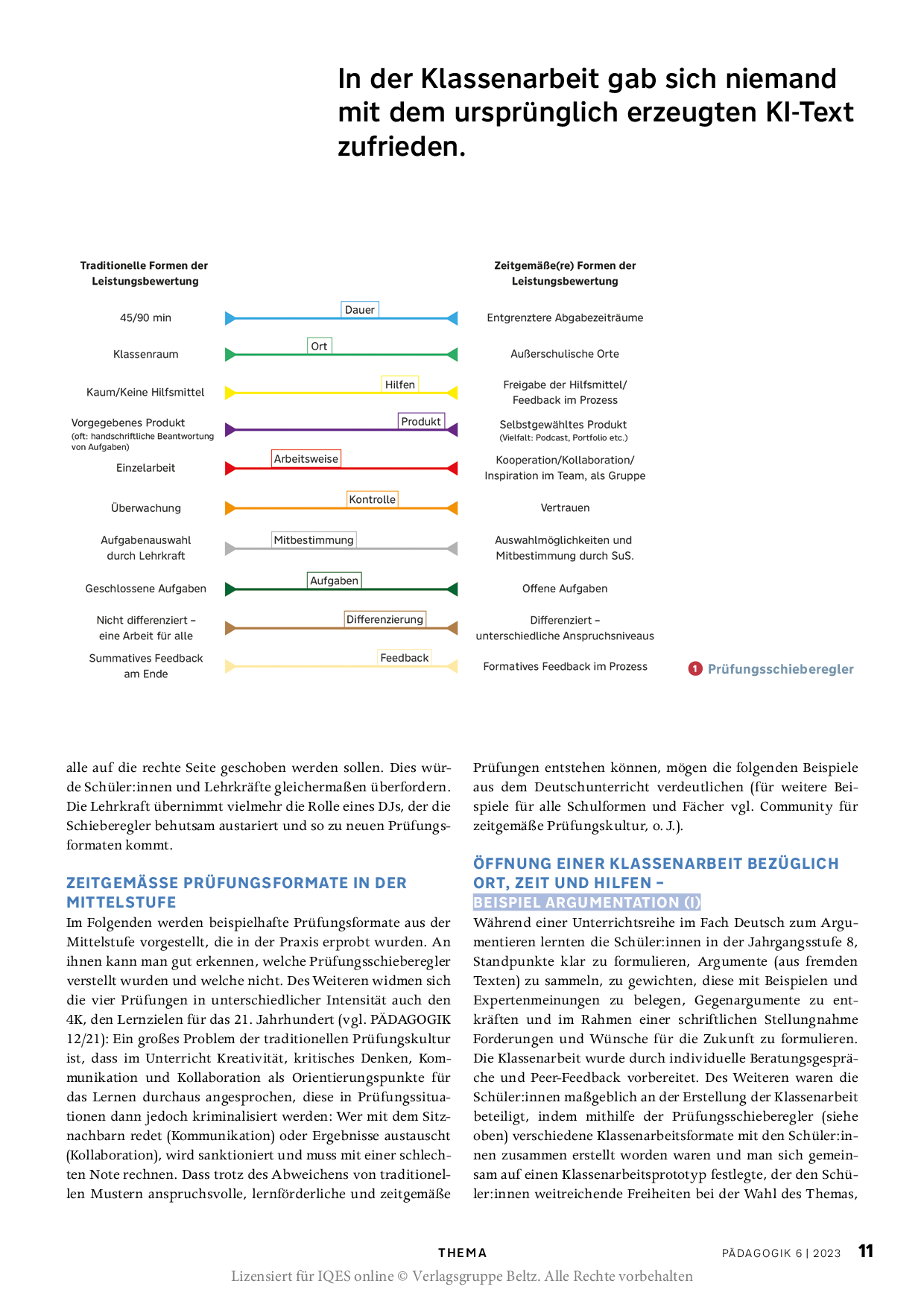 Schulen, die den in einigen Bundesländern möglichen Verzicht auf Notengebung wahrnehmen, müssen irgendwann den Weg von individuellen Rückmeldungen zu genormten Notengestalten: möglichst nicht nur verträglich, sondern pädagogisch förderlich. Wie können Schülerinnen und Schüler lernen, sich richtig einzuschätzen, ein eigenes Profil zu entwickeln und dadurch Selbstwirksamkeit zu erfahren?