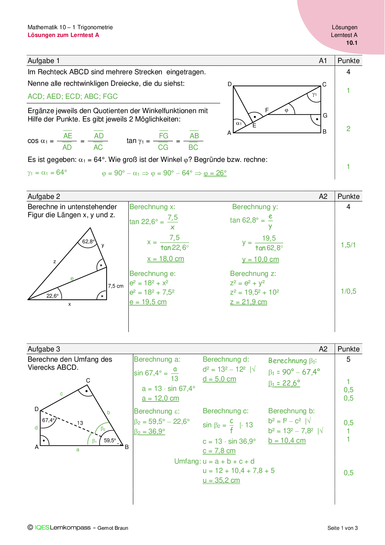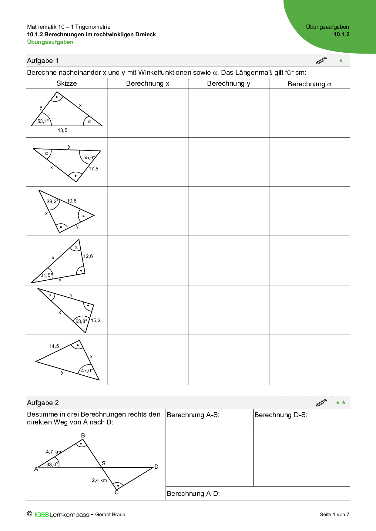 10.1.2 Berechnungen im rechtwinkligen Dreieck Übungsaufgaben