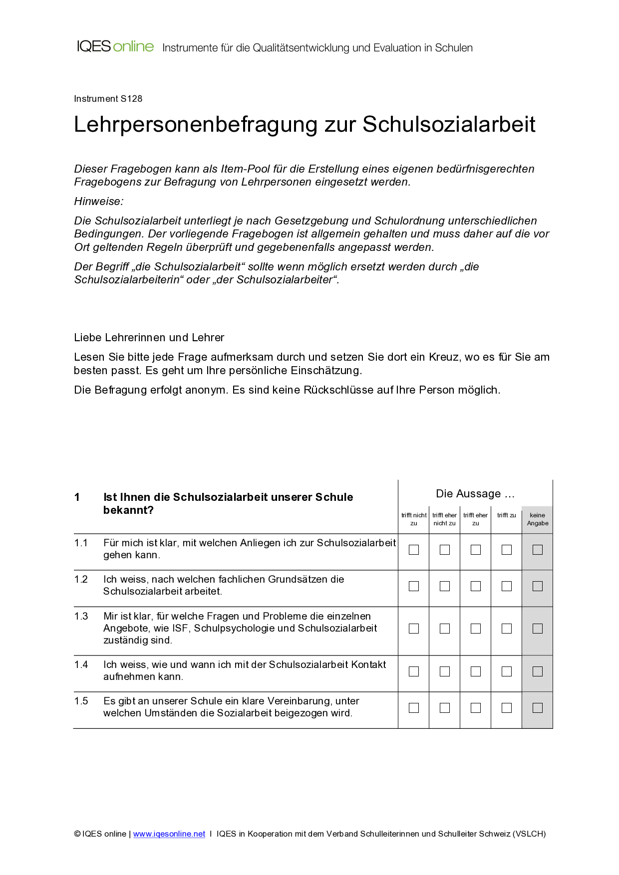 S128 Lehrpersonenbefragung zur Schulsozialarbeit