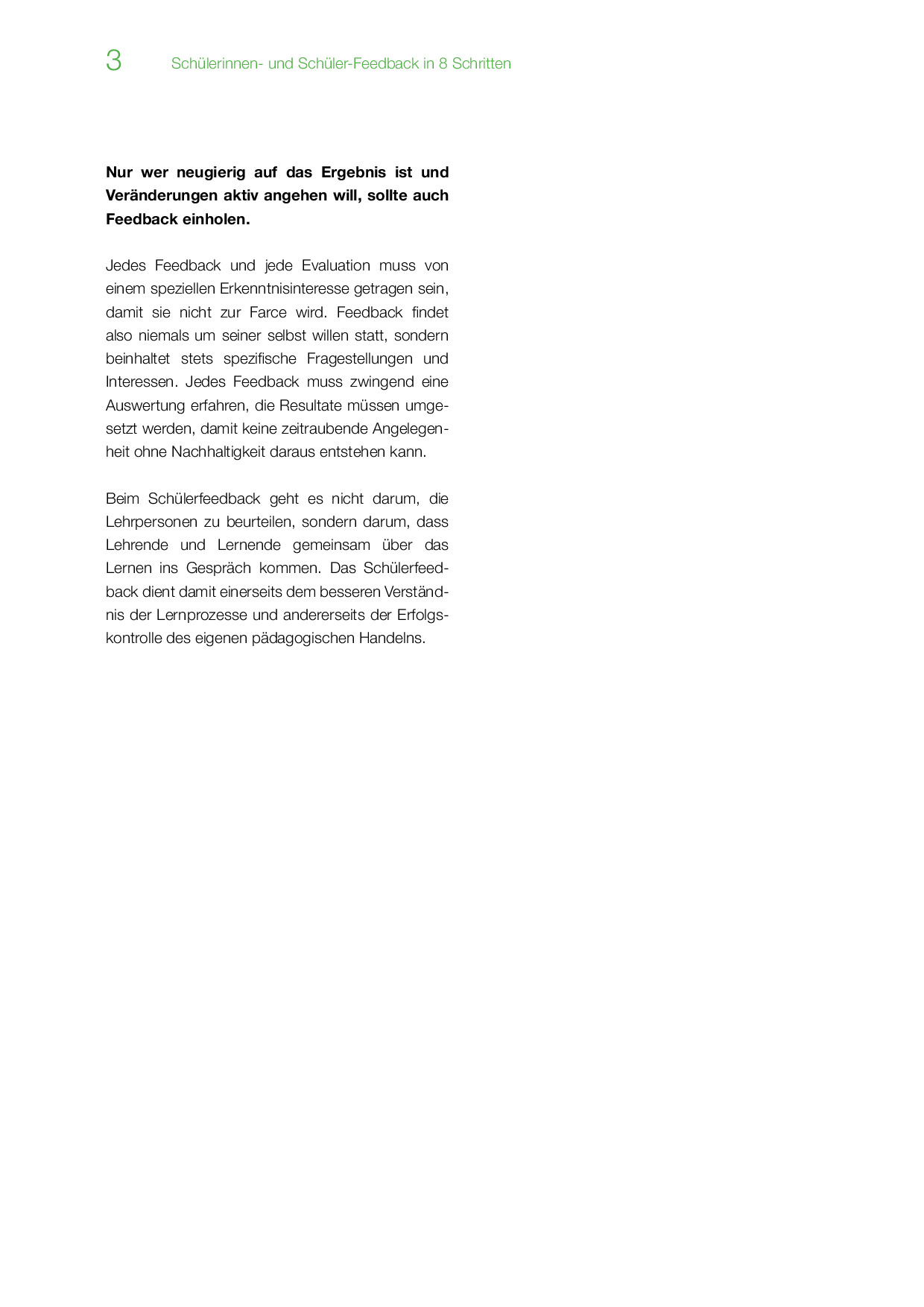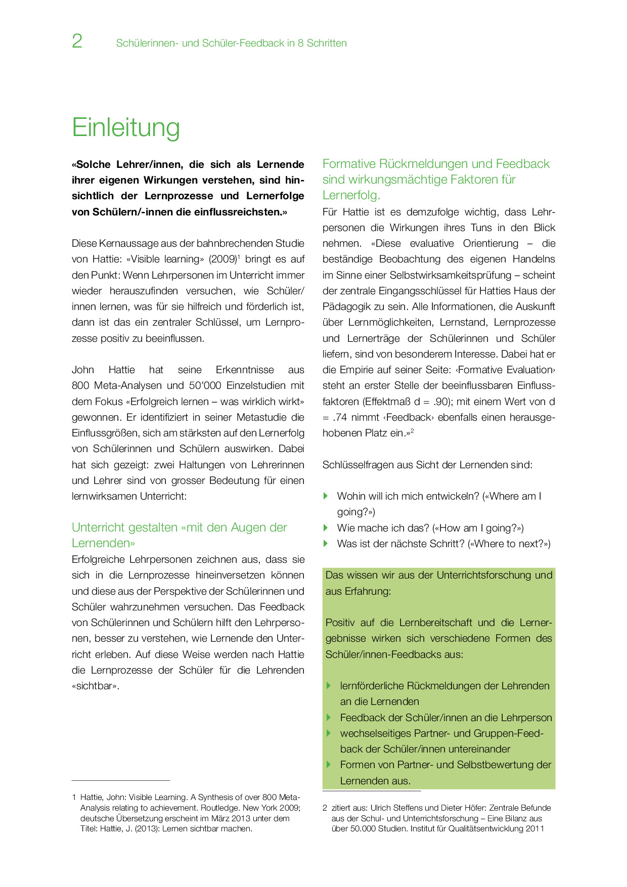 Die Anleitung beschreibt, wie Lehrpersonen ein Feedback bei den Schülerinnen und Schülern einholen können und welche Fragen in den einzelnen Teilschritten zu klären sind. Es wird ein idealtypischer Ablauf in acht Schritten vorgestellt.