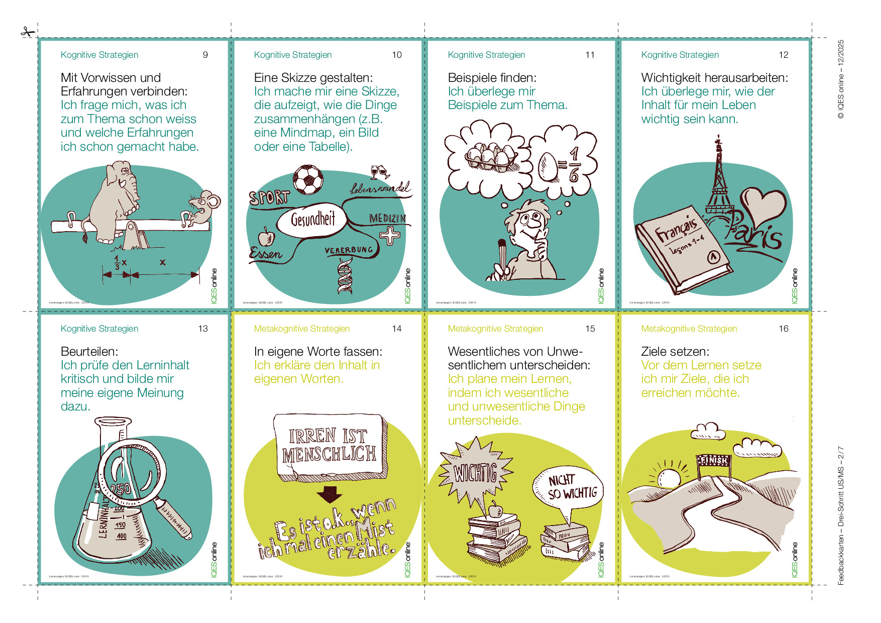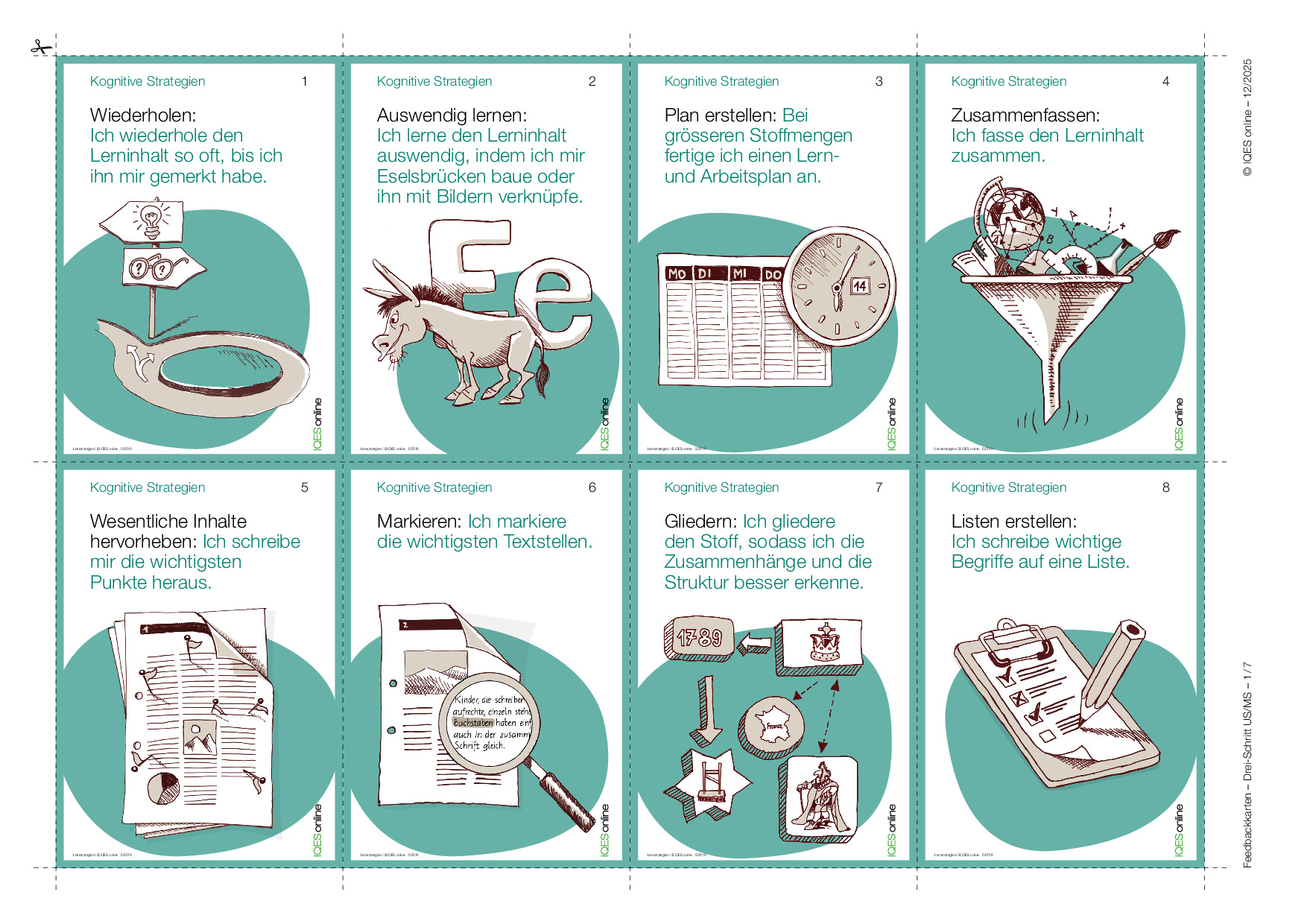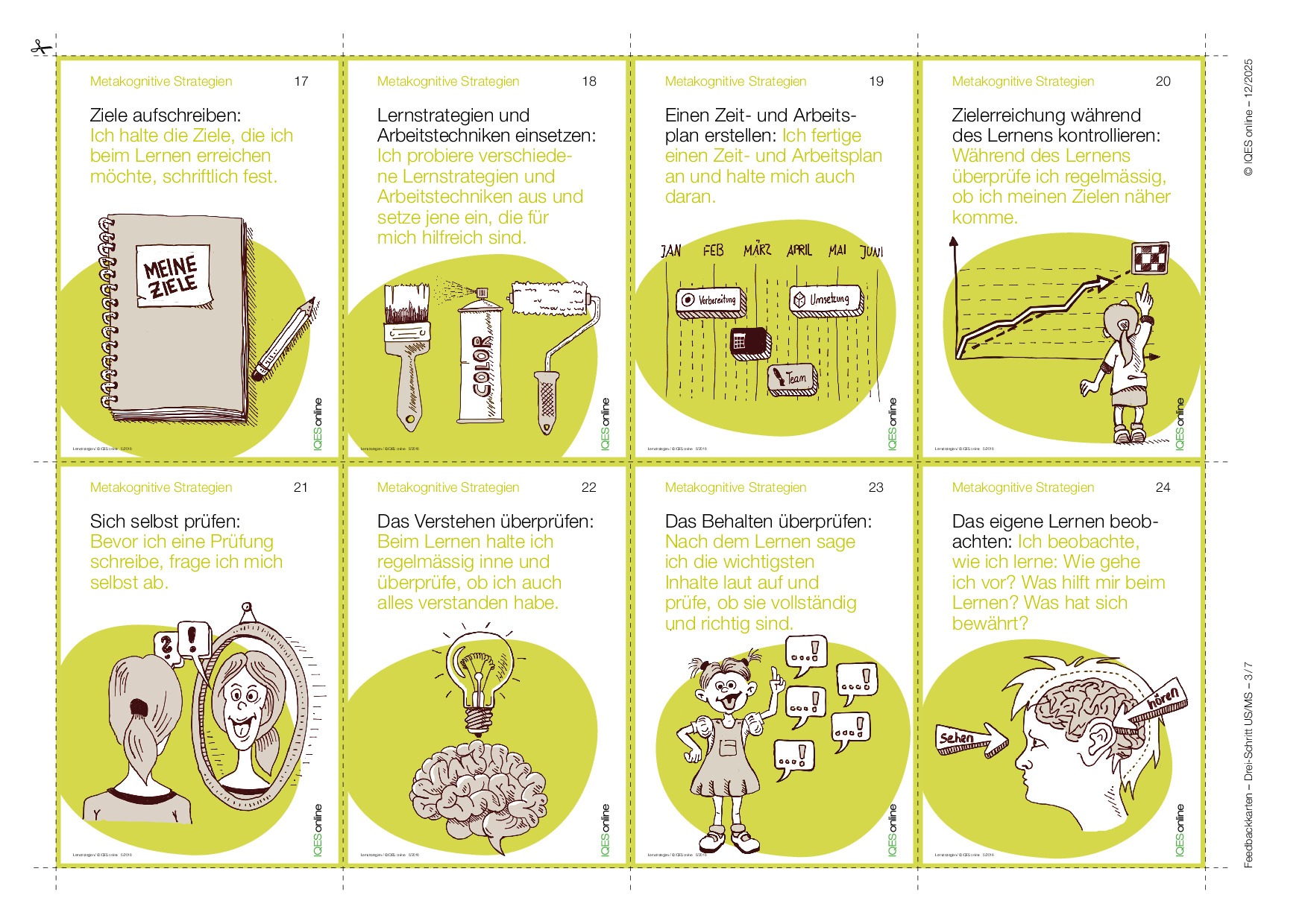 Das Kartenset «Lernstrategien» hilft Schüler/innen dabei, sich ein breites Repertoire an Lernstrategien zu erschließen – darüber zu reflektieren, wie sie lernen, was beim Lernen passiert und was gute Lerner/innen tun. Die Karten gliedern sich nach den fünf Lernstrategie-Typen kognitive, metakognitive, ressourcenorientierte, Motivations- und Emotionsstrategien. Auf jeder Karte wird humorvoll und ansprechend, textlich und bildlich eine Lernstrategie beschrieben.