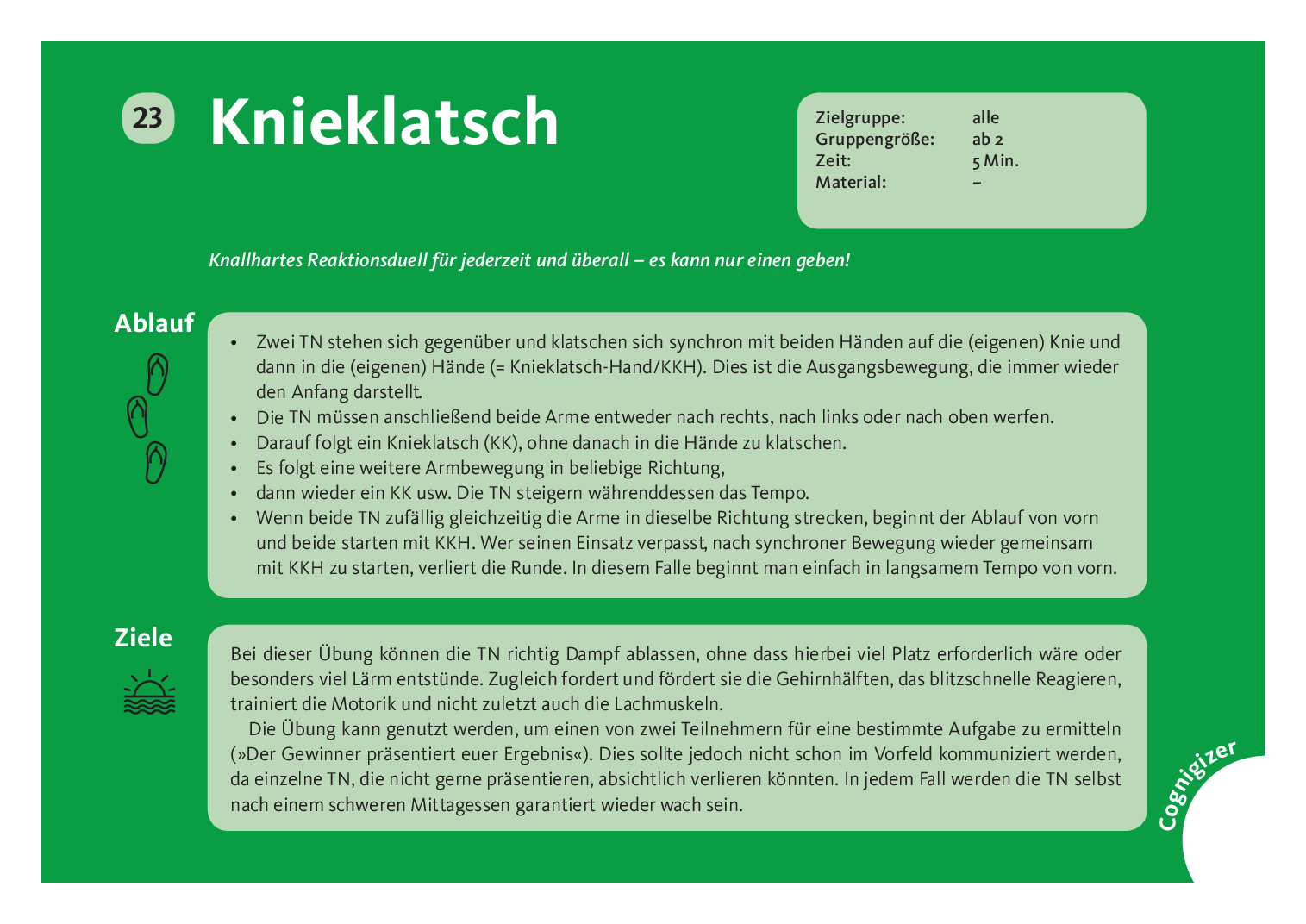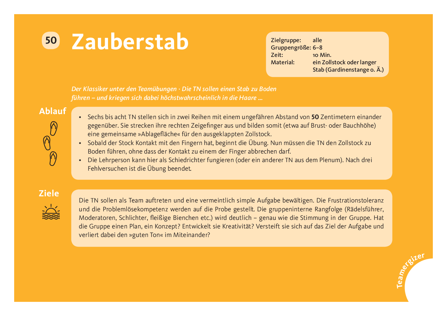 Die Übung bietet Gelegenheit, darüber zu reflektieren, dass in Teams vieles dem Zufall überlassen bleibt und dass es darum geht zu lernen, hiermit umgehen zu können. In dieser Übung ist es irgendwann »zufällig« die richtige Anzahl an Fingern zu zeigen, im übertragenen Sinne kann man sich oftmals seine Teammitglieder nicht aussuchen, findet sich darin eher »zufällig« mal als Experte, mal als Laie im Vergleich zu den Kompetenzen der anderen wieder oder muss sich mit Rahmenbedingungen arrangieren, die ebenfalls teils dem Zufall zu verdanken sind. Auf der anderen Seite lässt sich anhand dieser Übung verdeutlichen, dass Strategien nur dann wirklich wirksam sind, wenn man sie miteinander austauschen und sich abstimmen kann. Lassen Sie doch einmal, auch wenn es augenscheinlich trivial ist, die TN im Vorfeld eine gemeinsame Strategie absprechen, bevor es losgeht. Normalerweise sollten nun alle Gruppen genau einen Versuch benötigen, um auf 11 zu kommen. Dies kann auf simpelste Weise verdeutlichen, wie unglaublich viel effektiver ein Team ein Ziel erreichen kann, wenn es sich im Vorfeld abstimmt und einigt, und dass es vor allem sehr viel weniger müßig, frustrierend und zeitaufwändig sein wird, wenn man sich zuvor die Zeit genommen hat, um miteinander das Vorgehen zu besprechen.