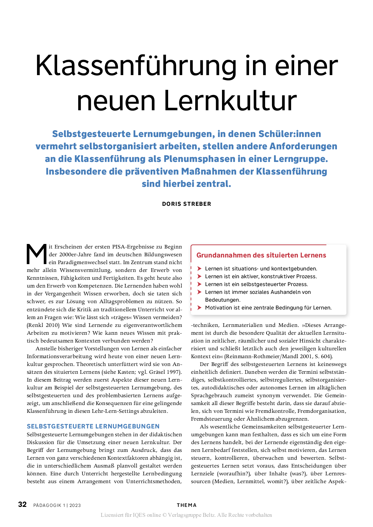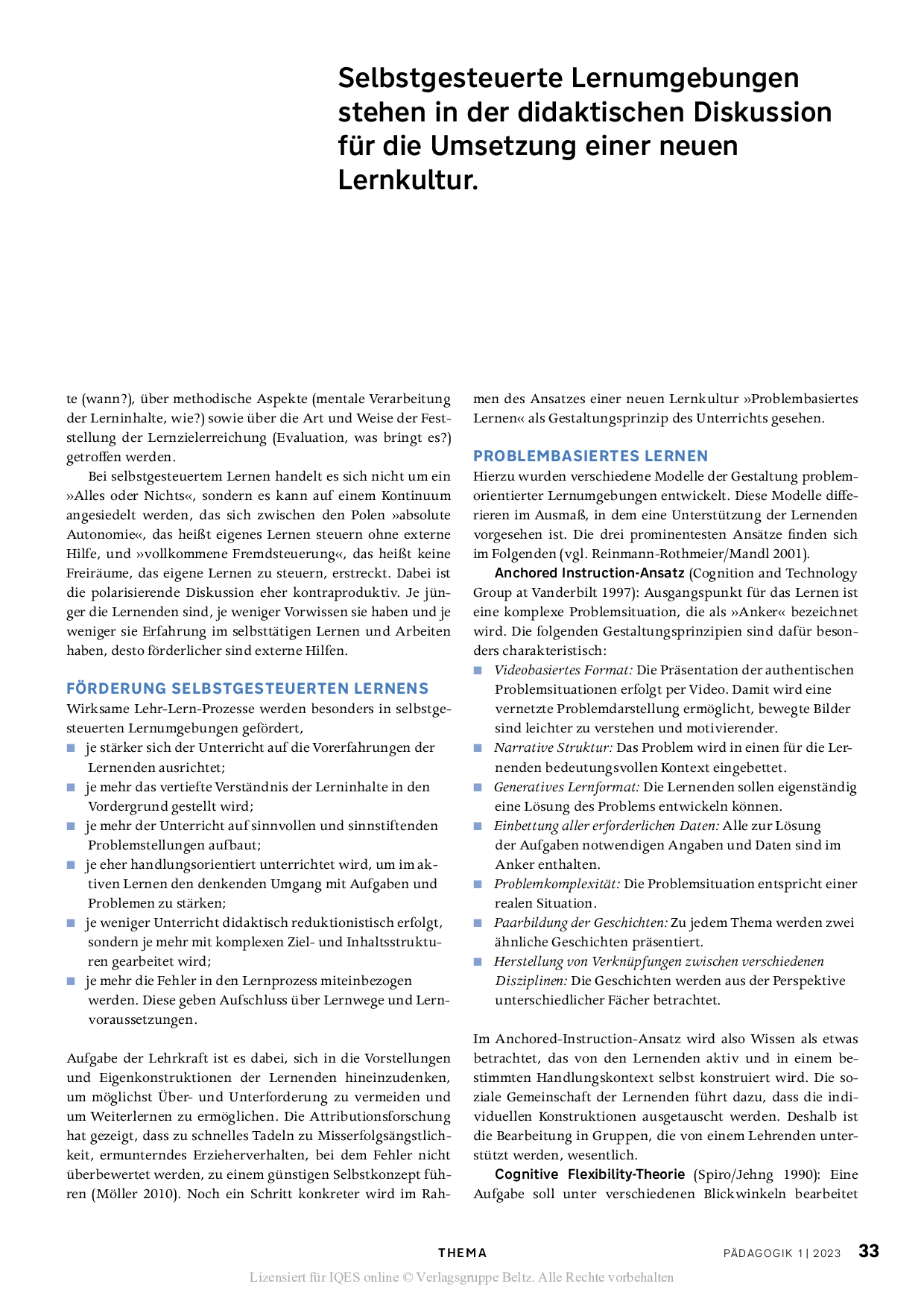 Aus Sicht der systemisch-konstruktivistischen Didaktik gilt der Grundsatz, dass der Mensch zwar lernfähig, zugleich aber auch unbelehrbar ist. Die Ermöglichungsdidaktik setzt ihren Fokus deshalb auf das Individuum mit seinen subjektiven Entwicklungs- und Lernprozessen. Die Selbststeuerung der Lernenden steht dabei im Mittelpunkt, sodass Pädagog*innen nicht (be-)lehrend, sondern begleitend agieren sollten, um selbstständiges Lernen auch tatsächlich zu ermöglichen. Rolf Arnold & Michael Schön beschreiben in ihrem Beitrag Gestaltungsprinzipien von Lernarrangements, die lebendiges und nachhaltiges Lernen fördern. Lehrpersonen, die sich als Lernbegleiter*innen verstehen, versuchen gezielt, die Selbstwirksamkeitsgefühle und das Selbstbewusstsein der Lernenden aktiv zu stärken. Ihre Aufgabe liegt primär darin, analoge wie auch digitale Lernräume so zu gestalten und arrangieren, dass diese bei den Lernenden SPASS wecken. Das Akronym SPASS steht dabei für die Kriterien selbstgesteuert, produktiv, aktivierend, situativ und sozial.