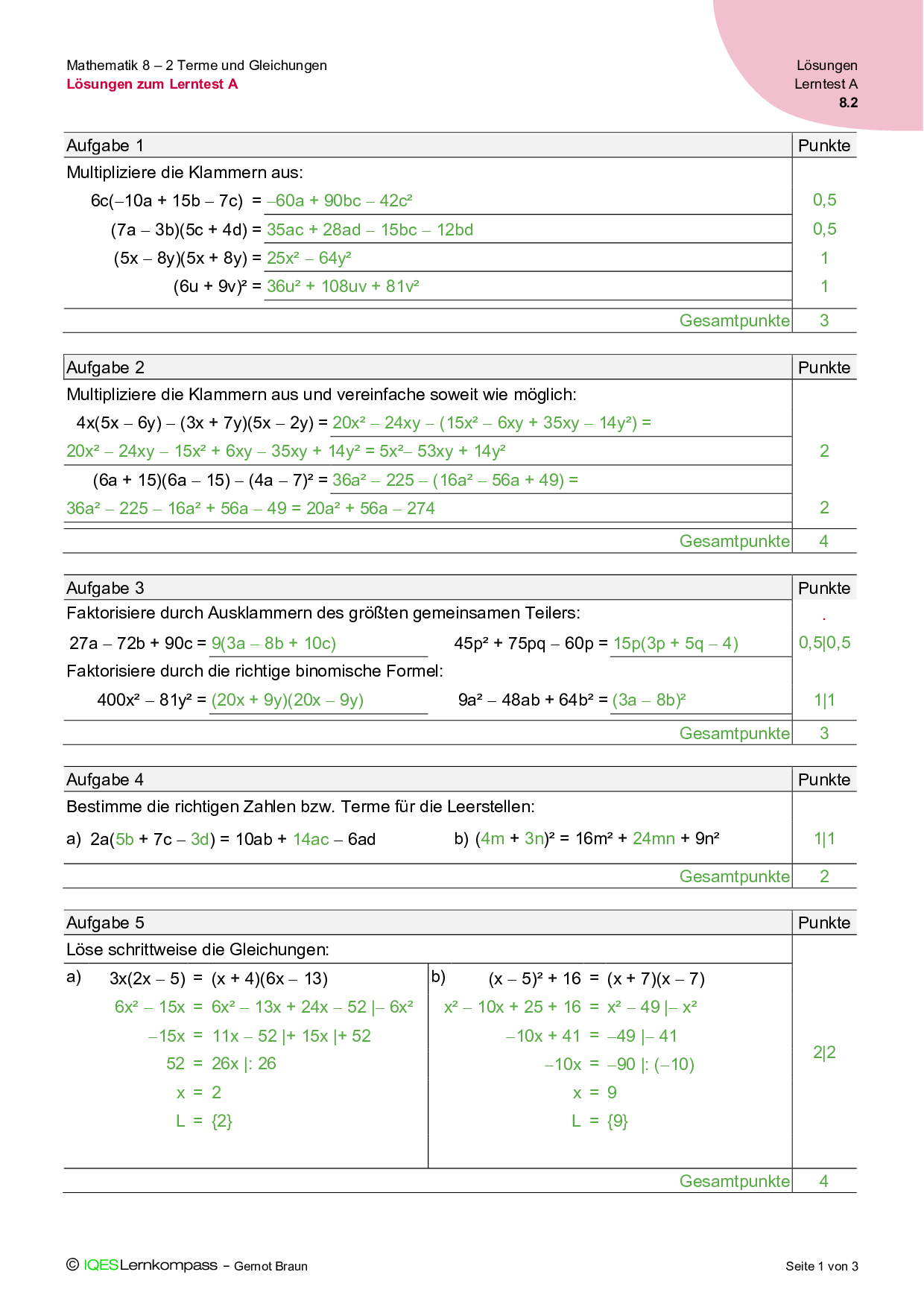 8.2 Terme und Gleichungen – Lösungen zum Lerntest A