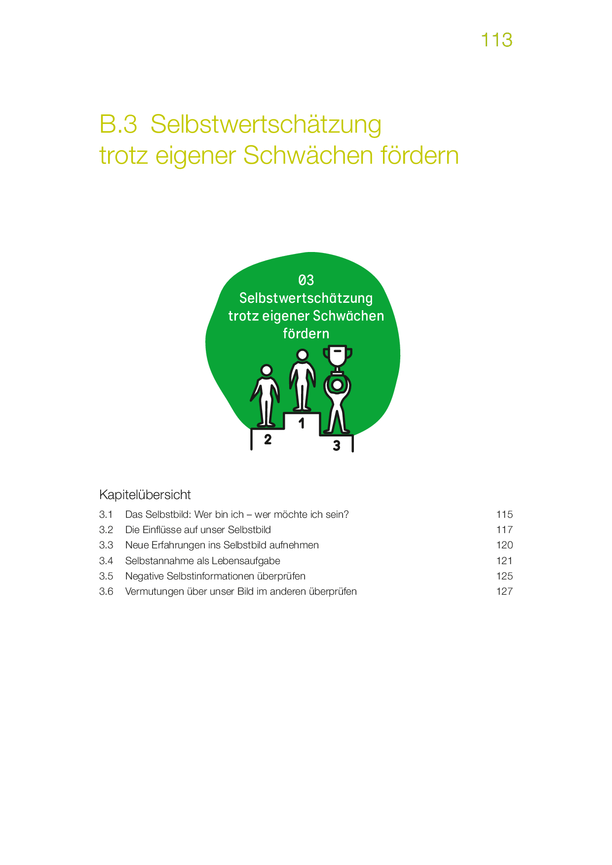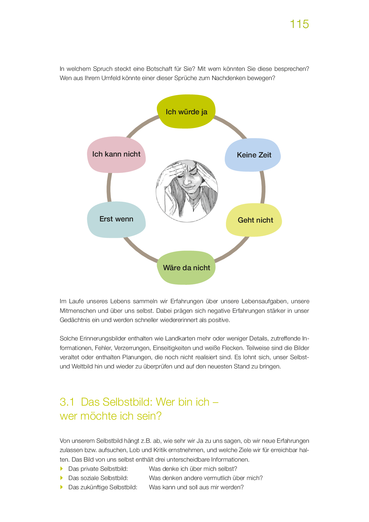 Chronische Minderwertigkeitsgefühle und Selbstabwertung lähmen uns, und verhindern Beziehungen auf Augenhöhe. Es ist eine Kunst, sich selbst trotz erkannter Fehler und Schwächen wertzuschätzen und pfleglich mit sich selbst umzugehen. Sie üben hier, ein ermutigendes Selbstbild zu pflegen und sich nicht von unerreichbaren Idealen und Forderungen sowie den vermutlichen Fremdbildern, die andere von Ihnen haben, herunter-ziehen zu lassen. Sie erkennen Einflüsse Ihrer Eltern und Lehrkräfte auf Ihr Selbstbild, überprüfen negative Selbsteindrücke auf ihre Berechtigung und lernen, eigene Fähigkeiten als persönliche Stärken kennen.