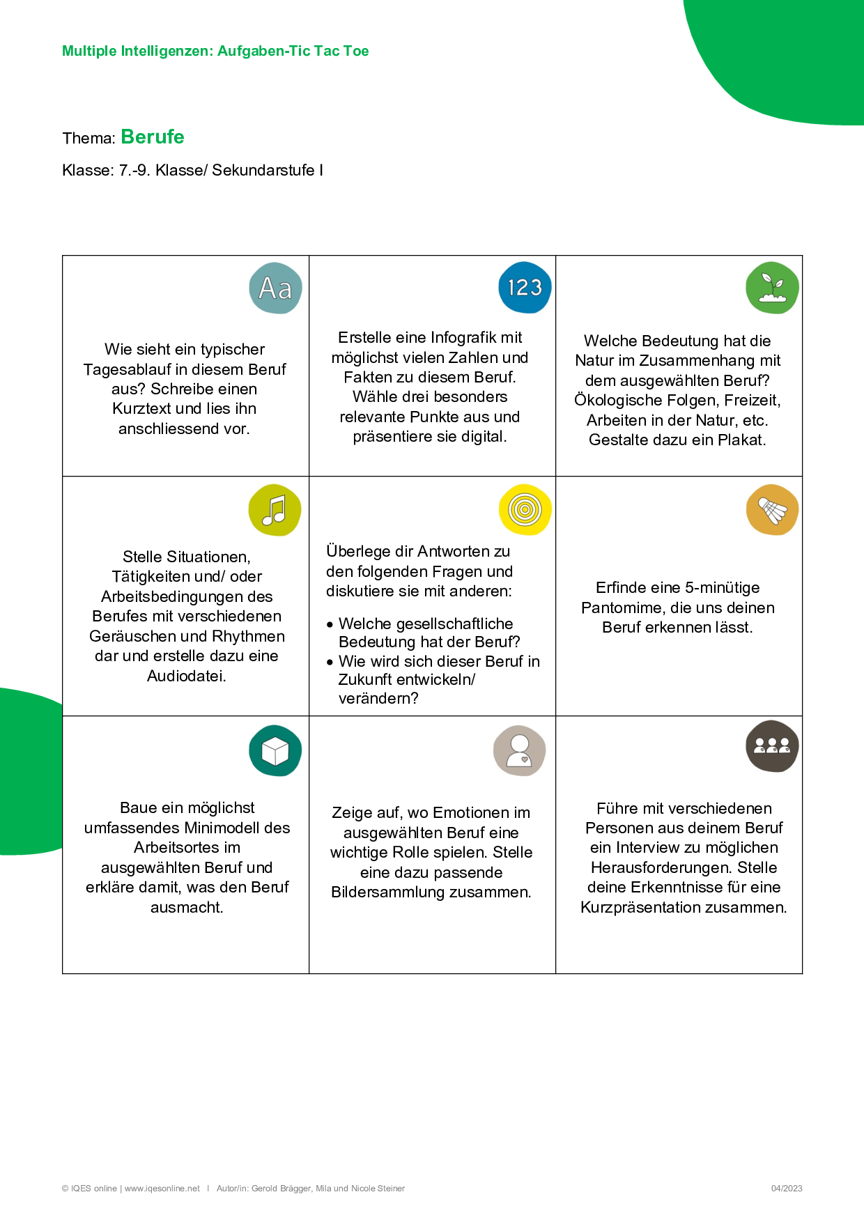 Die Schüler:innen wählen einen (Traum-)Beruf aus und lösen Aufgaben in beispielsweise selbstgewählter Reihenfolge, um so ein umfassendes Berufsbild zu entwickeln.