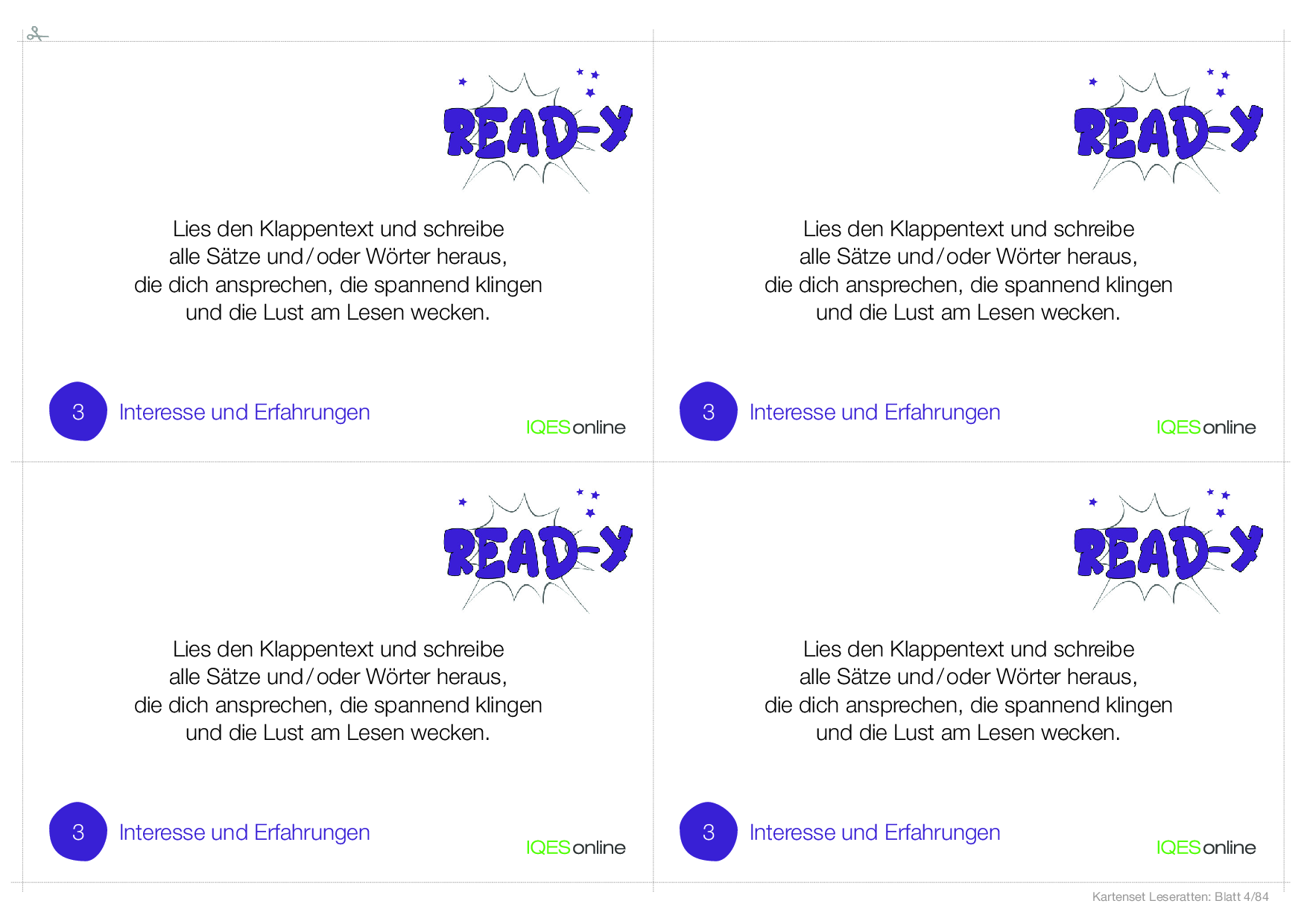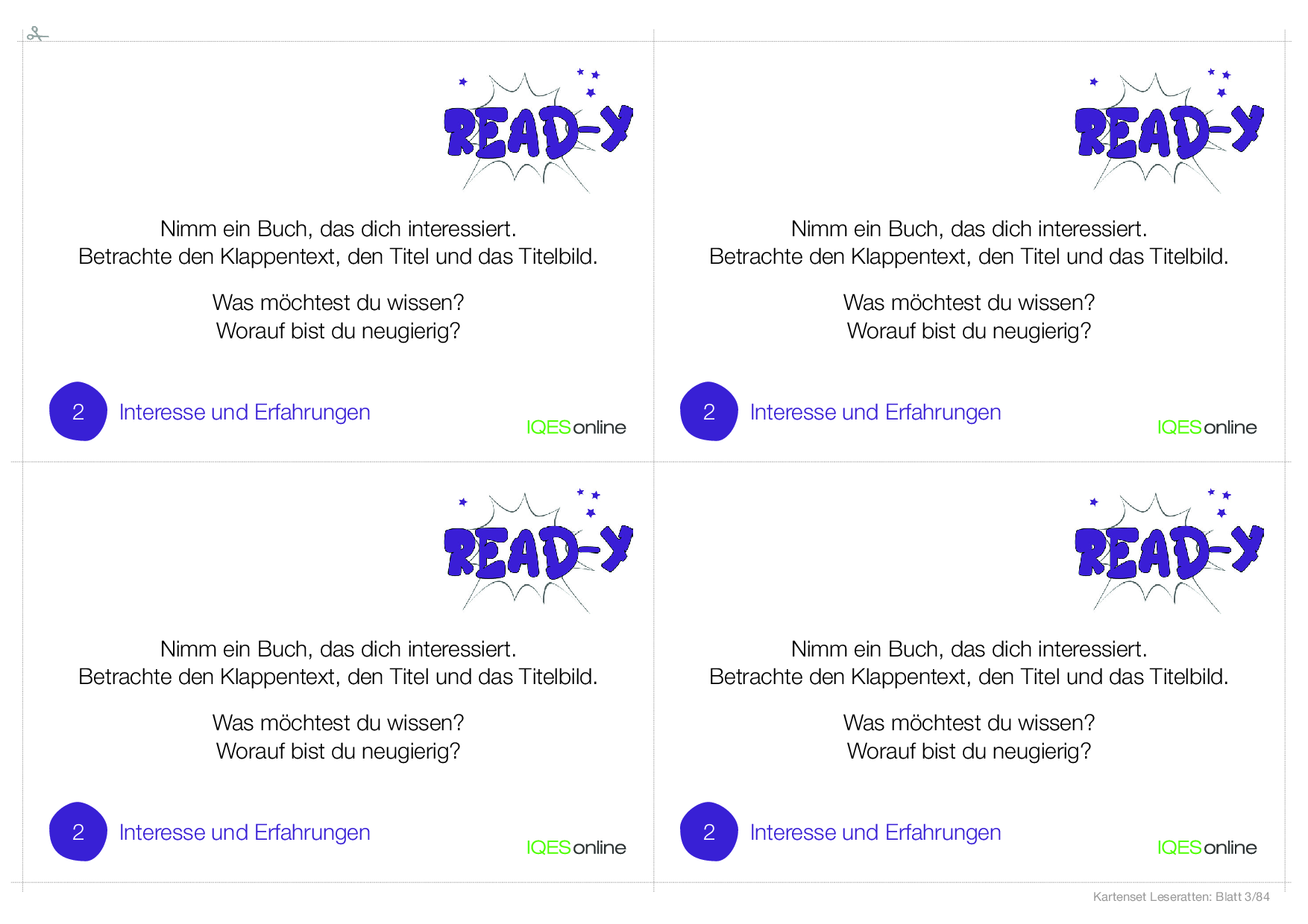 In diesem Dokument befindet sich eine Vorlage, um einen ganzen Klassensatz von Read-y Karten zu kopieren. Es befinden sich vier Karten der gleichen Karte auf einer DIN A4 Seite.