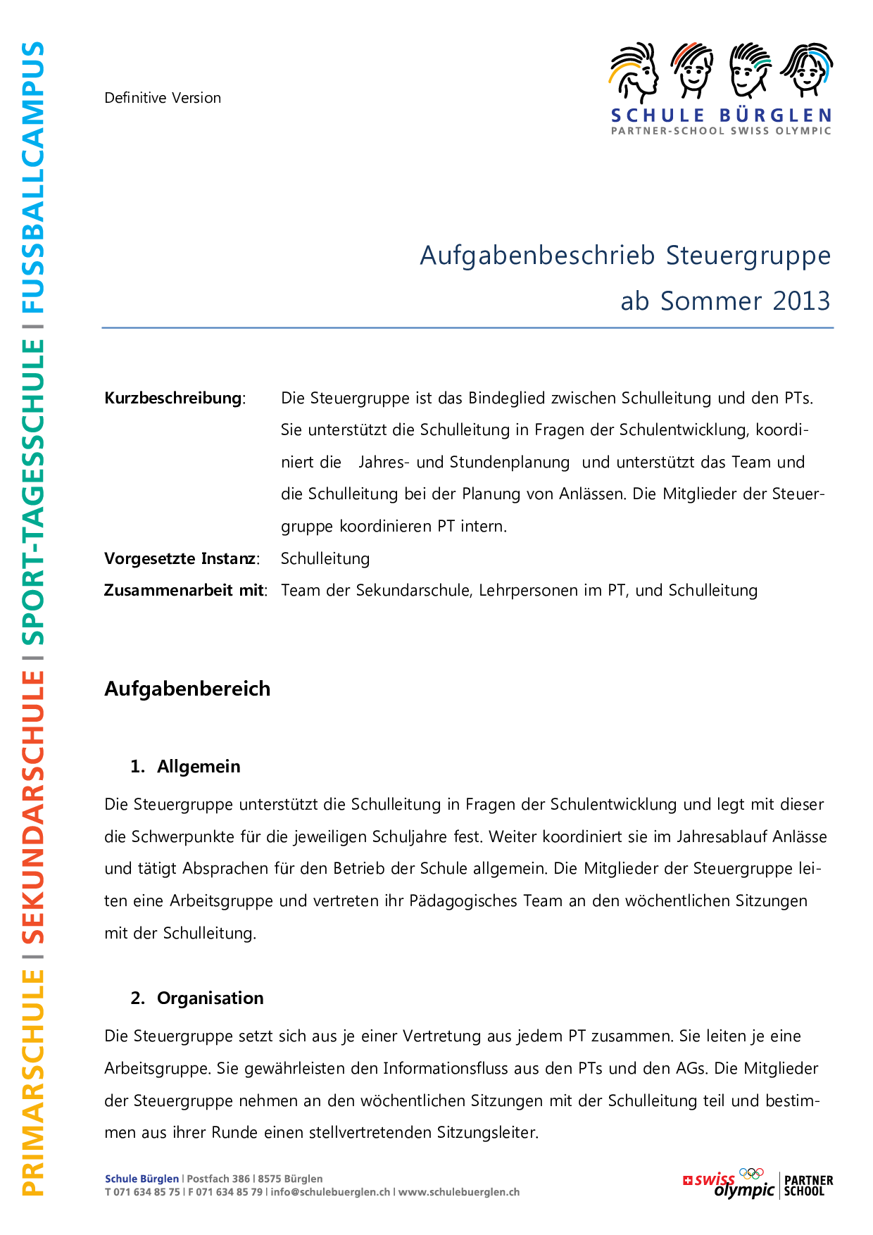 In diesem Dokument ist der Aufgabenbeschrieb der Steuergruppe an der Sekundarschule Bürglen festgehalten. Dabei wird deren Organisation, die Unterstützung der Schulentwicklung sowie die Koordination der Pädagogischen Teams definiert.