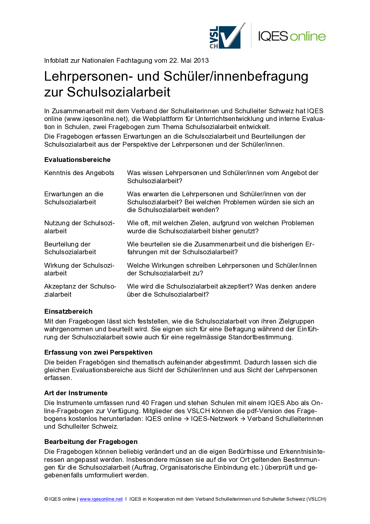 In Zusammenarbeit mit dem Verband der Schulleiterinnen und Schulleiter Schweiz hat IQES online zwei Fragebogen zum Thema Schulsozialarbeit entwickelt. Dieses Infoblatt gibt Auskunft dazu.
