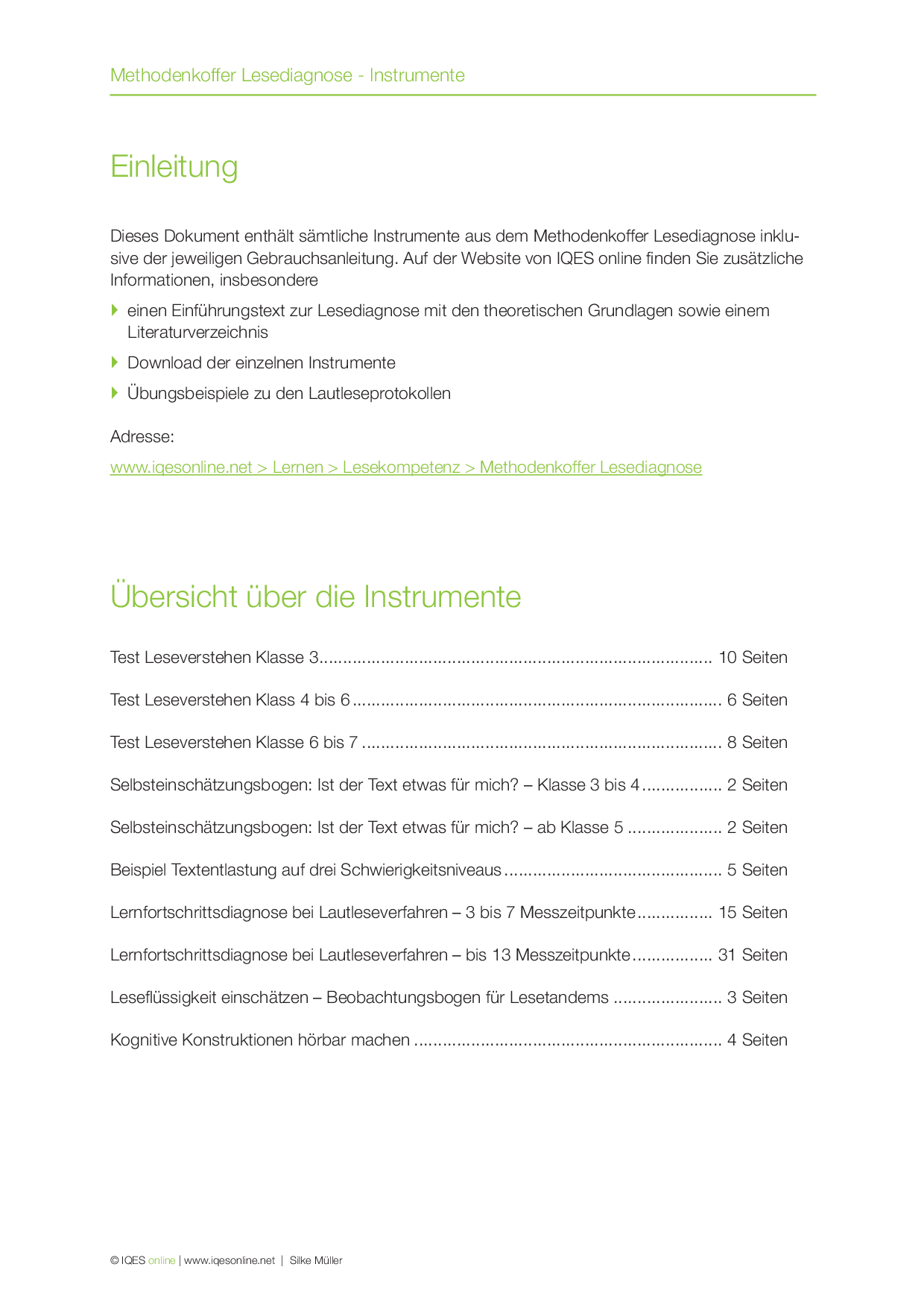 Dieses Dokument enthält sämtliche Instrumente aus dem Methodenkoffer Lesediagnose inklusive der jeweiligen Gebrauchsanleitung. Ziel ist es, damit Lesekompetenzen zu erfassen und Lernfortschritte zu dokumentieren.