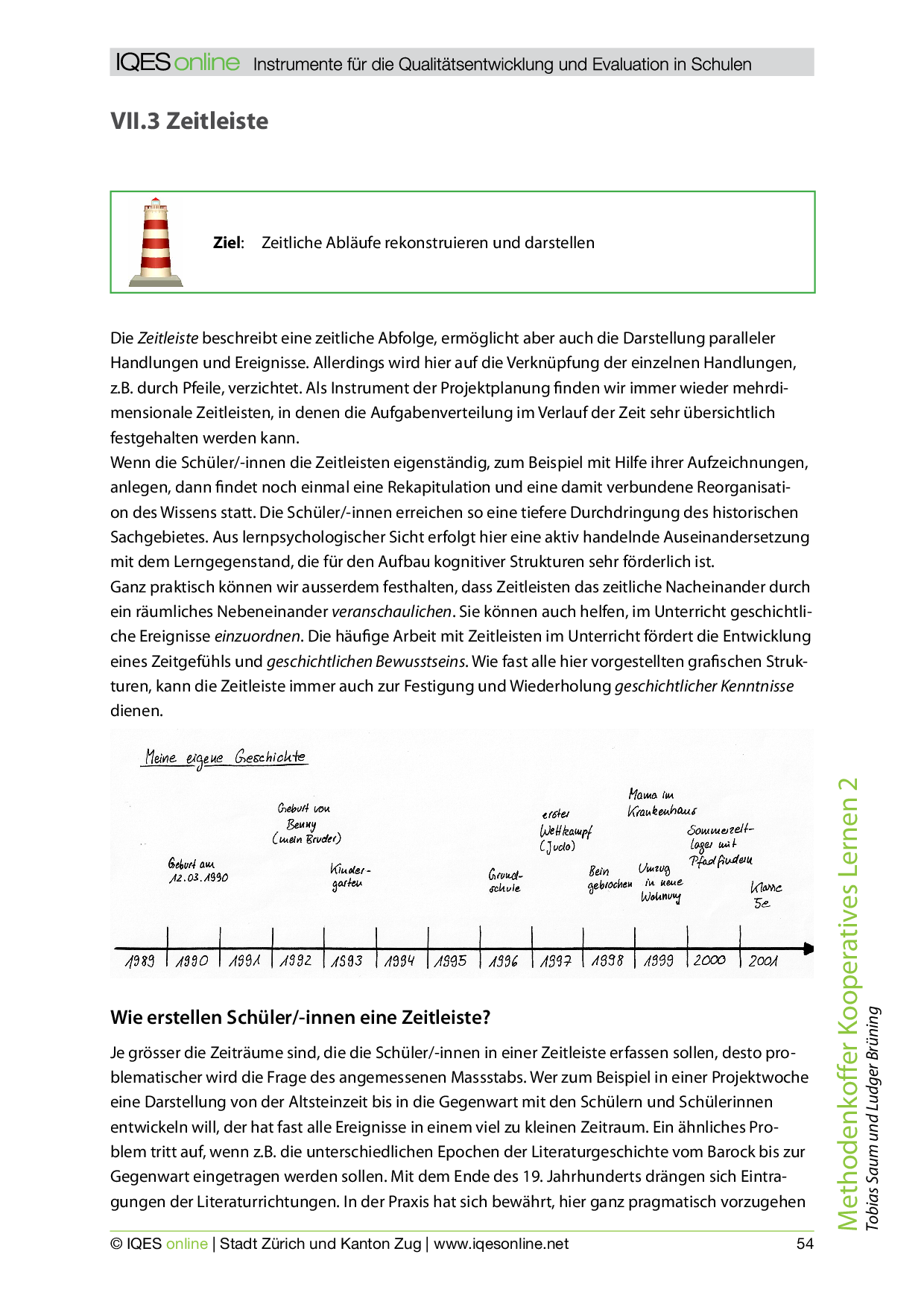 In diesem Dokument wird die Zeitleiste als Instrument für die Lernenden beschrieben. Es wird behandelt, wie Schülerinnen und Schüler eine solche erstellen können und welche Anwendungsmöglichkeiten im Fachunterricht bestehen.