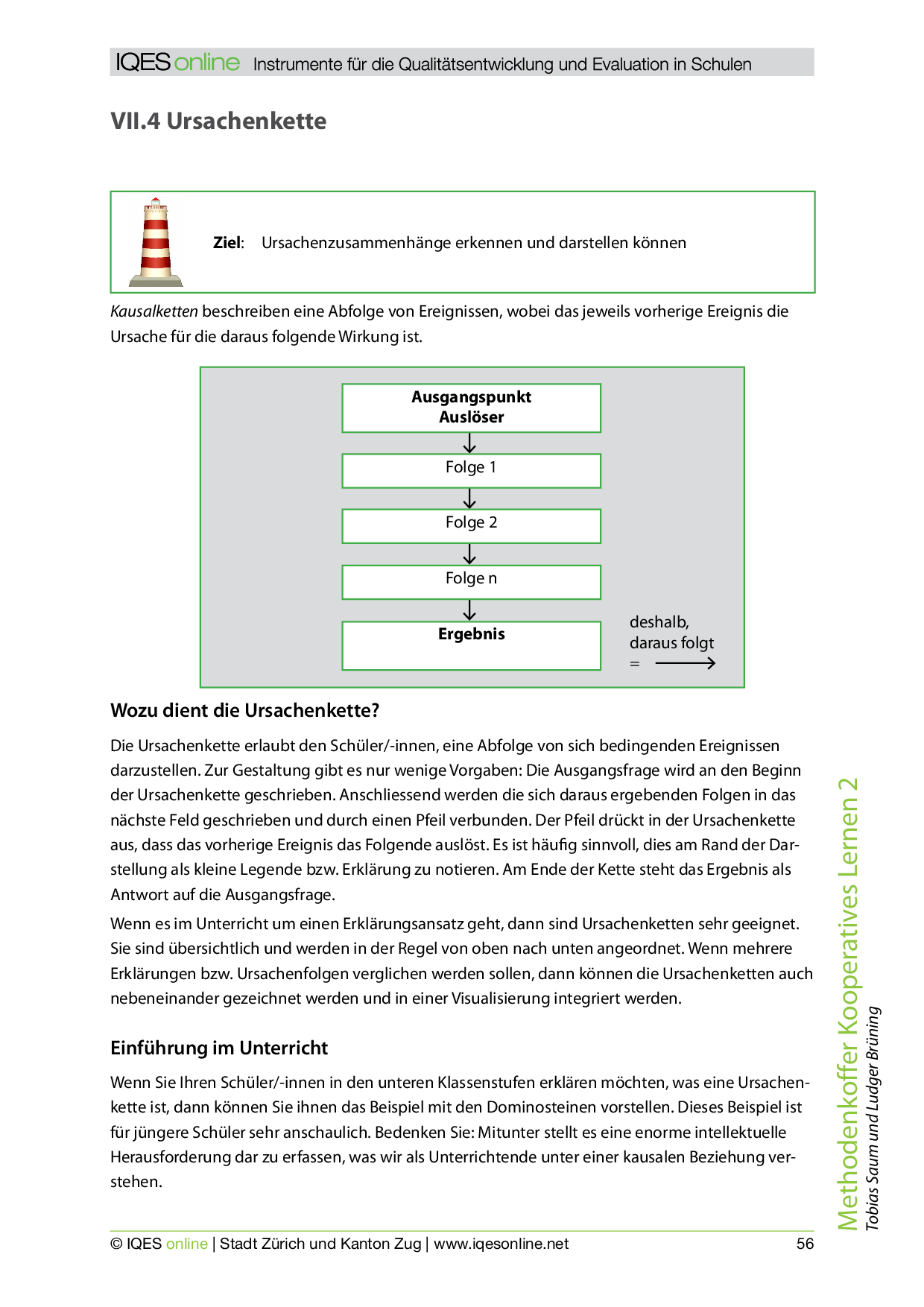 In diesem Dokument erkären Ludger Brüning und Tobias Saum Ablauf und Anwendungsgebiete der Kooperativen Lernmethode Ursachenkette. Dabei stellen die Schüler und Schülerinnen eine Abfolge von sich bedingenden Ereignissen visuell dar.