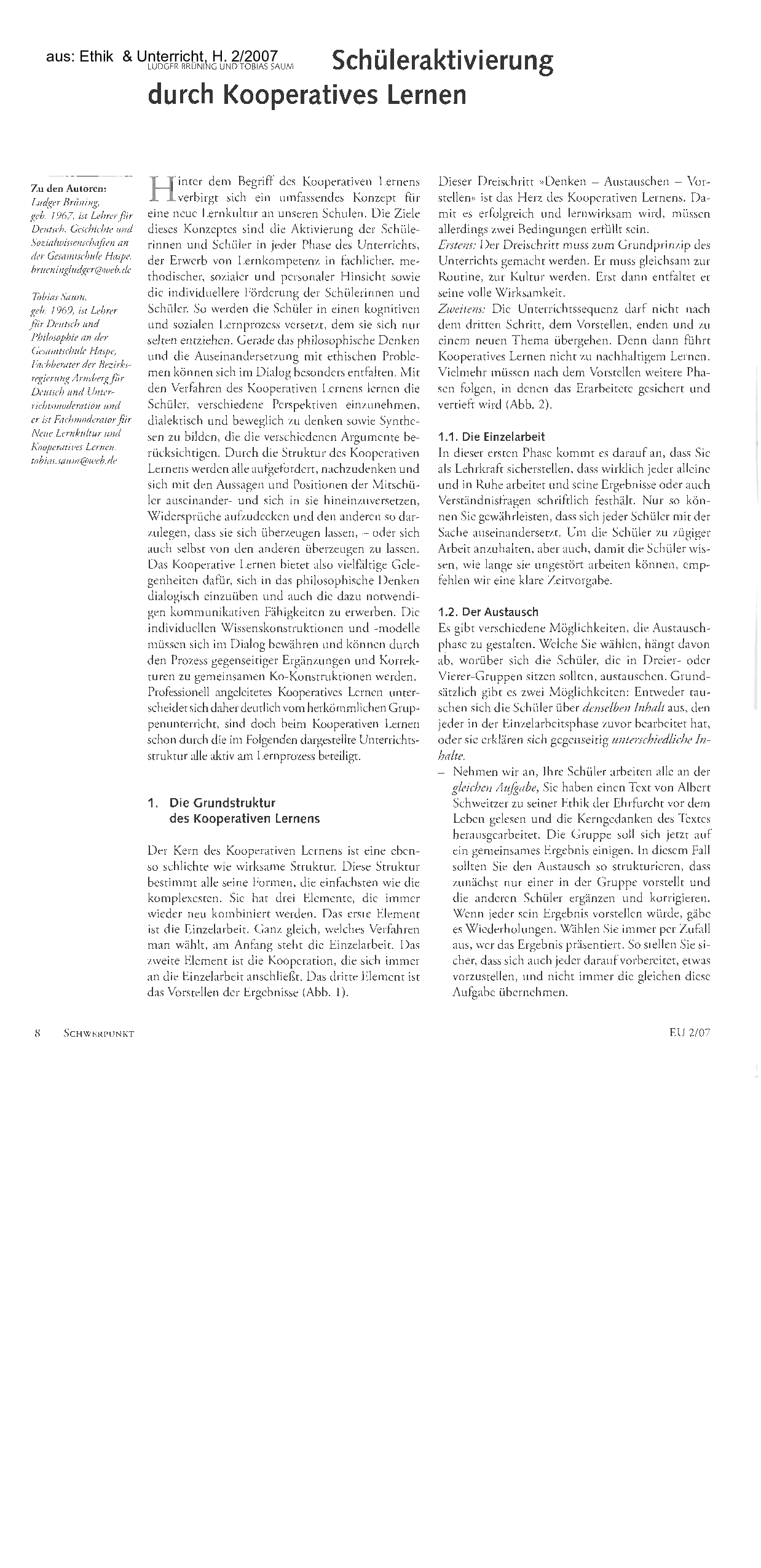 Dieser Fachartikel befasst sich mit den Nutzen des Kooperativen Lernens für den Philosophieunterricht. Es wird der Gesamtprozess des KL vorgestellt, wie auch konkrete Verfahren zu dessen Anwendung.