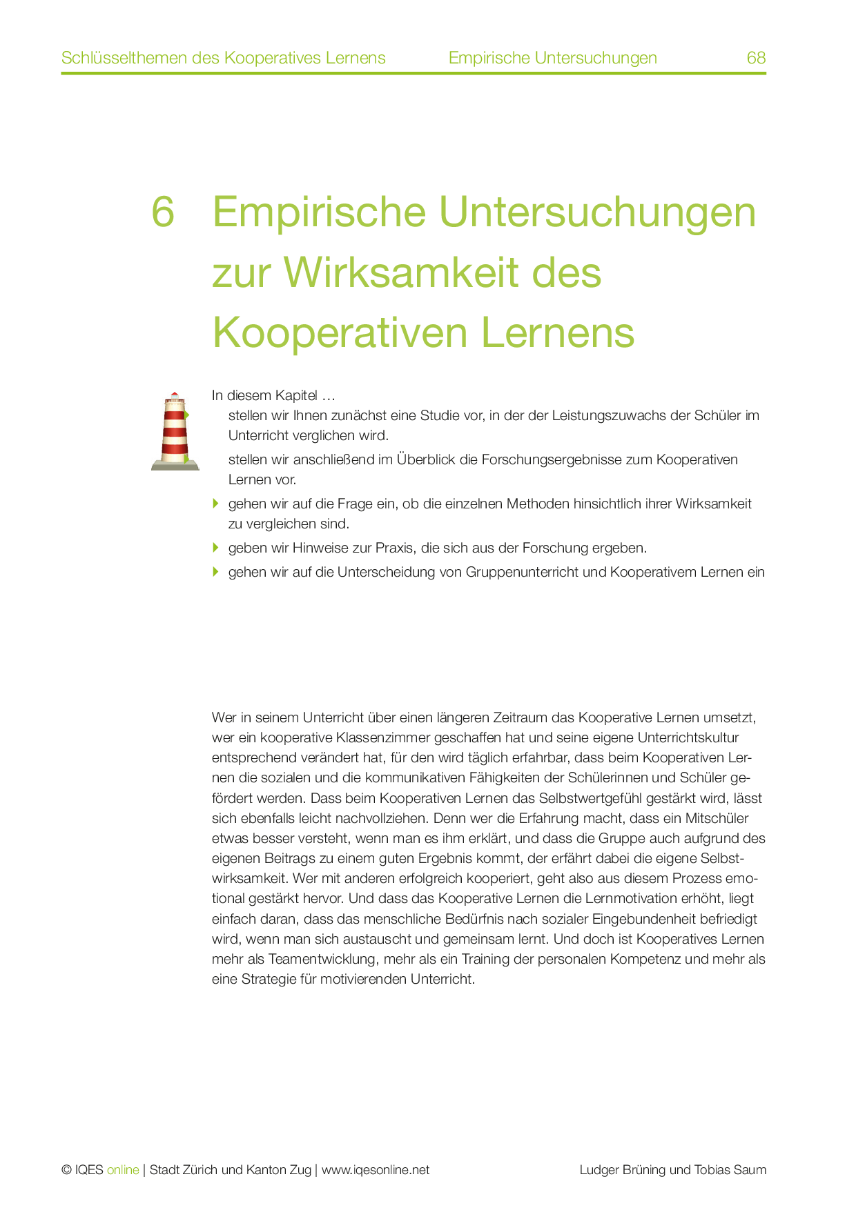 In diesem Kapitel erhalten Sie einen Überblick über die bisherigen Forschungsergebnissen zum Kooperativen Lernen. Es wird auf eine Studie von Shlomo Sharan und Hana Shachar (USA 1988) eingegangen. Sharan und Shachar konnten nachweisen, dass der Leistungszuwachs von Schülerinnen und Schülern in kooperativen Settings deutlich höher war als in rein frontalen Unterrichtsformen.