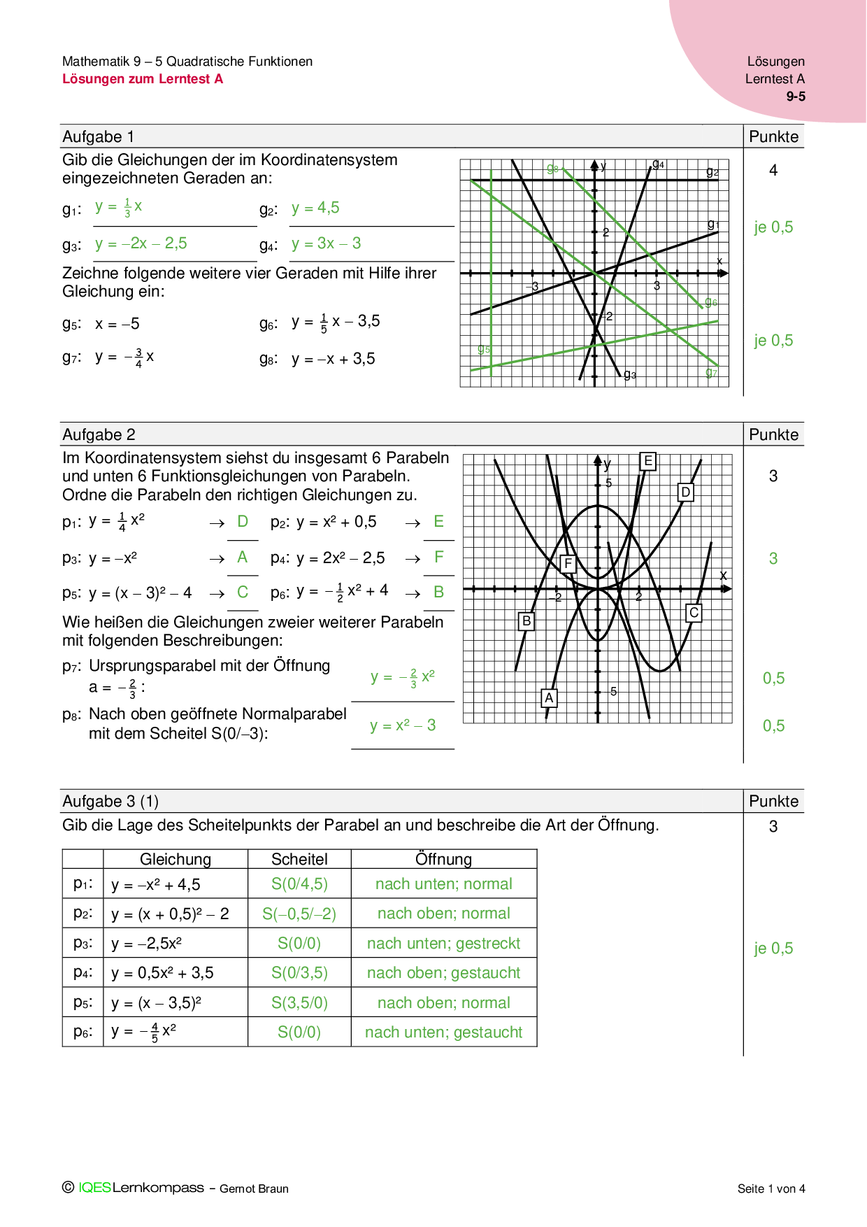 9.5 Quadratische Funktionen - Lösungen zum Lerntest A