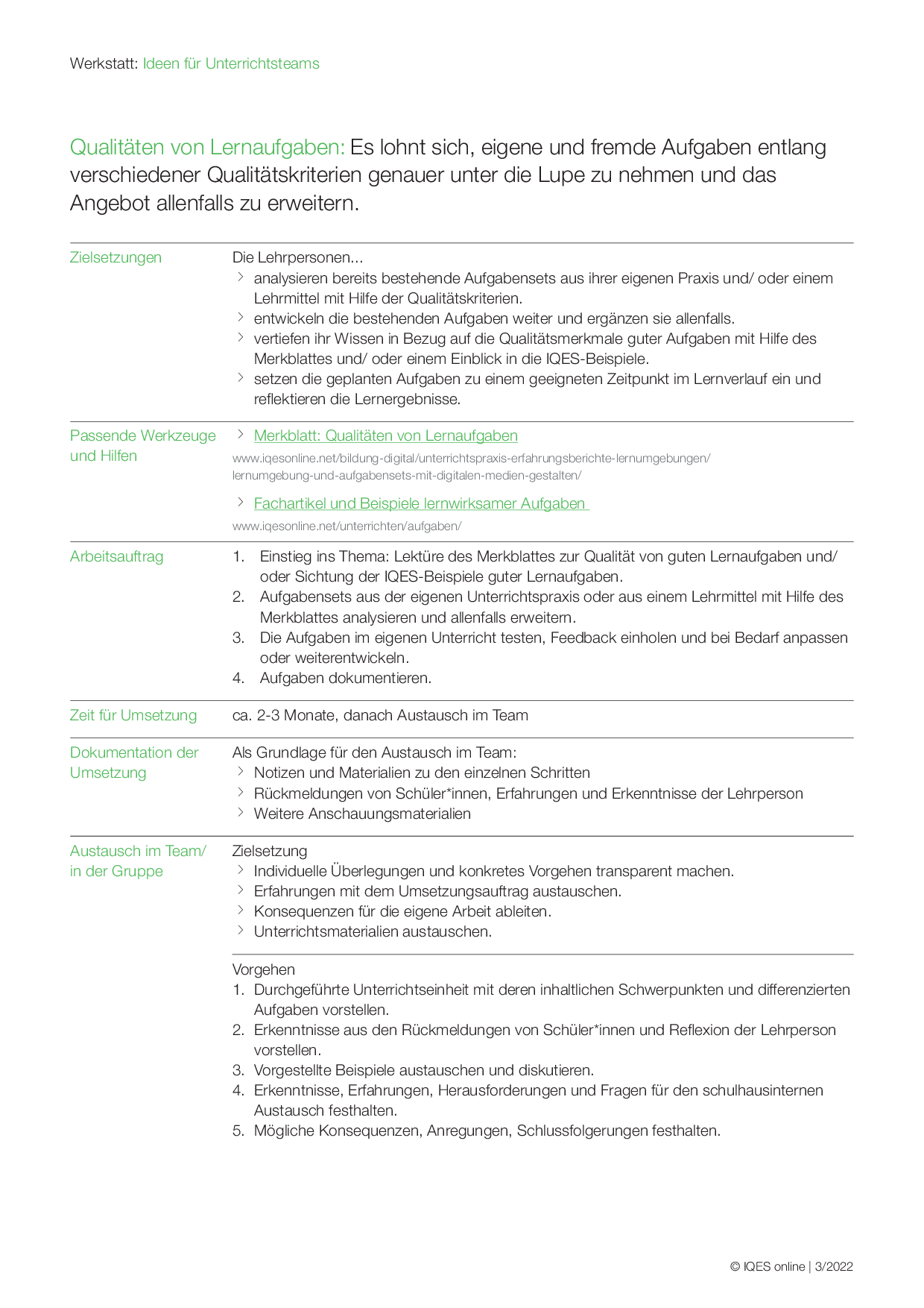Für die Gestaltung eines kompetenzorientierten Unterrichts rücken Aufgaben in den Blickpunkt. Es geht einerseits darum, Aufgaben auszuwählen, die den Aufbau von Kompetenzen fördern und unterstützen. Lehrkräfte müssen jedoch nicht nur beurteilen können, ob eine Aufgabe »gut« oder »schlecht« ist, sondern sie müssen diese hinsichtlich der Funktion im Lernprozess einschätzen können. So fällt der Blick auf die gesamte Aufgabenkultur. Denn beim Lernen geht es nicht um eine Einzelaufgabe, sondern um den Umgang der Lehrkraft mit einem Set an Aufgaben im Unterrichtsprozess. Thema dieses Beitrags ist das LUKAS-Modell zur Entwicklung kompetenzfördernder Aufgabensets. Es unterscheidet sechs verschiedene Aufgabentypen in Hinblick auf deren didaktische Funktion in vollständigen Lernprozessen und dient der Gestaltung von kompetenzorientierten Unterrichtseinheiten. Digitale Medien können die Unterrichtsqualität steigern, wenn sie in Hinblick auf die didaktische Funktion von Aufgaben im Lernprozess gezielt integriert werden.