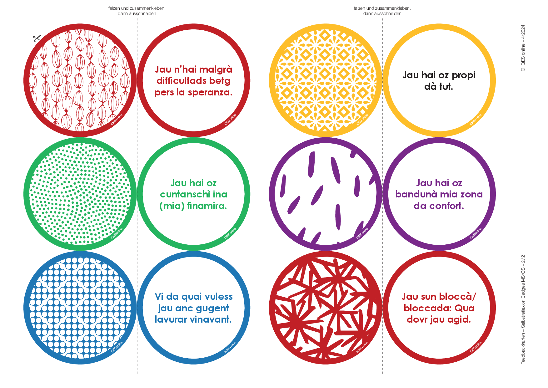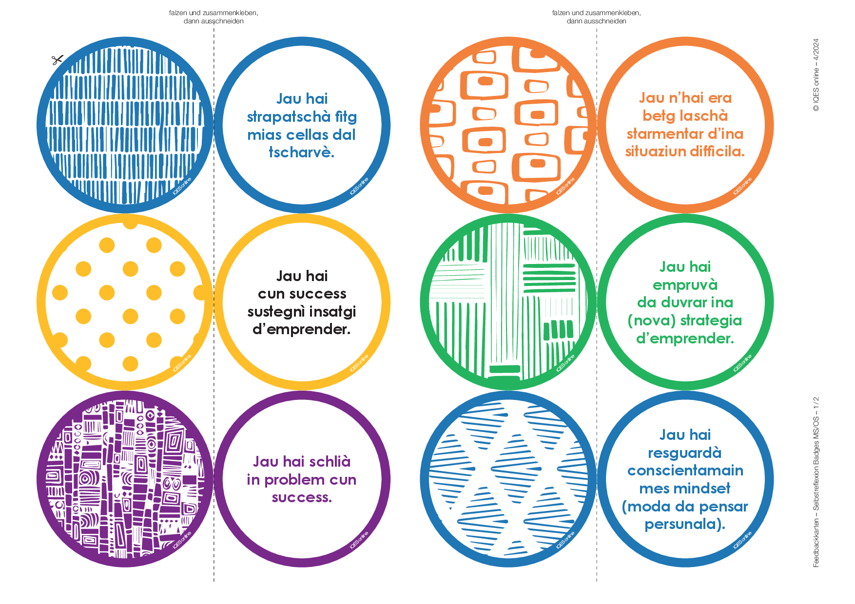 Diese Karten sind für die mündliche oder schriftliche Selbstreflexion, als Denkanstoss, Sprech- und Schreibanlass einsetzbar. Zudem bieten sie die Möglichkeit für Schülerinnen und Schüler ebenso wie für Lehrpersonen, alleine oder gemeinsam über das Lernen nachzudenken, den eigenen Lernprozess oder den Unterricht sichtbar werden zu lassen. Als Badges werden sie auch zu Orientierungspunkten und Begleitern für eigene Lernziele.