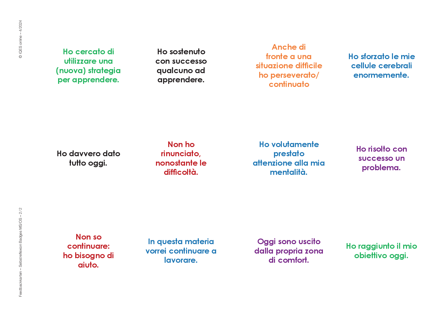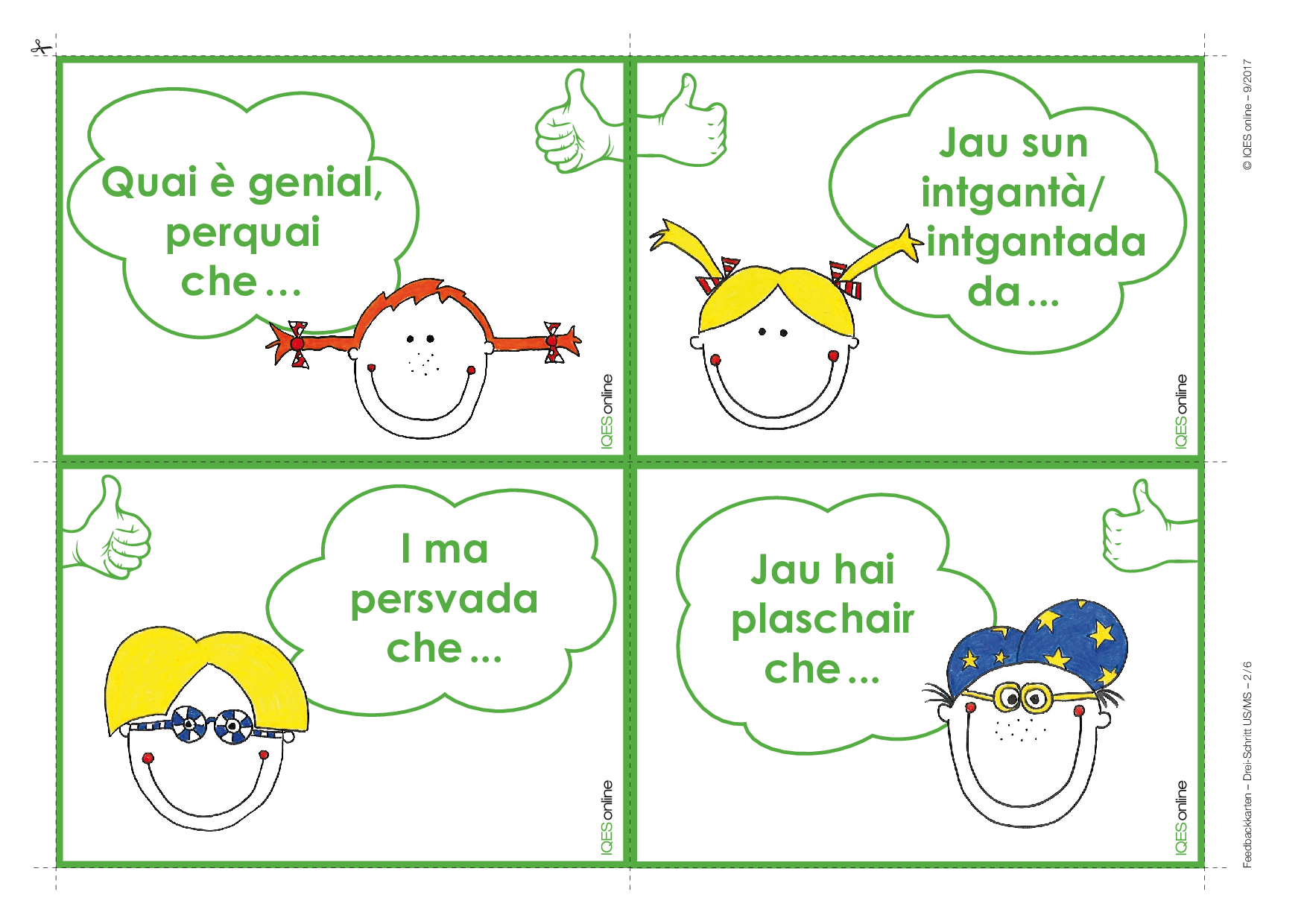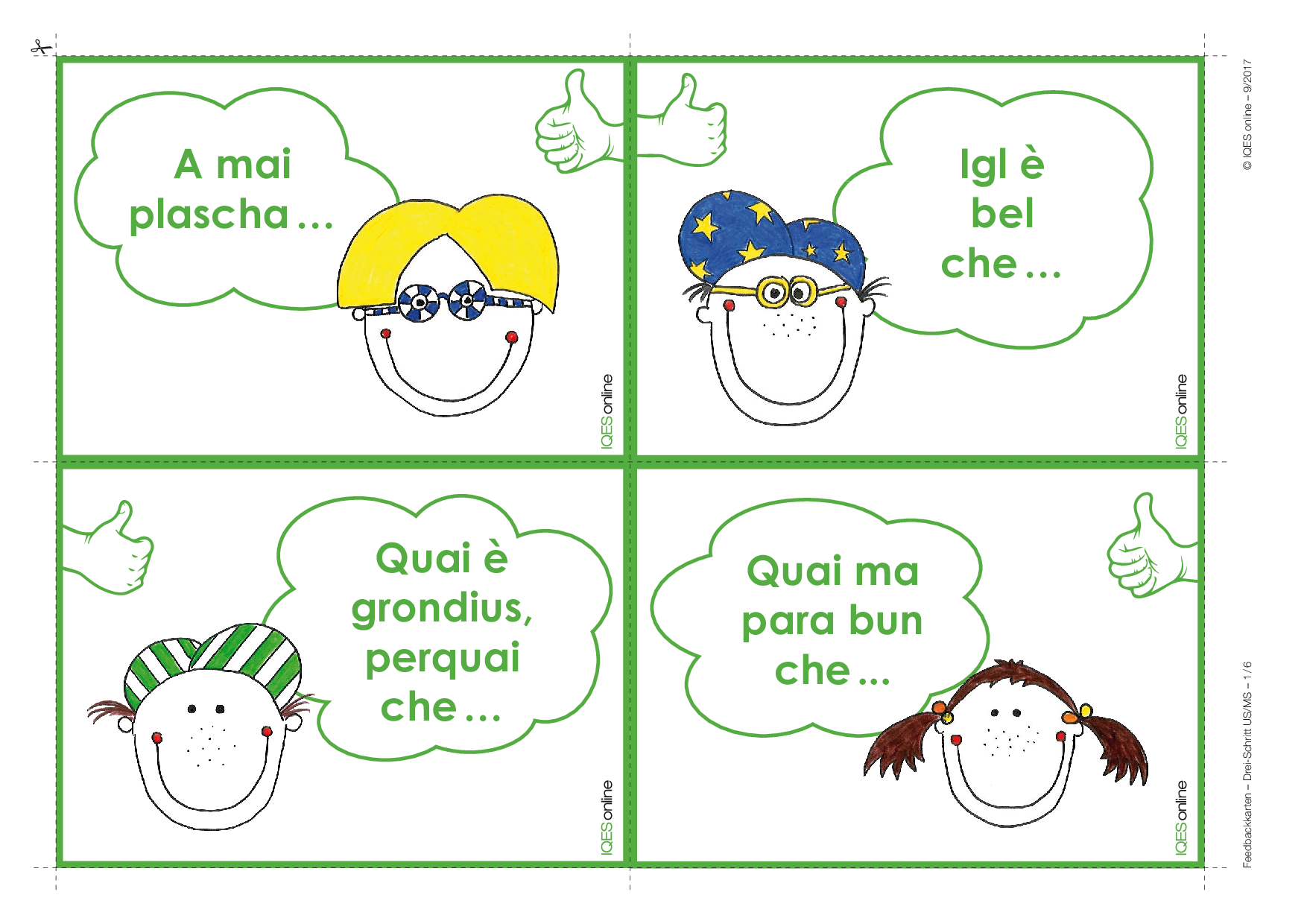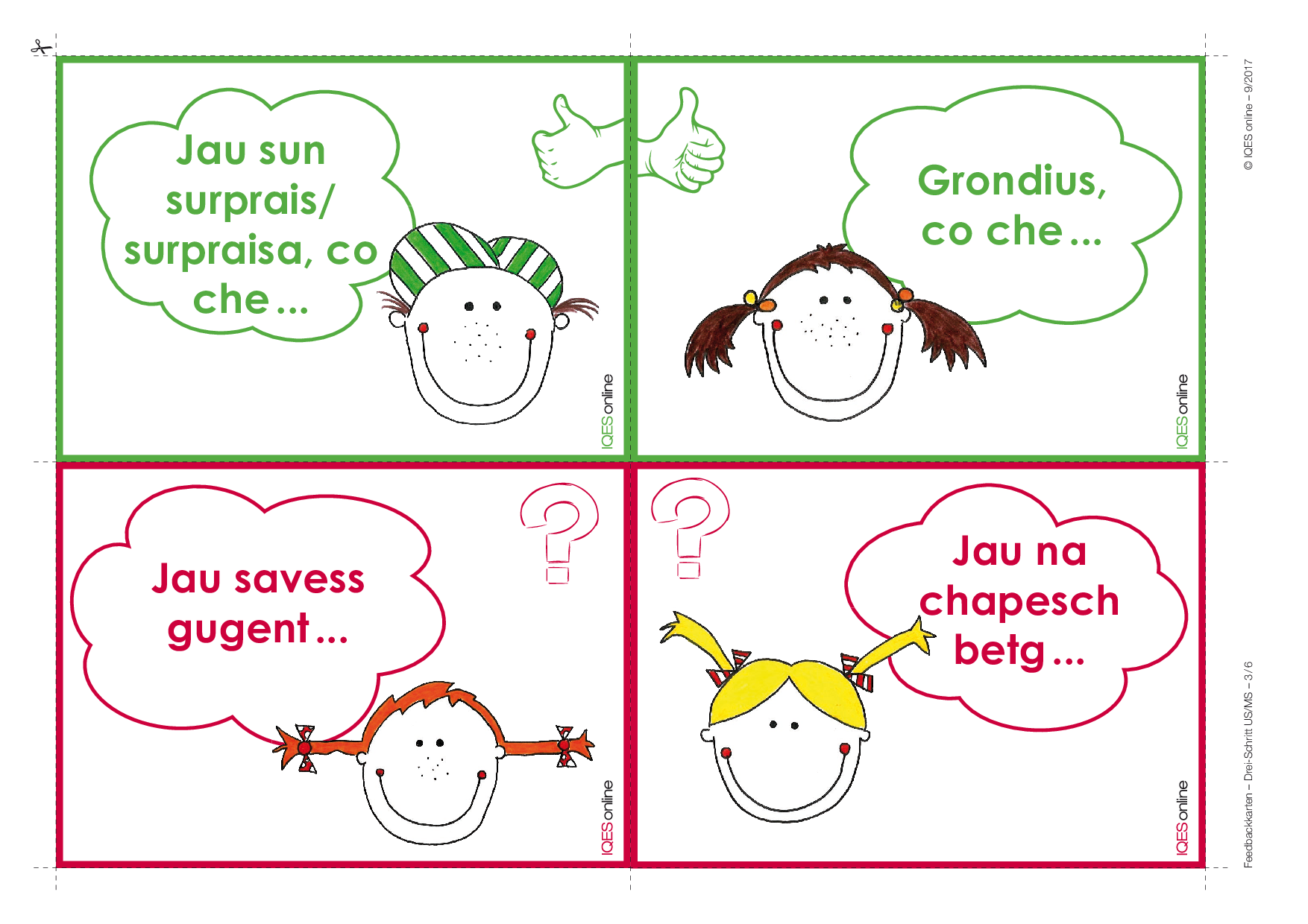 Diese Karten ermöglichen ein gutes Feedback. Sie können aber auch als Mittel zur mündlichen oder schriftlichen Selbstreflexion eingesetzt werden, sind Denkanstoss, Sprech- und Schreibanlass und bieten die Möglichkeit, alleine oder gemeinsam über das Lernen nachzudenken, den eigenen Lernprozess sichtbar werden zu lassen.