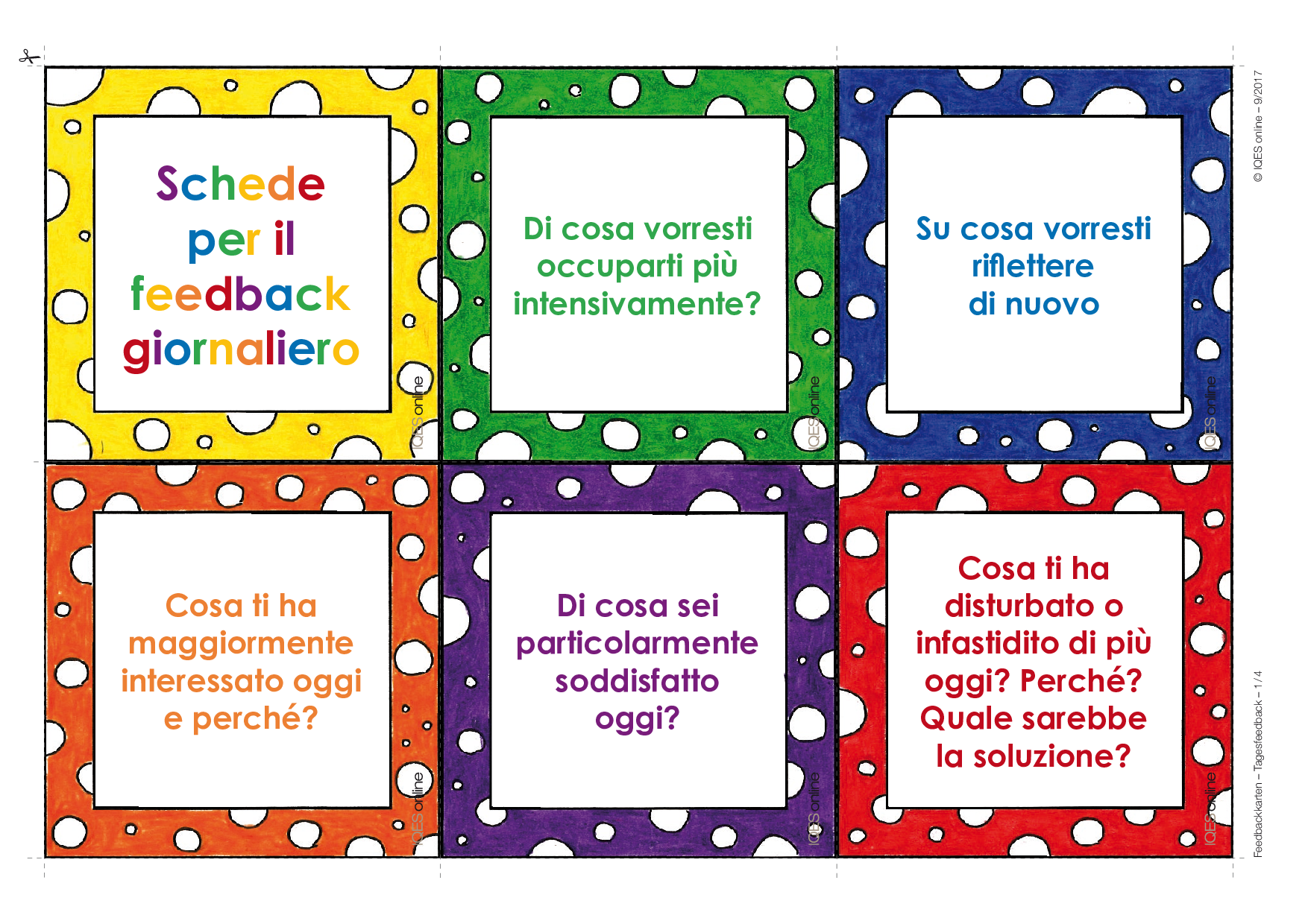 Diese Tagesfeedbackkarten in Italienisch ermöglichen Feedback in Kurzform. Zusätzlich eignen sie sich natürlich auch als (länger dauernde) Denkanstösse, Lernbegleiter, Sprech- und Schreibanlässe.