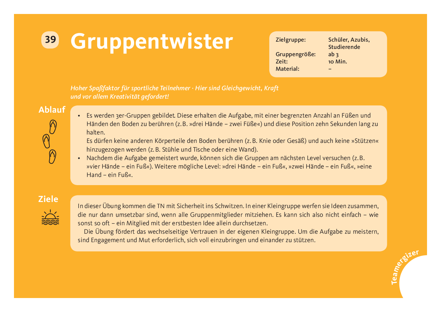 Diese Übung sollte allen Teilnehmenden die Chance bieten, einen Erfolg zu verbuchen. Daher sollte mit einem leichten Einsteiger-Level begonnen werden. Wenn dann die Schwierigkeitsgrade sukzessive erhöht werden, steigen die einzelnen Gruppen nach und nach aus und haben dennoch einen Teilerfolg erzielt und das ihnen Mögliche erreicht. Und die besonders sportlichen oder ehrgeizigen Gruppen werden ebenfalls bis zum Schluss gefordert. Die Übung lässt sich tatsächlich bis zum Level »1 Fuß« steigern (so von uns erlebt bei einem großen, kräftigen Schüler und zwei kleinen, zierlichen Mitschülerinnen, die er jeweils unter den Arm genommen und sich dann für zehn Sekunden auf ein Bein gestellt hat). Im Anschluss an die Übung bietet es sich an, dass die Kleingruppen eine seminar- oder unterrichtsbezogene Aufgabe bearbeiten sollen. Denn die Erfahrung, dass sie miteinander Lösungen entwickeln und Aufgaben meistern können, haben sie ja nun bereits gemacht.