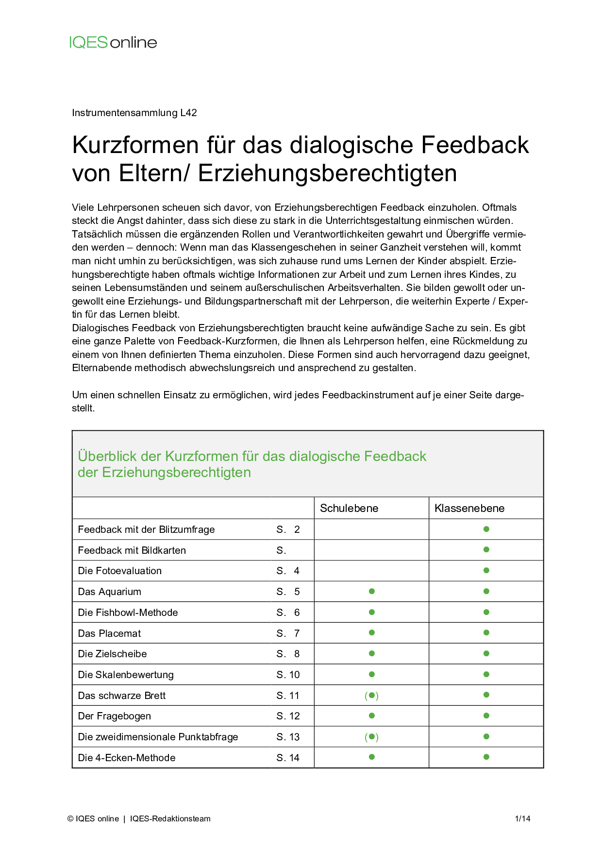 Die meisten Instrumente können sowohl auf Schulebene wie auch auf der Klassenebene eingesetzt werden. Mit diesen Feedback-Kurzformen können Schulleitungen und Lehrer/innen mehr über darüber erfahren, wie Eltern Schule und Unterricht wahrnehmen und welche Anliegen und Wünsche sie haben. Die Kurzfeedbackformen haben sich auch für das Feedback von Eltern aus bildungsfernen Schichten bewährt.