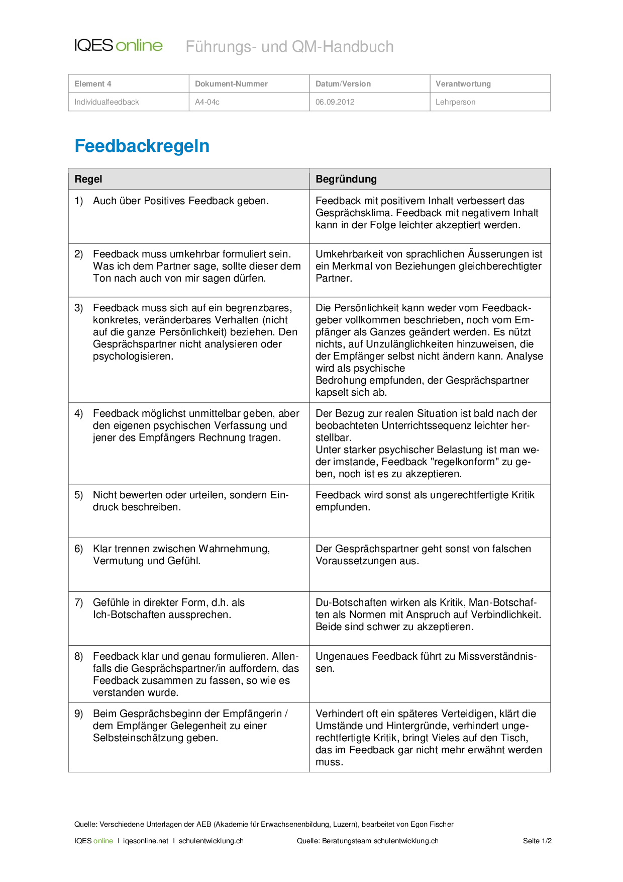 Damit Feedback richtig ankommt, gibt es ein paar Regeln, die beachtet werden sollten. Dazu gehört zum Beispiel, dass ein Feedback sich auf ein begrenzbares, konkretes und veränderbares Verhalten des Gesprächspartners bezieht. Die Regeln werden in diesem Dokument aufgelistet.