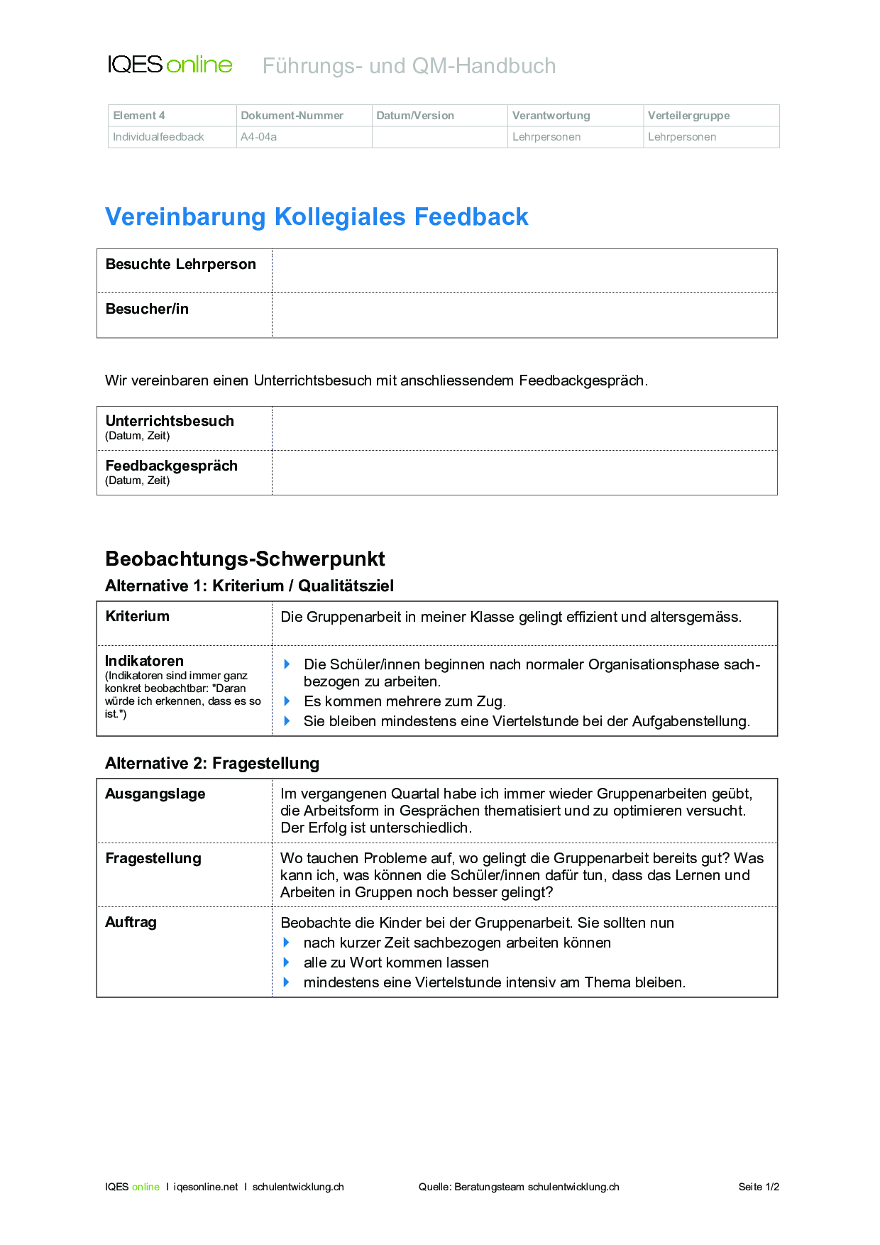 Mit diesem Formular können Vereinbarungen bezüglich eines Kollegialfeedbacks getroffen werden. So können bspw. der Qualitätsanspruch/Fokus und die Beobachtungskriterien festgelegt werden.