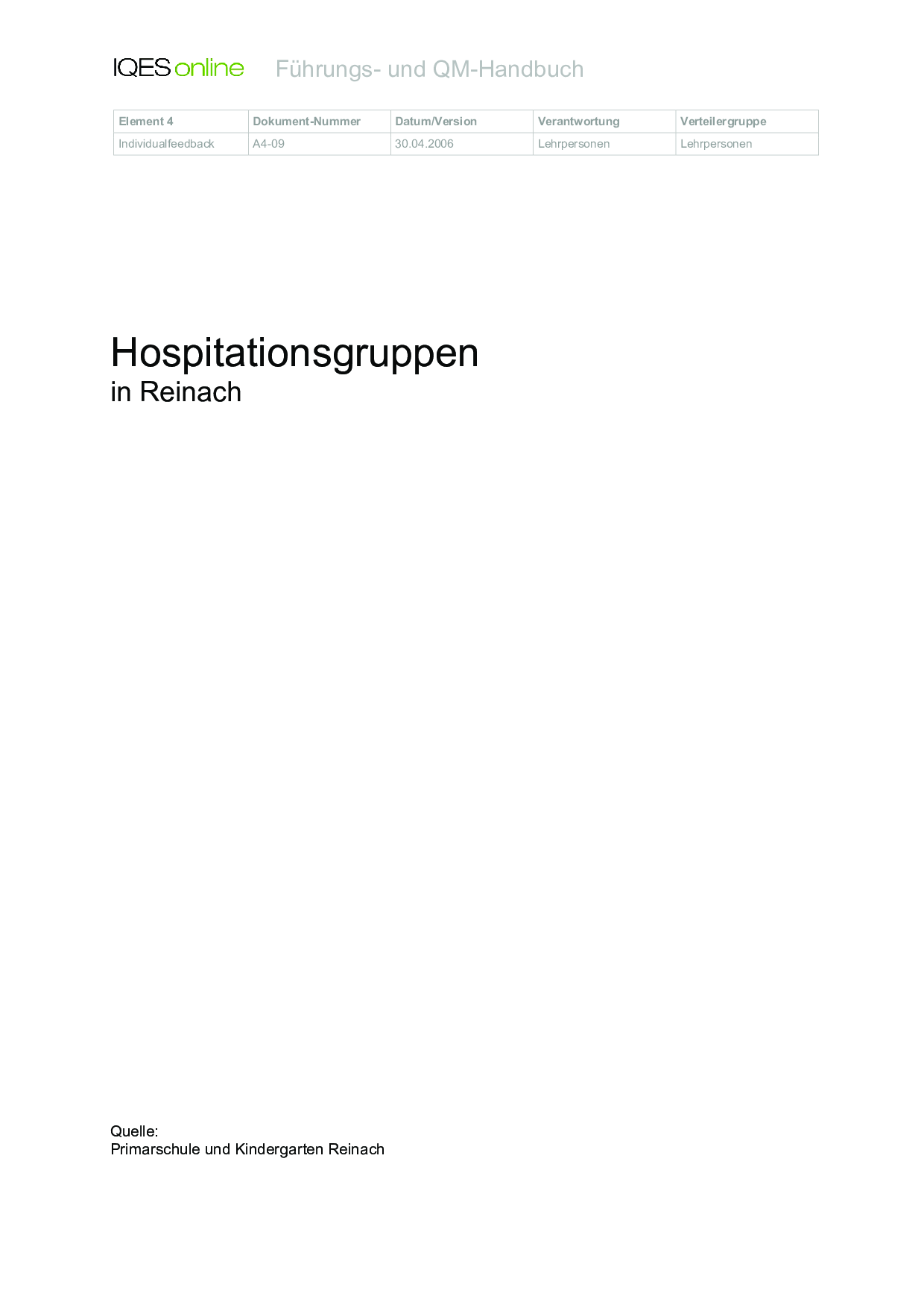 In diesem Dokument sind die Kernaufgaben und das Ablaufschema einer Hospitation der Schule Reinach festgehalten. Es wird neben der Hospitation selbst auch die Vor- und Nachbereitung thematisiert.