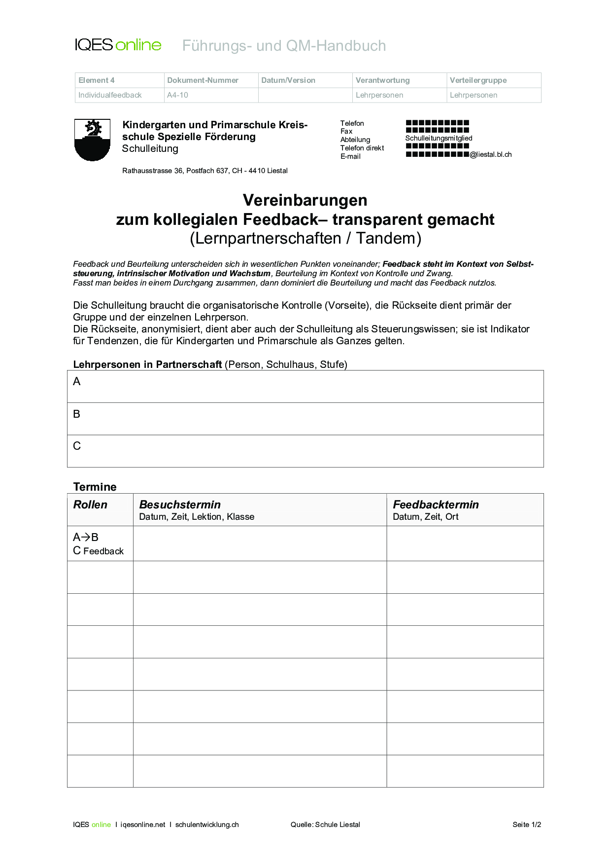 Element 4 Individualfeedback: Vereinbarung Kollegialfeedback, Liestal