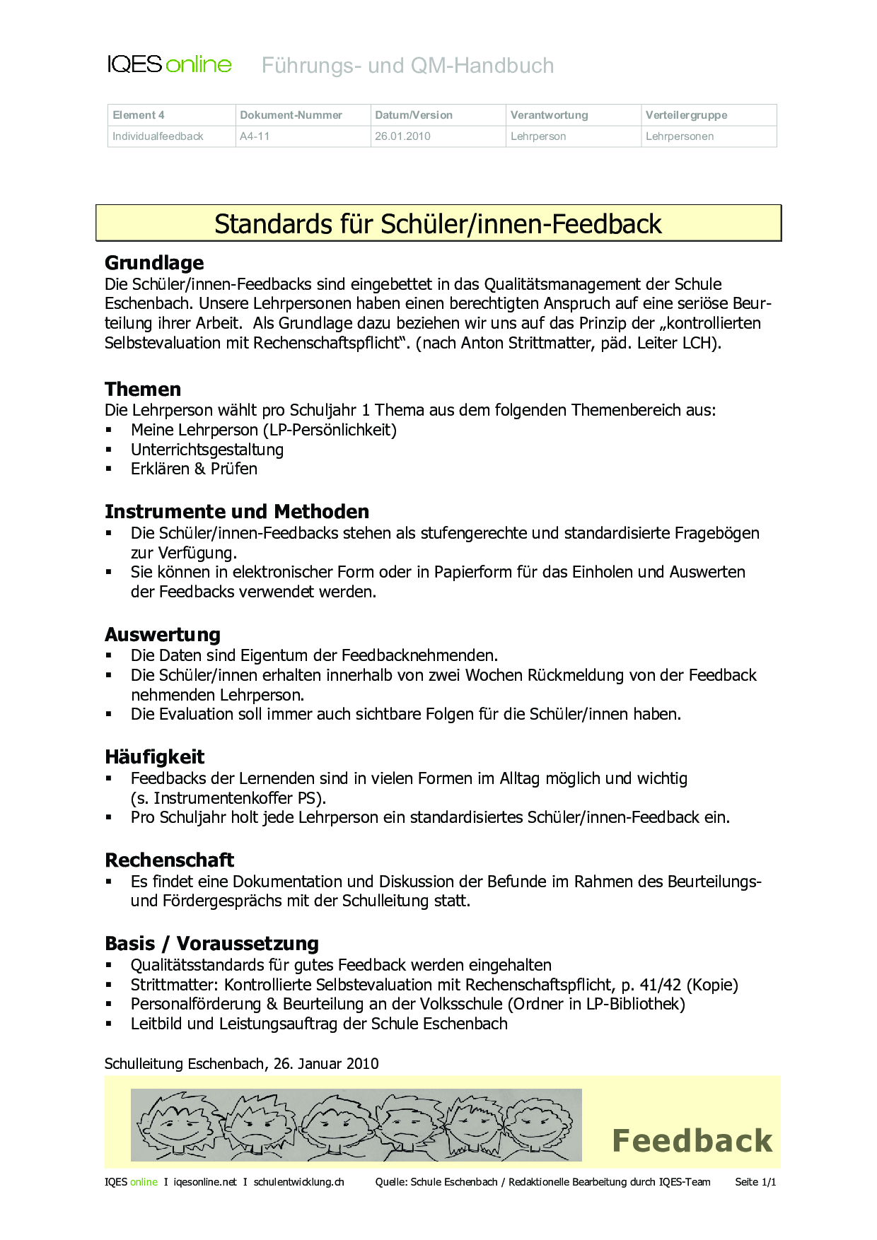 In diesem Dokument werden die Standards für Schüler/innen-Feedback der Schule Eschenbach aufgelistet. Neben den Grundlagen werden Themen, Instrumente und Methoden, Auswertung, Häufigkeit, Rechenschaft sowie Basis/Voraussetzung geklärt.